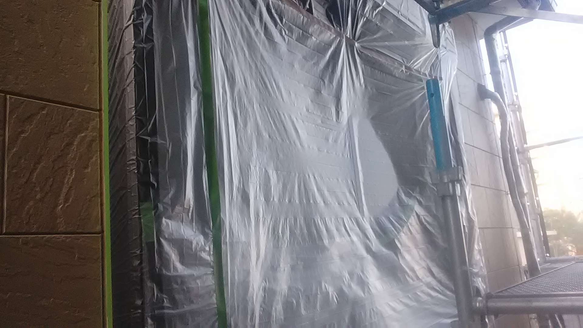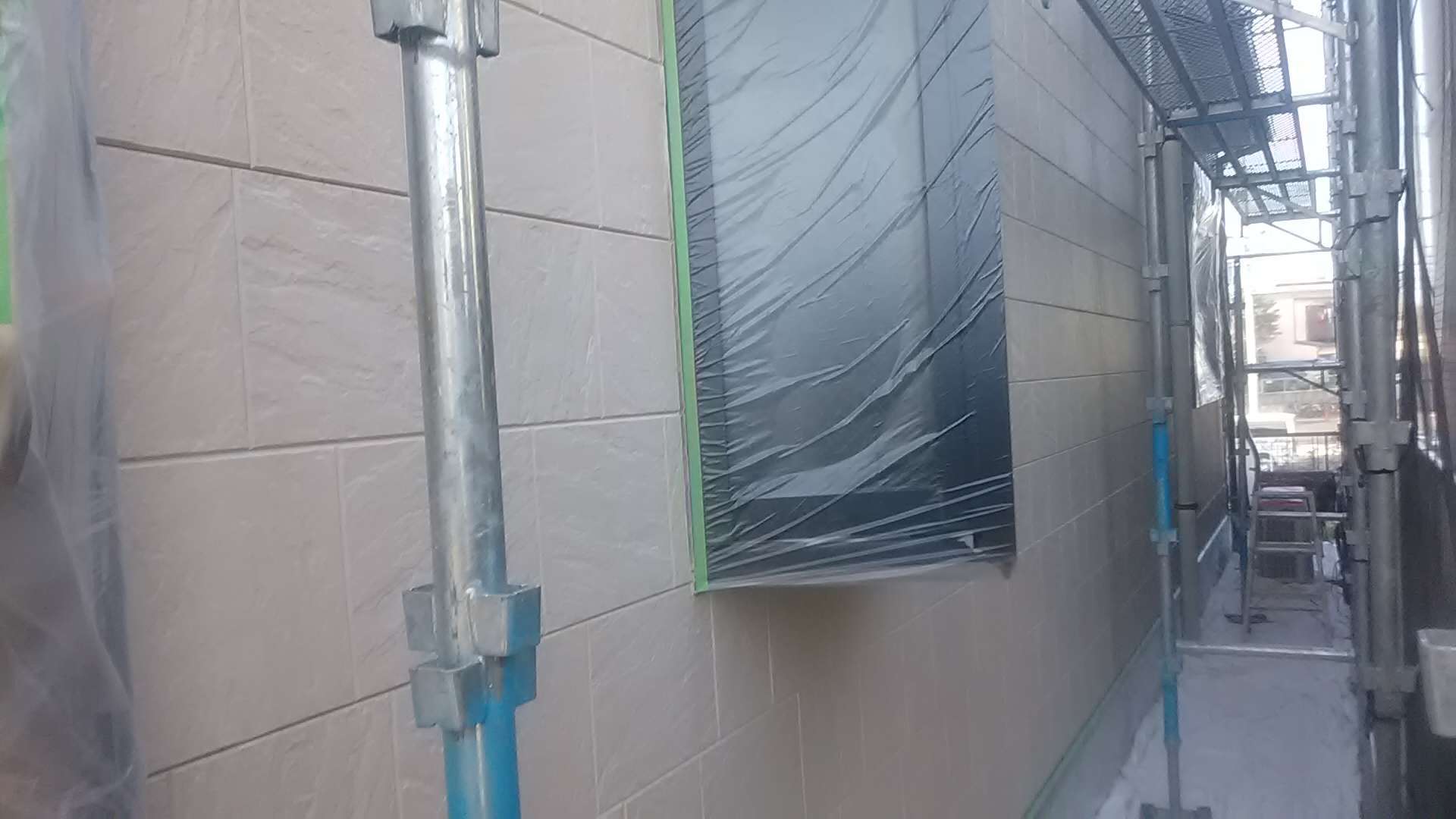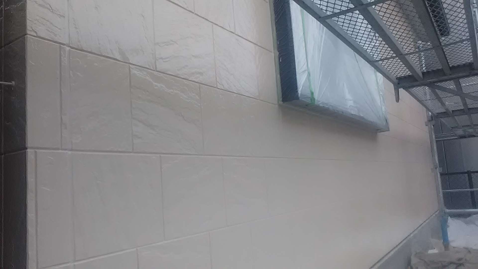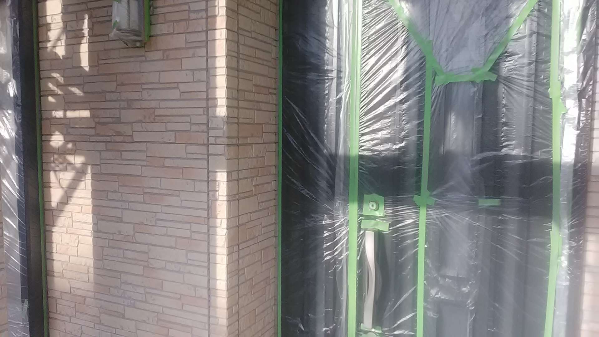 昨日までの作業で、養生作業・外壁の下塗り作業・軒天塗装作業・クリヤー部下塗り塗装・クリヤー一回目塗装作業・中塗り作業塗装作業が完了しています!