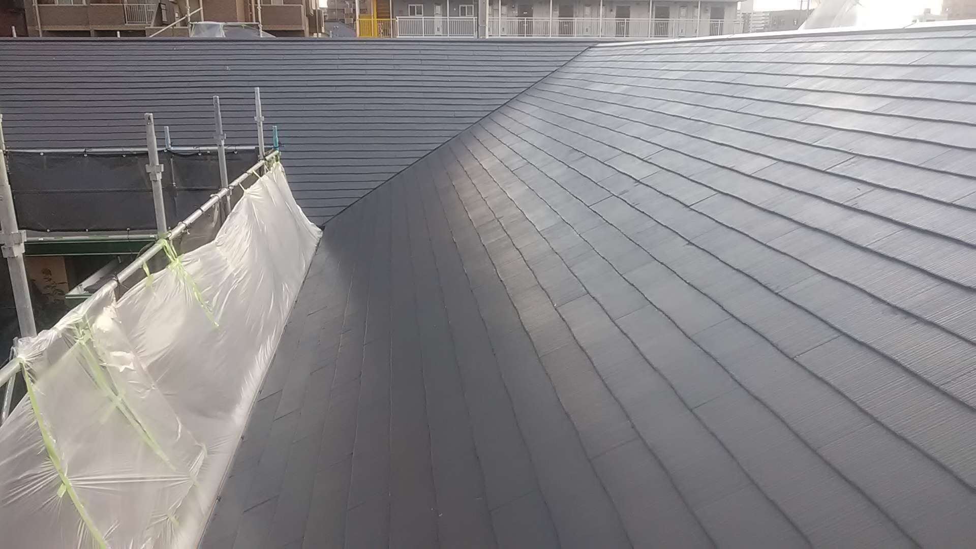 今日の作業は、屋根上塗り作業の予定です。