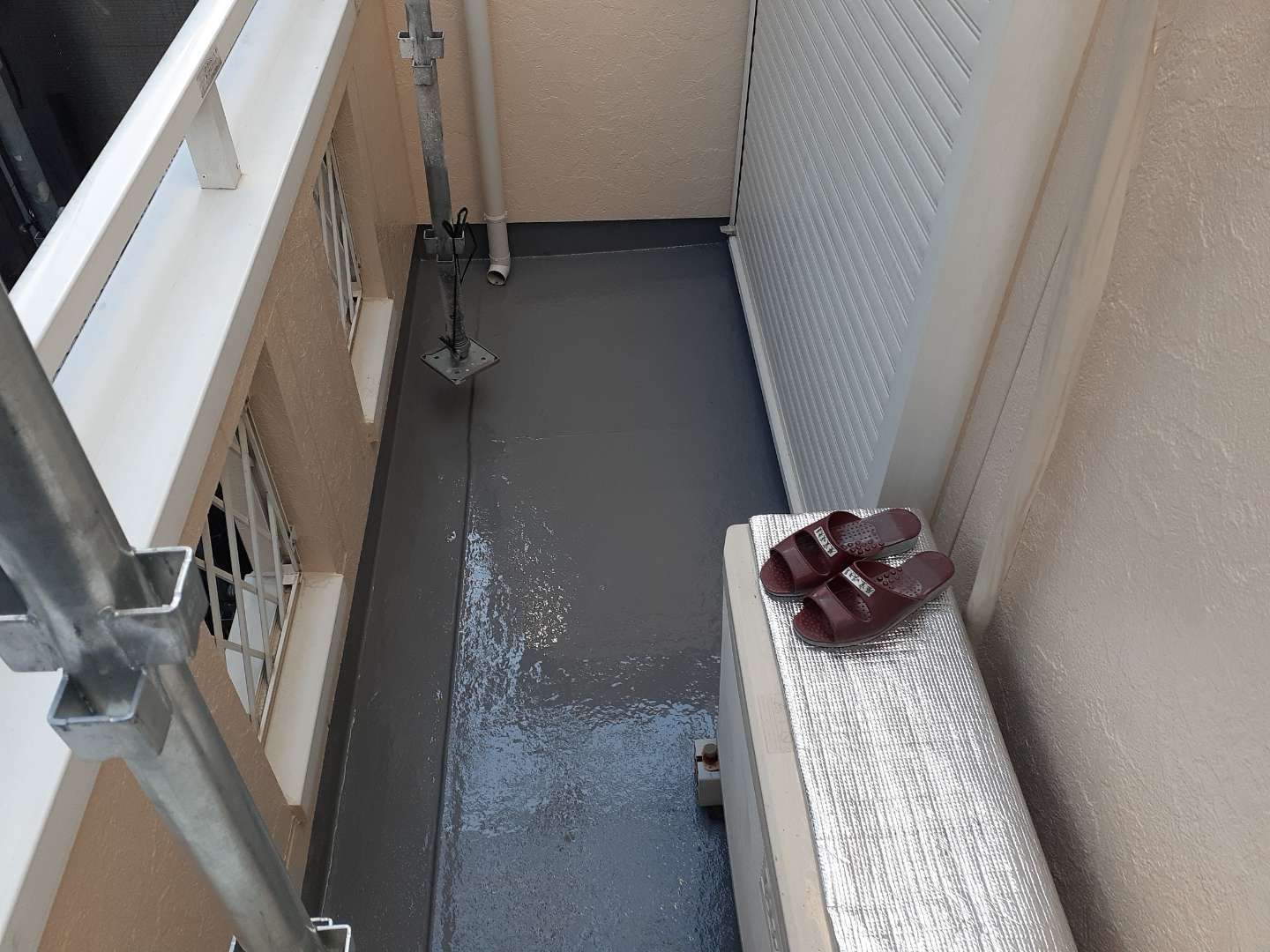昨日までの作業で、コーキング打ち替え・増し打ち作業と付帯部塗装作業とベランダの防水作業が完了しました。