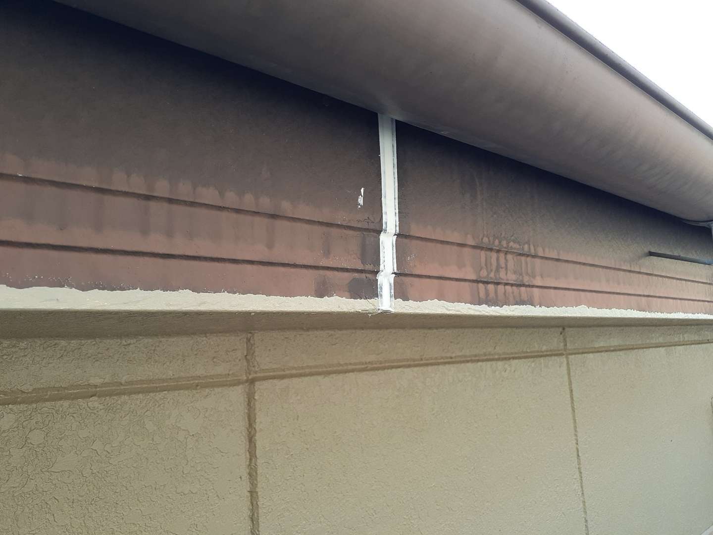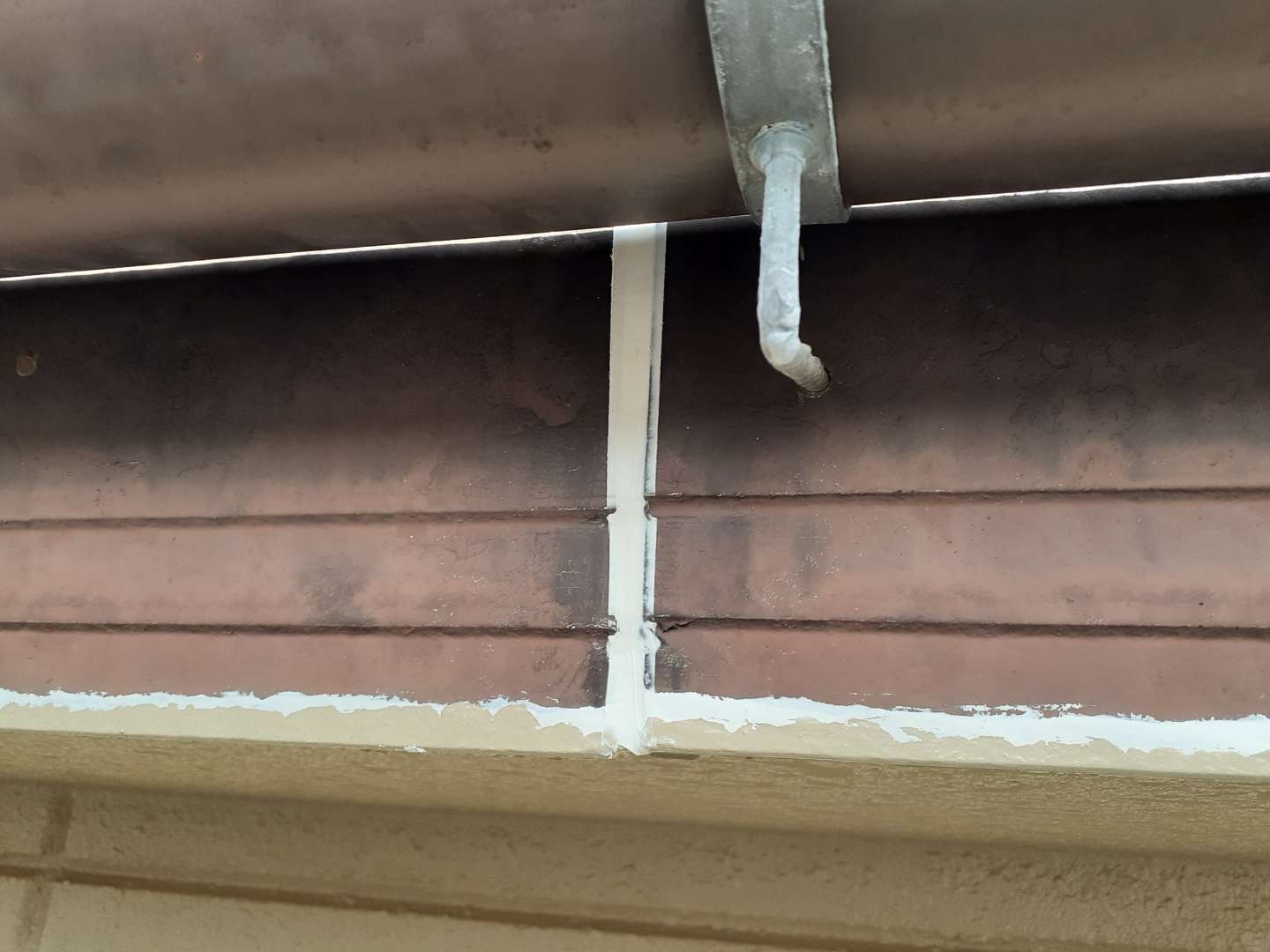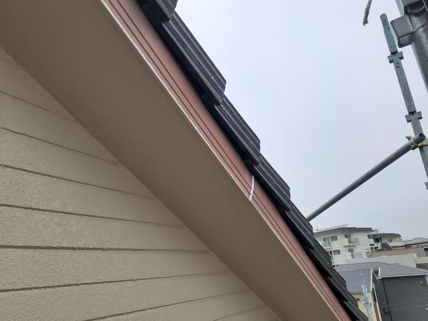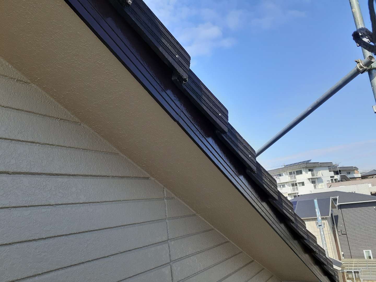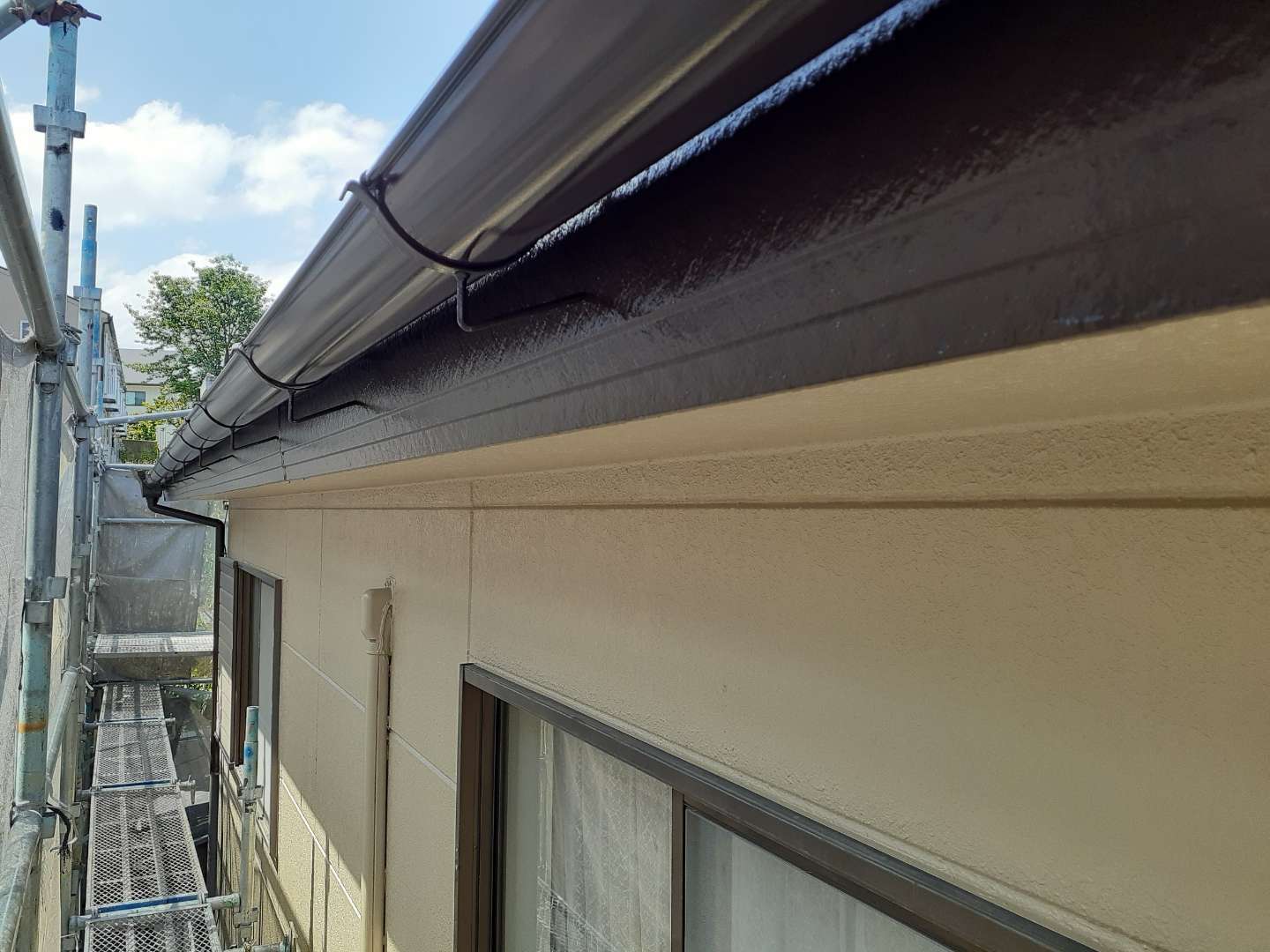 昨日までの作業は、外壁の上塗り塗装・軒天塗装・破風板コーキング・付帯部塗装作業でした。