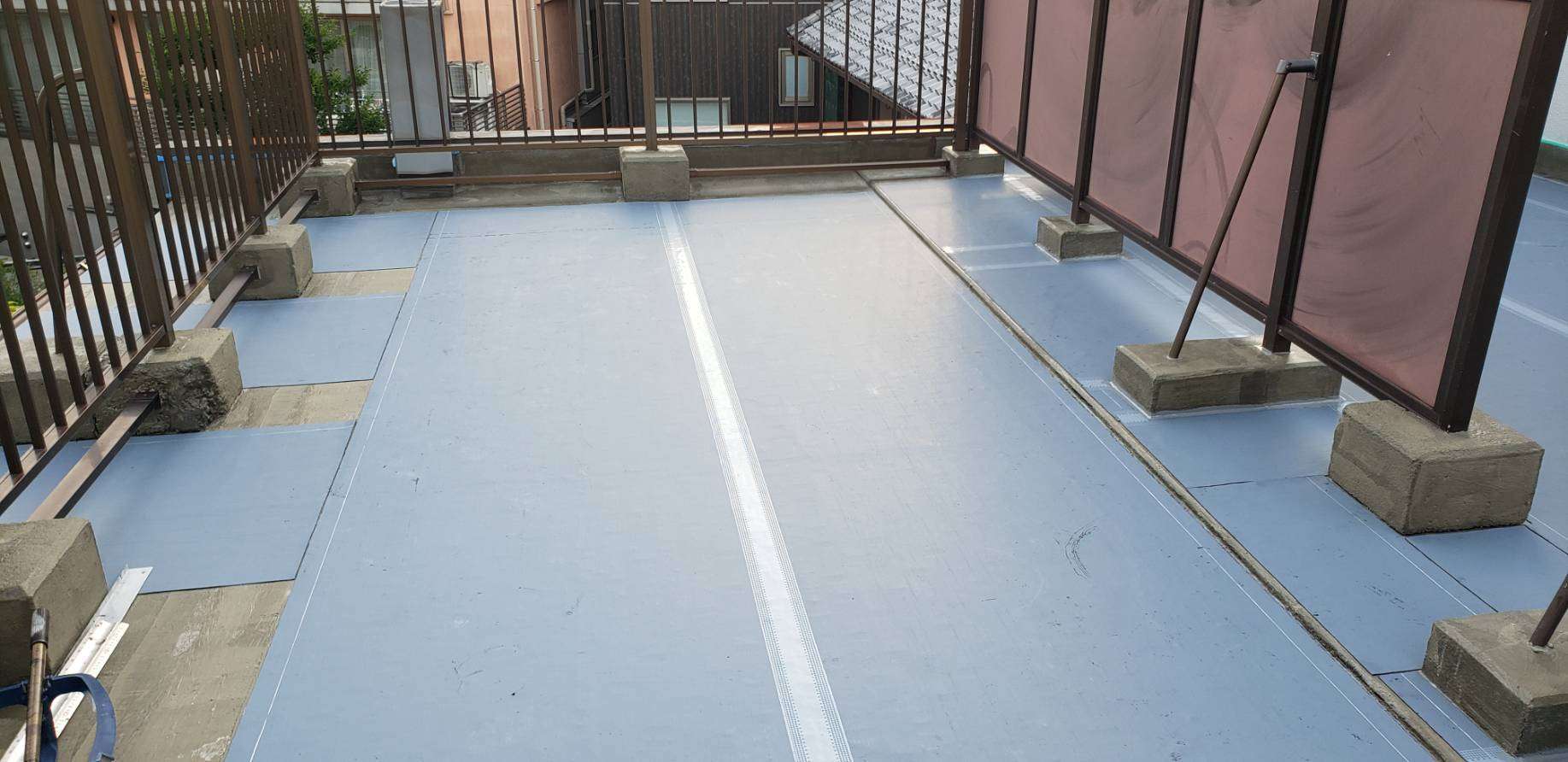 昨日までの作業は、ベランダ内の通気緩衝シート貼り作業が完了しています。