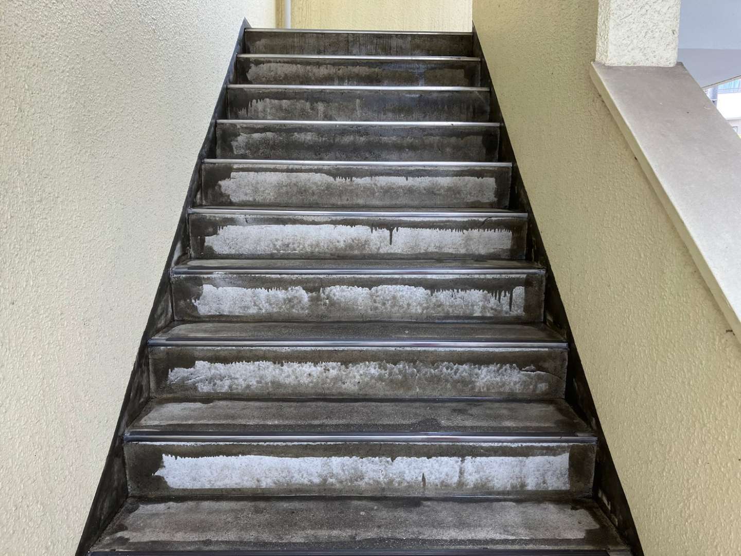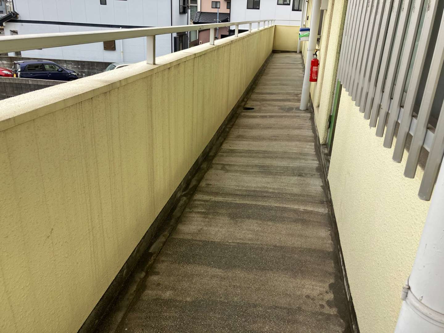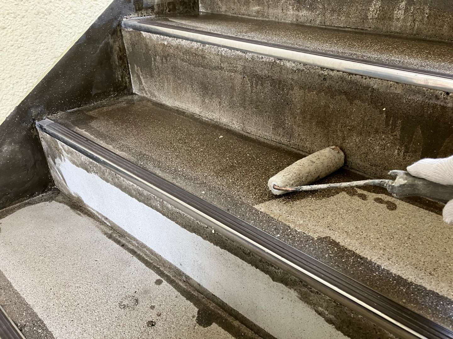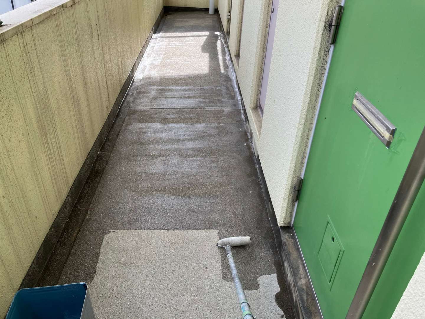 昨日の作業は、階段、通路、ベランダのプライマー塗装作業と通路のトップ一回目塗装作業でした。