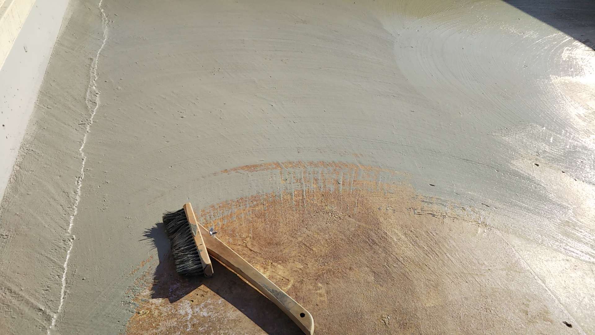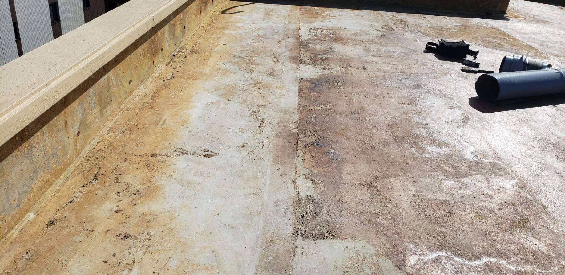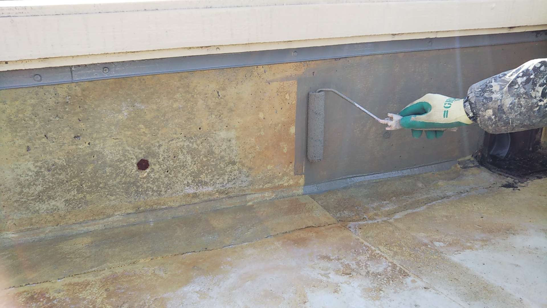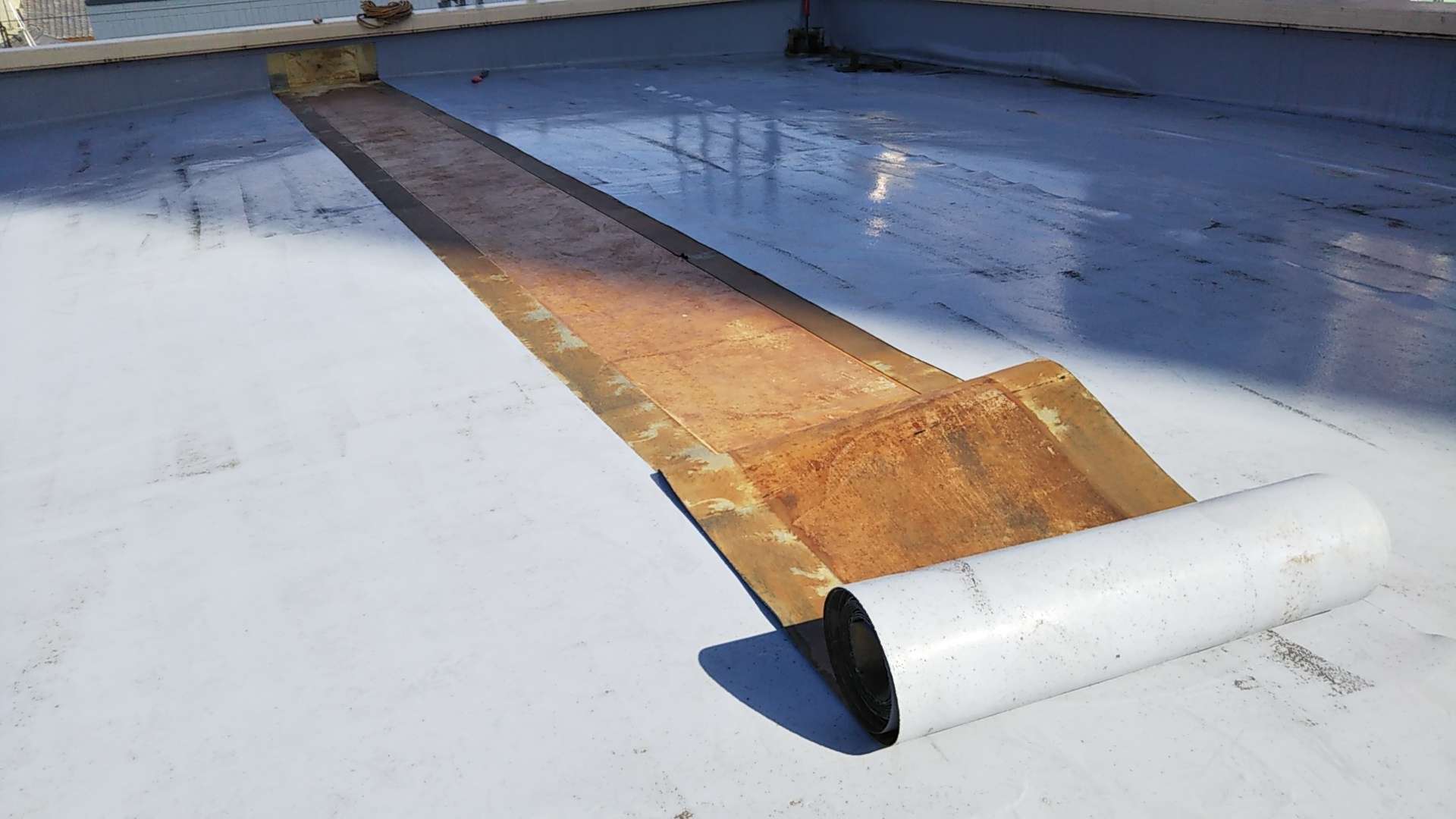 既存の防水シートに膨れや亀裂があった為、シートを剝がしてウレタン通気緩衝工法にて施工させて頂きます。