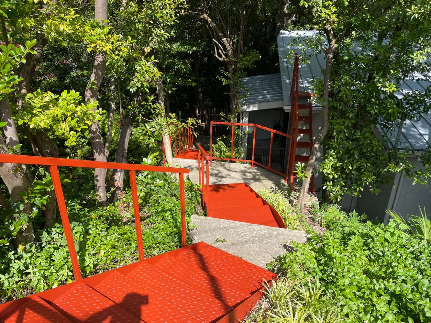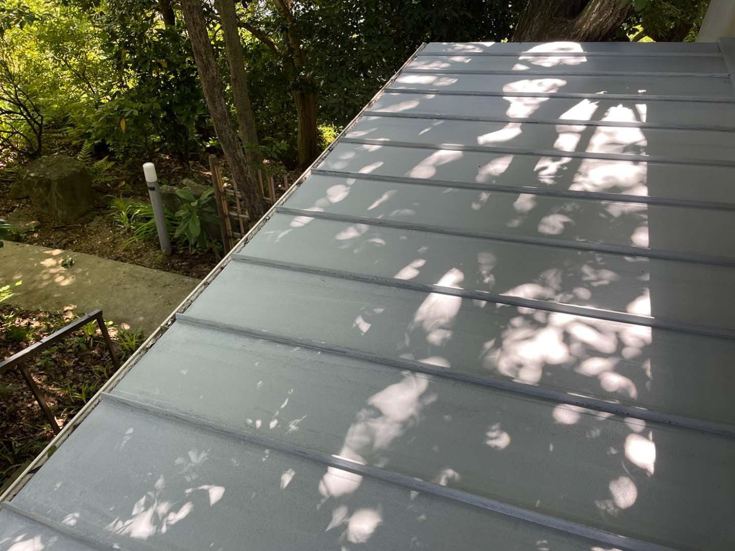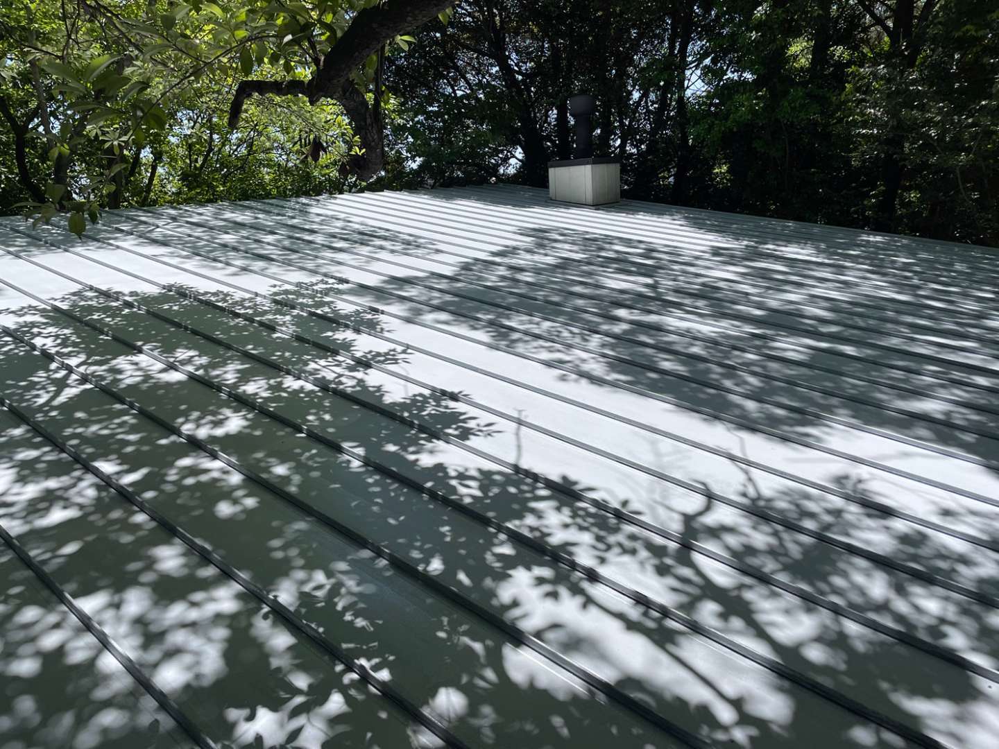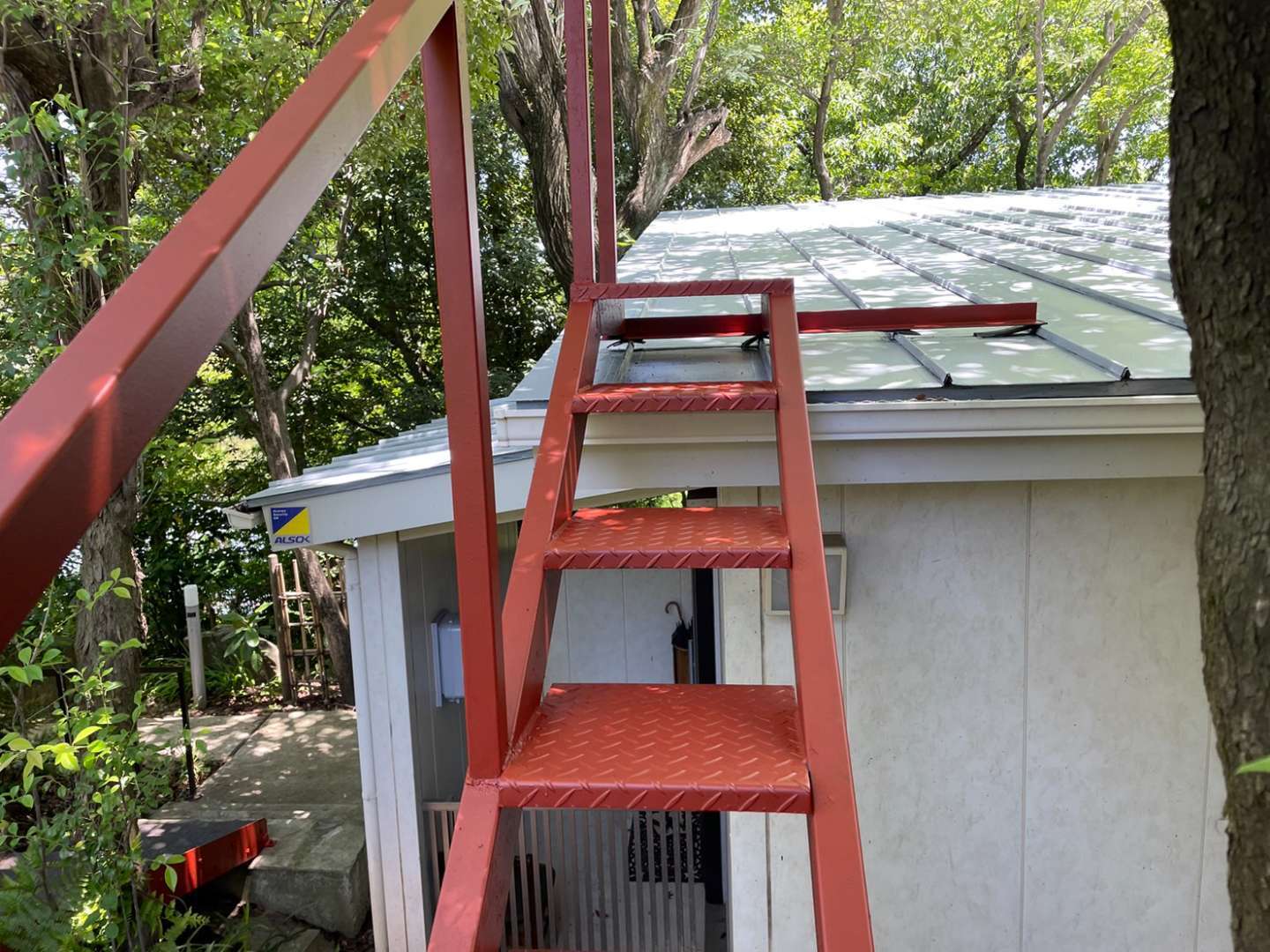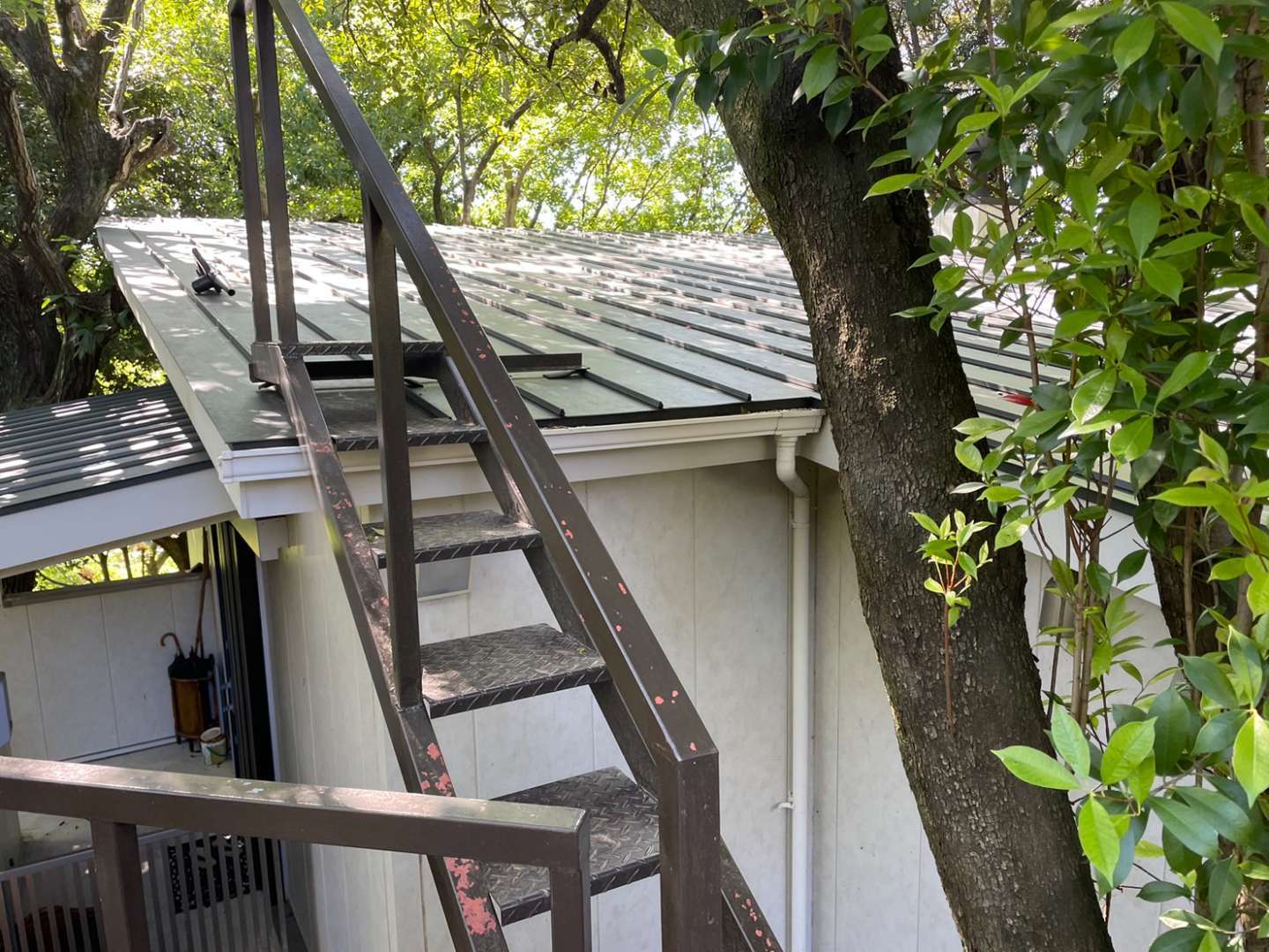 今日の作業は、金属屋根のウレタン一層目塗装作業と鉄骨階段の上塗り一回目塗装作業予定です。