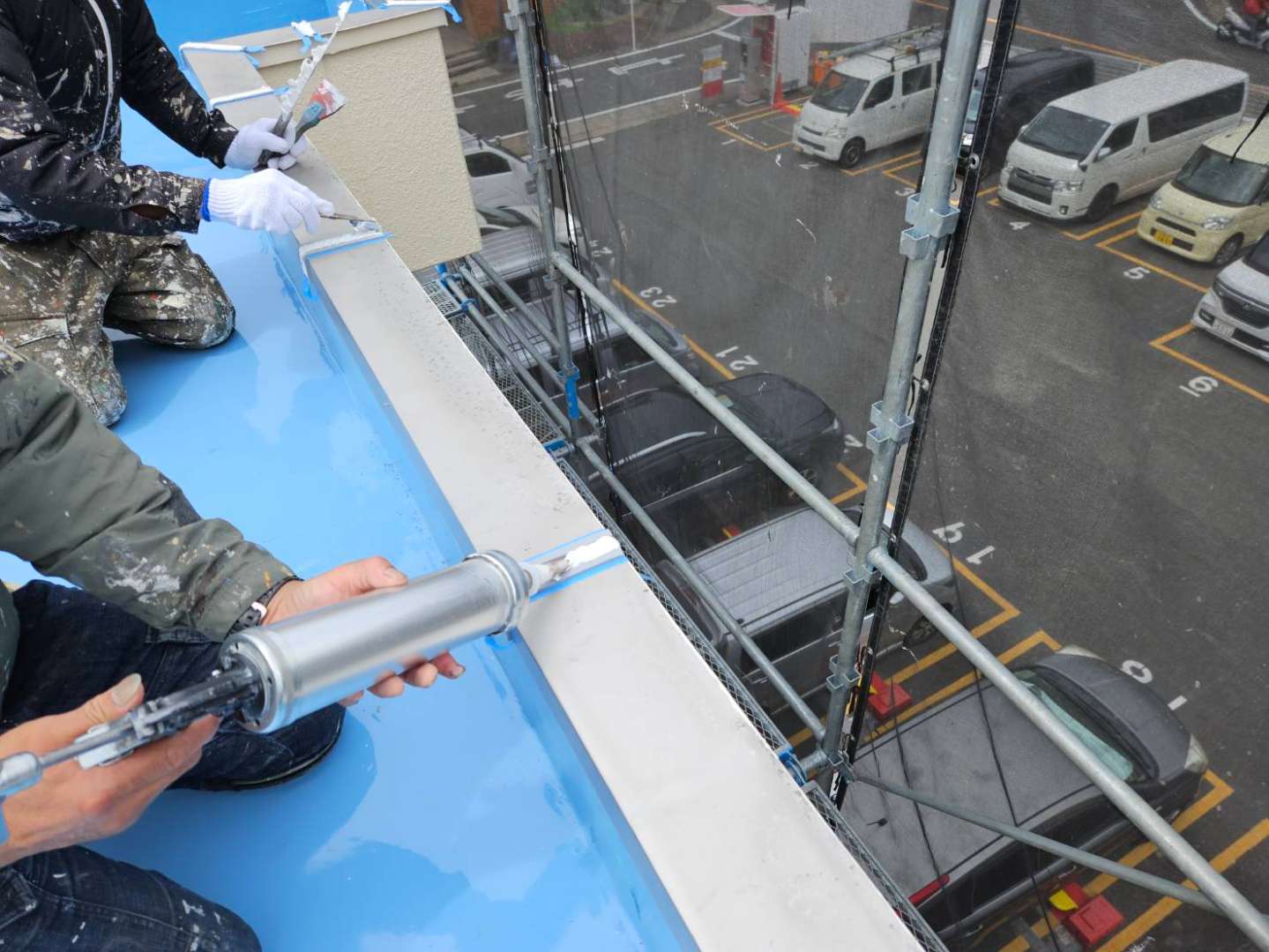 屋上とベランダの笠木のコーキング作業と屋上ウレタンのウレタン二層目塗装作業でした!