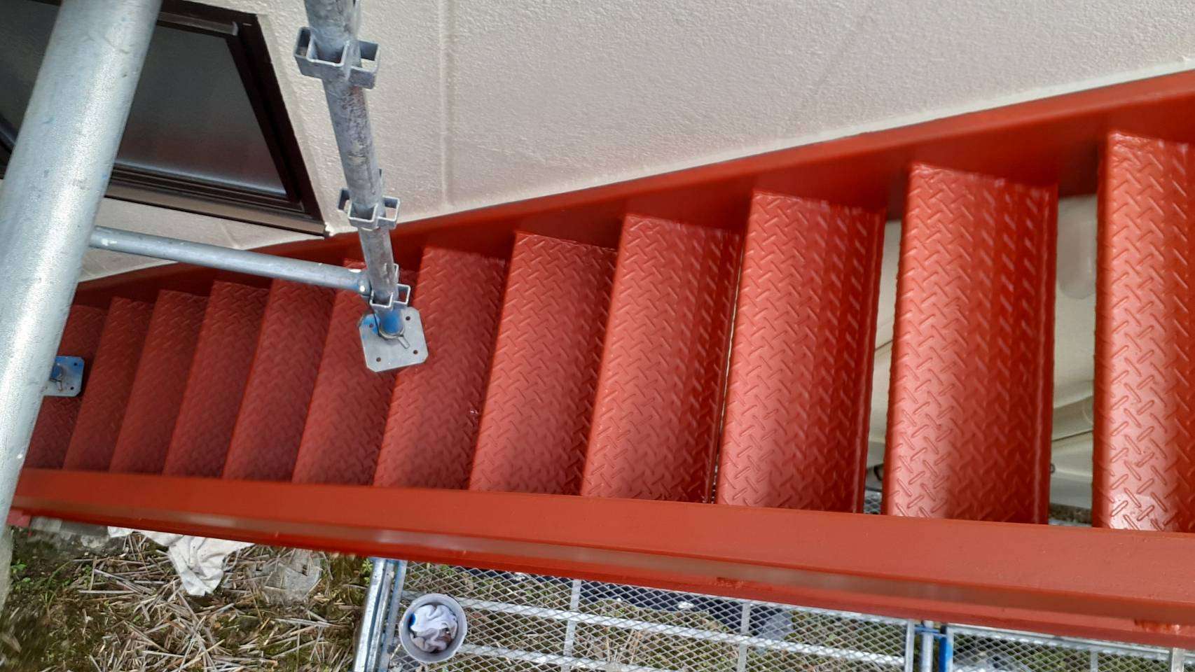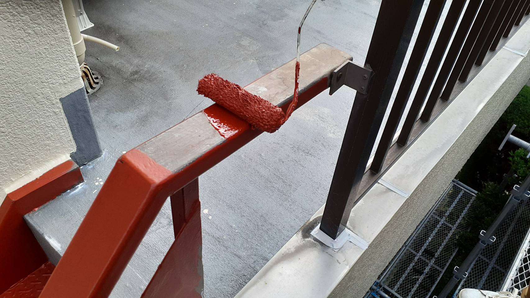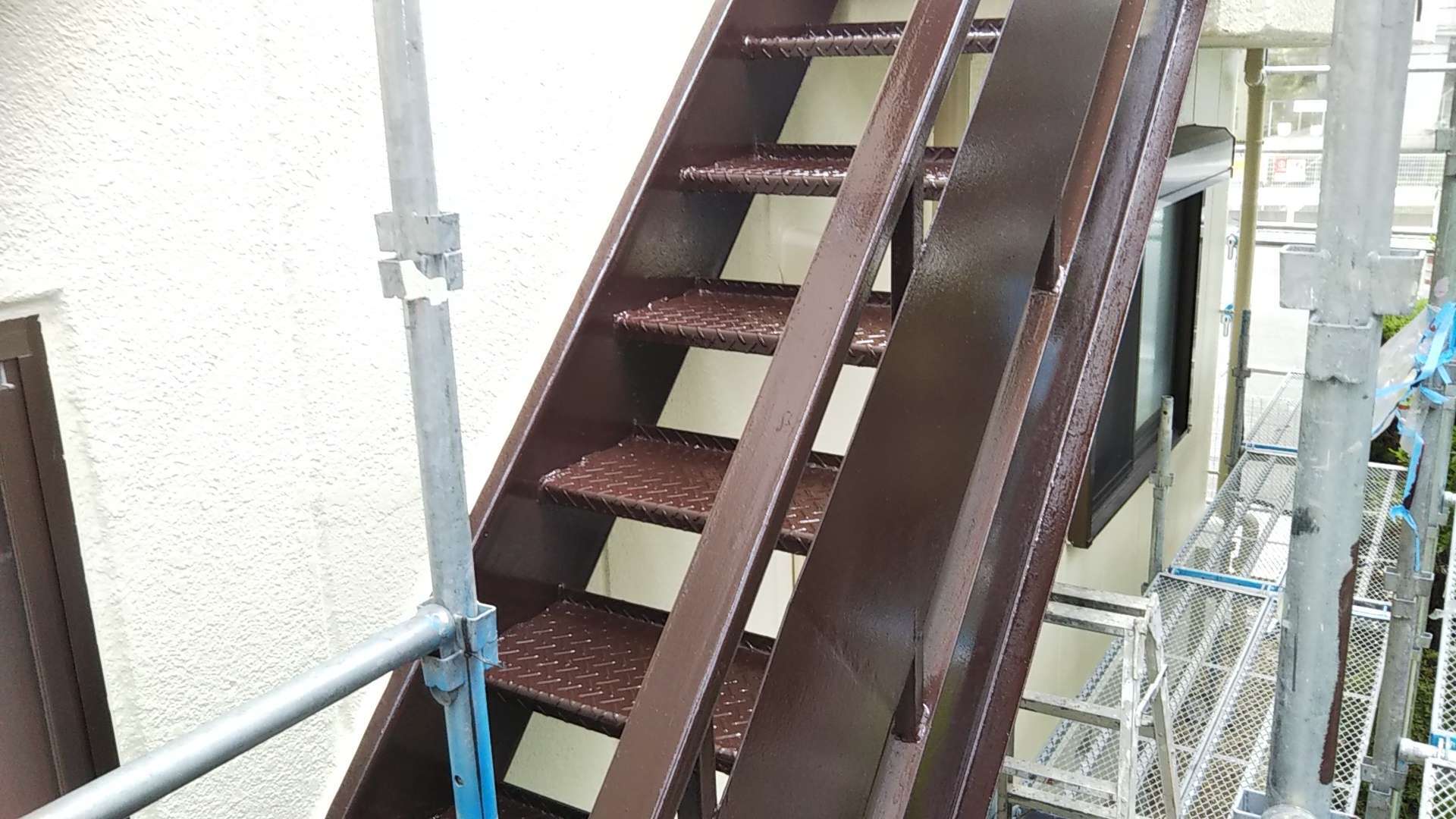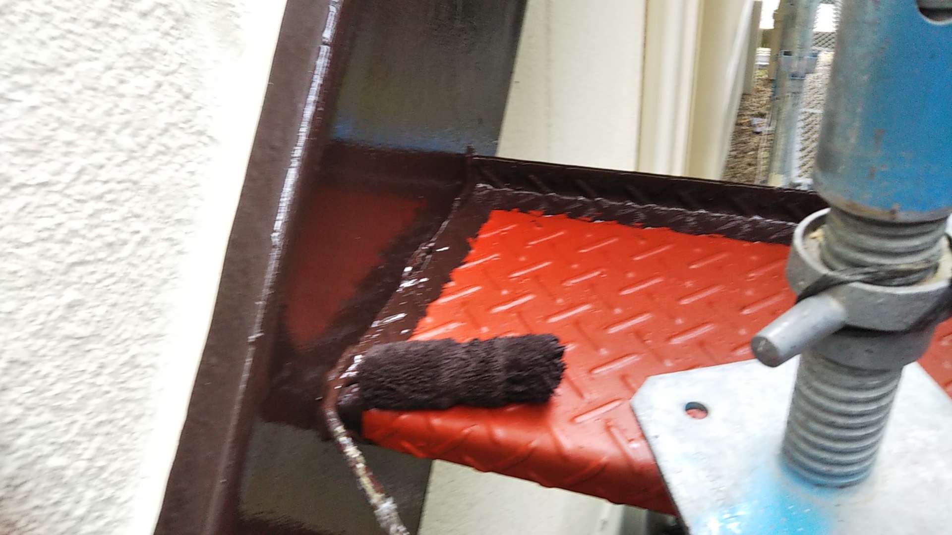昨日までの作業内容は、基礎の上塗り塗装・鉄部階段の錆止め、上塗り塗装・