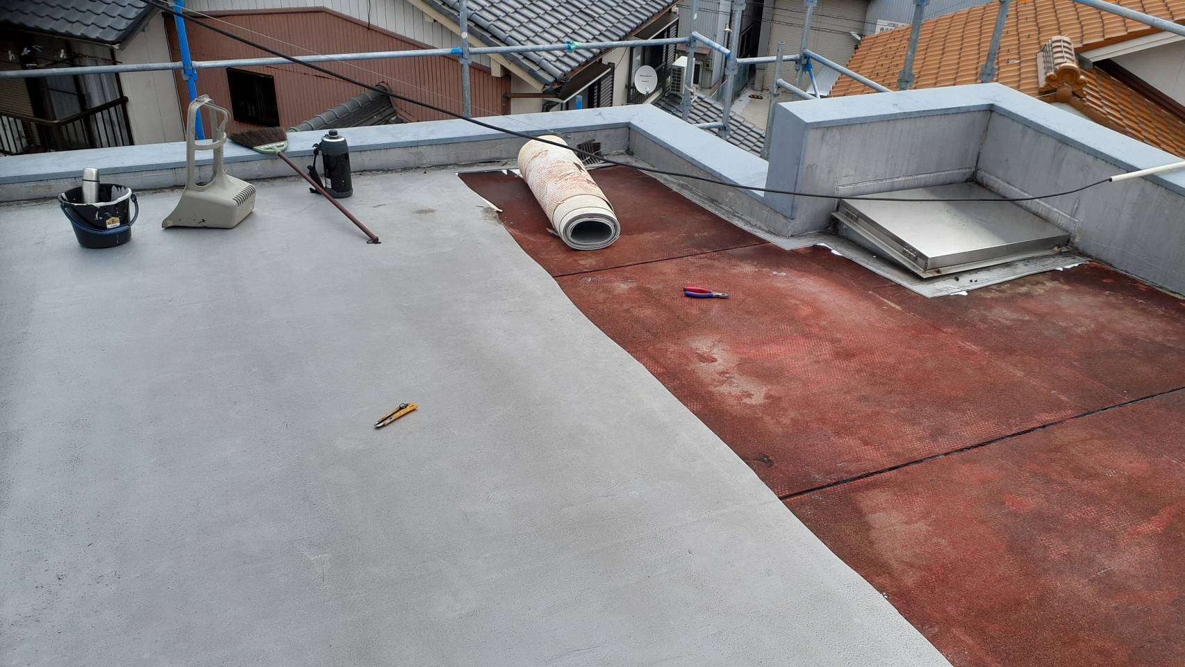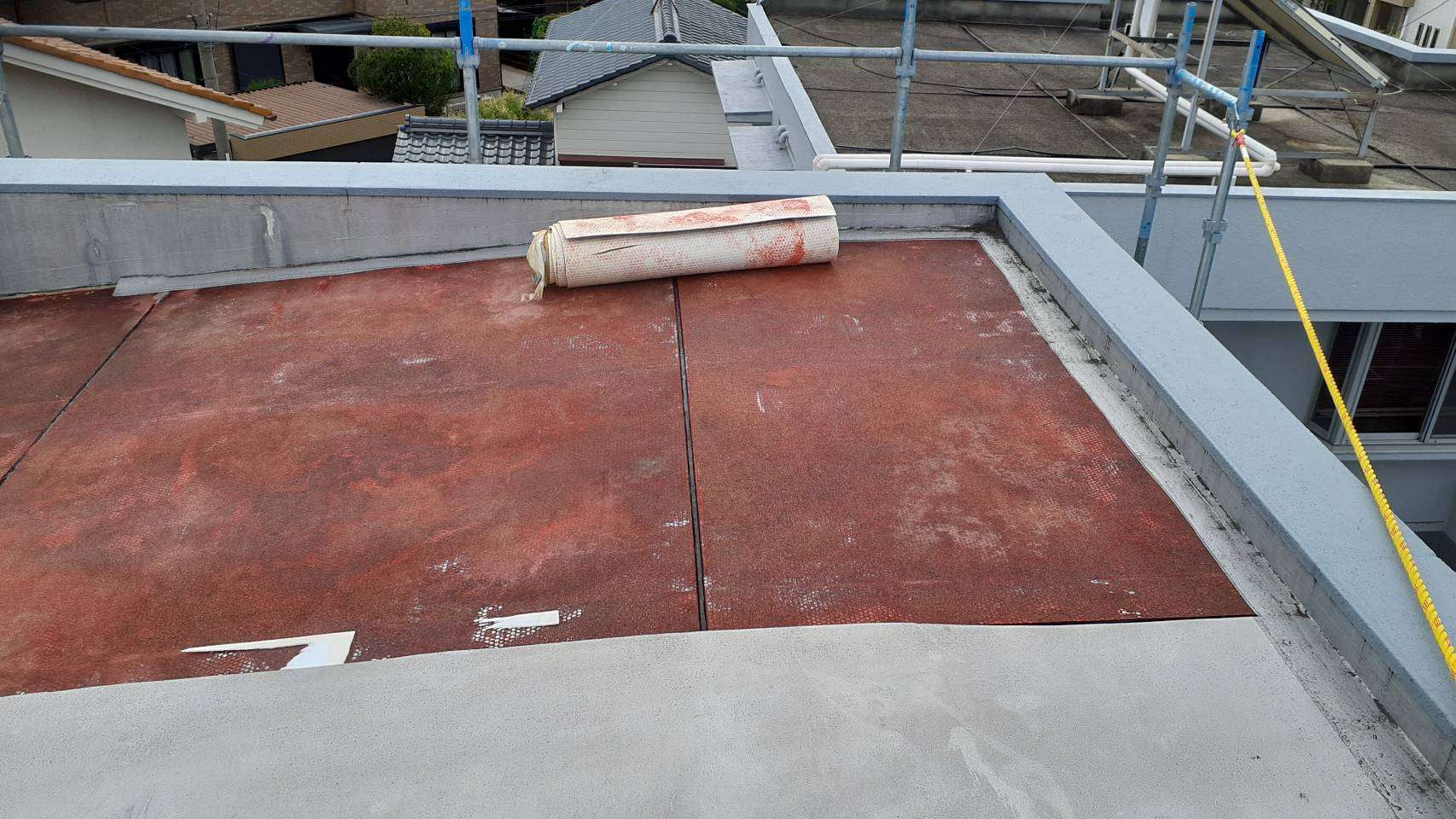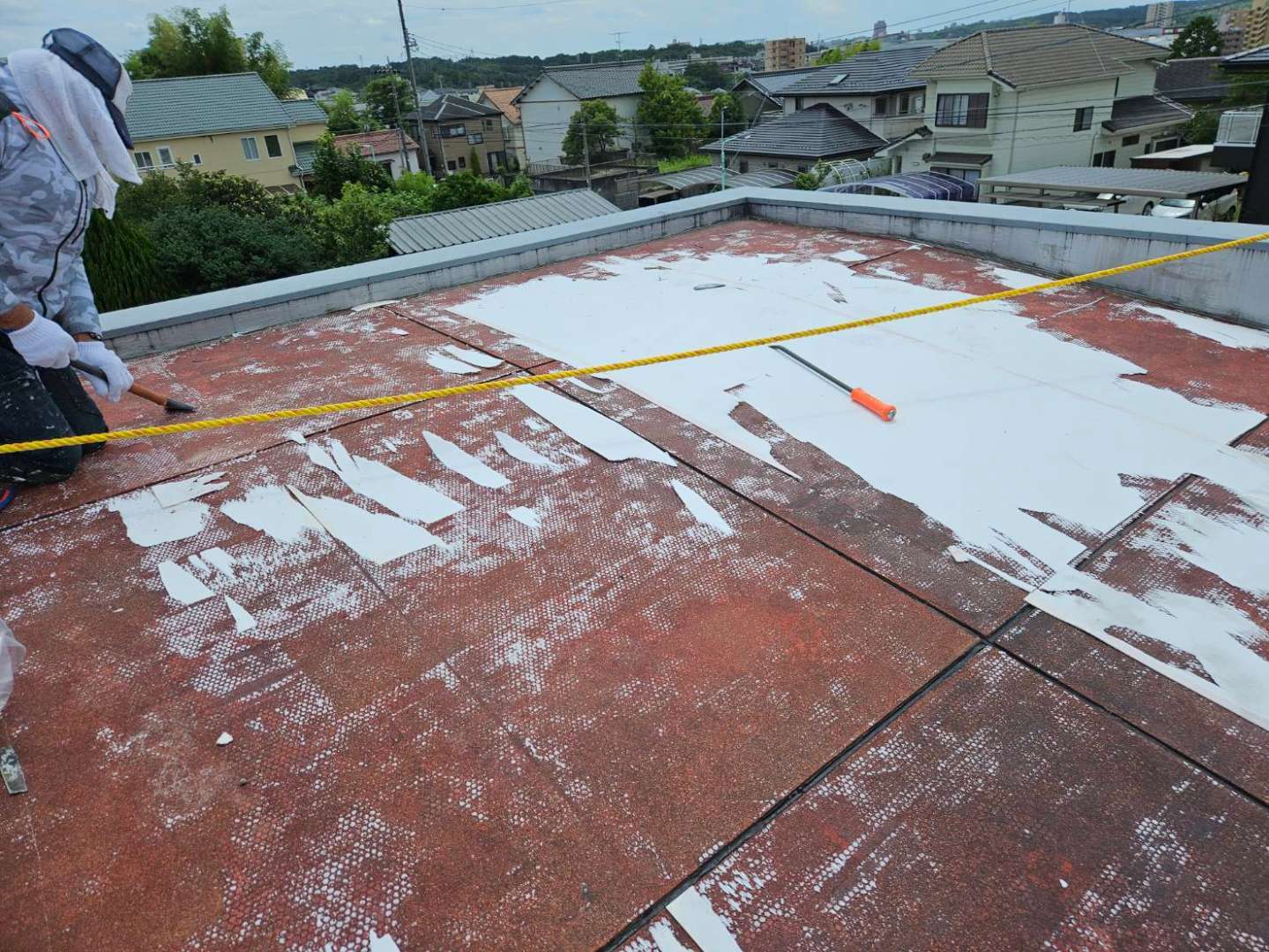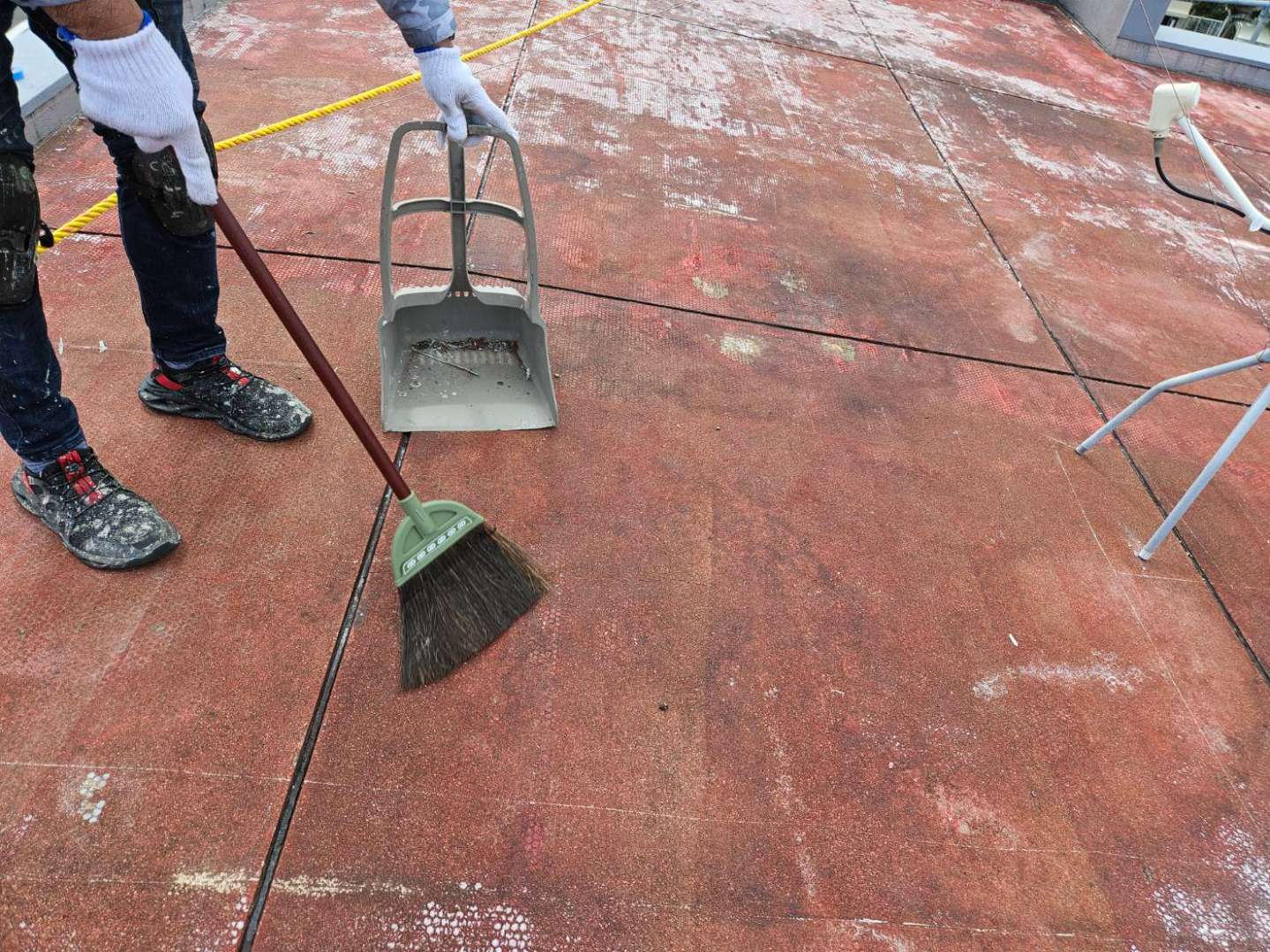 K様邸の昨日の作業内容は、屋上の既存シート撤去作業と下地処理作業でした。