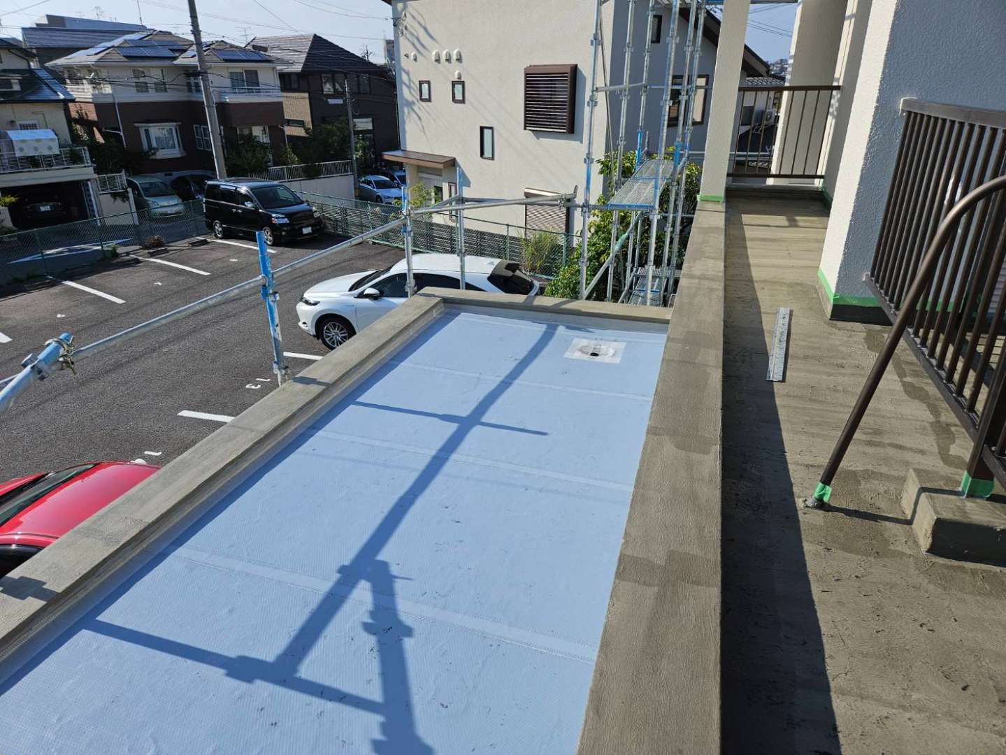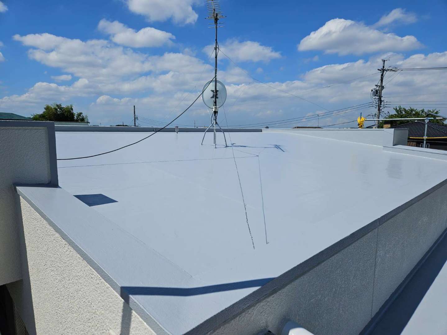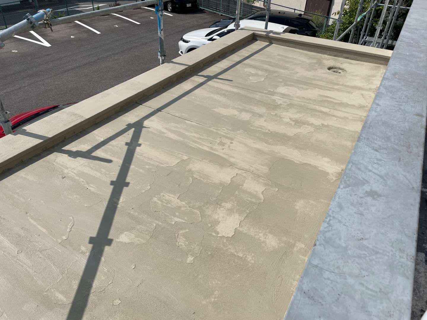 昨日までの作業内容は、屋上のトップコート塗装作業とベランダ(バルコニー)のケレン作業と下地処理作業・プライマー塗装作業と玄関上の通気シート貼り・脱気筒取り付け作業でした!