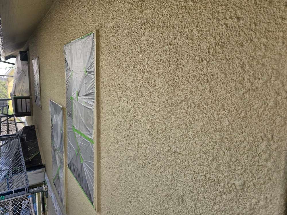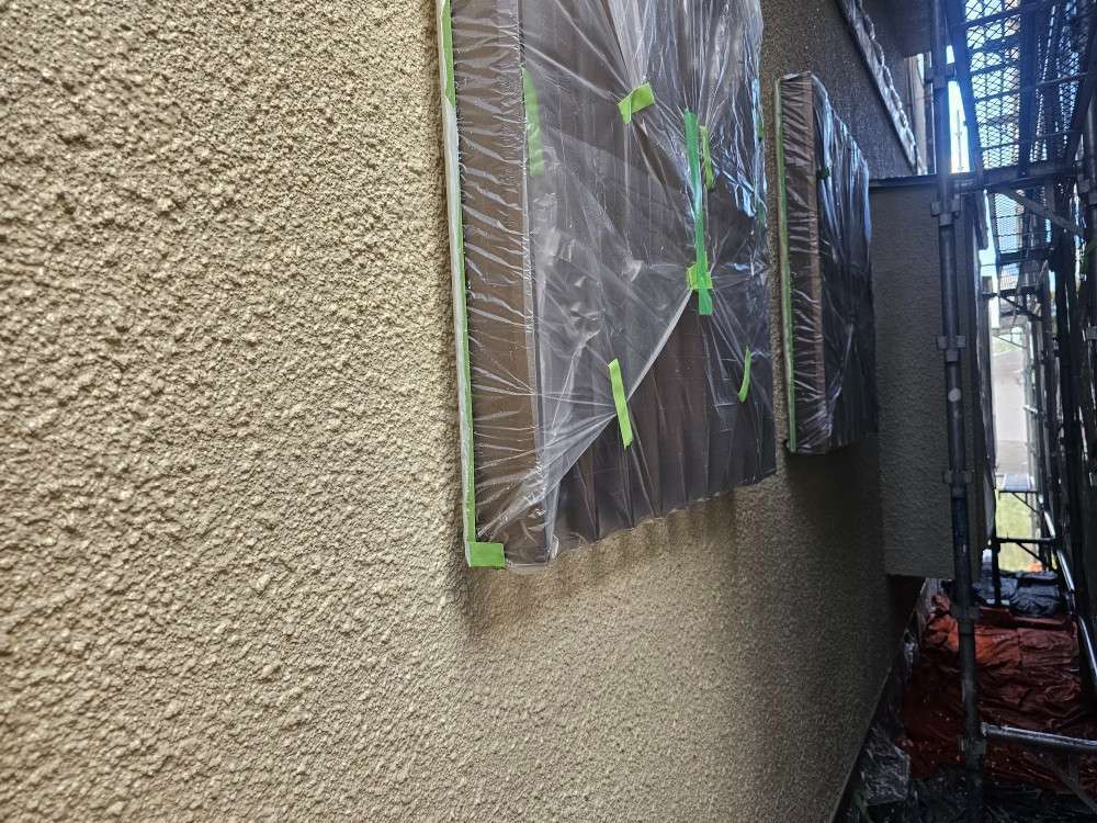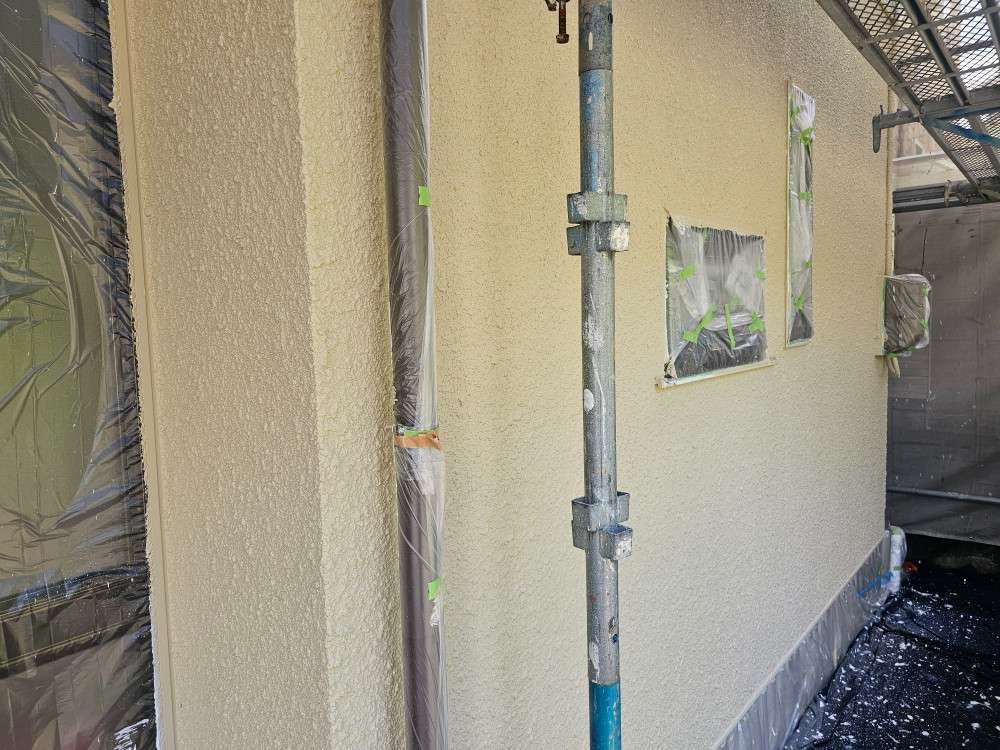 今日の作業は、引き続き外壁の上塗り塗装作業予定です。