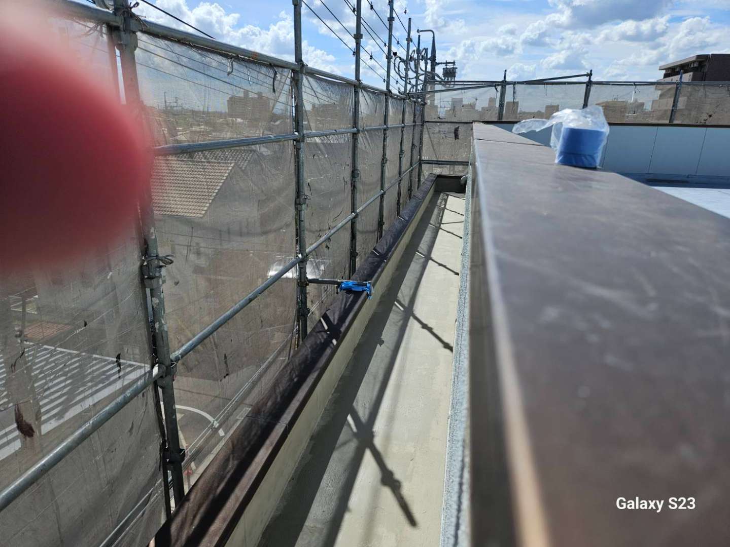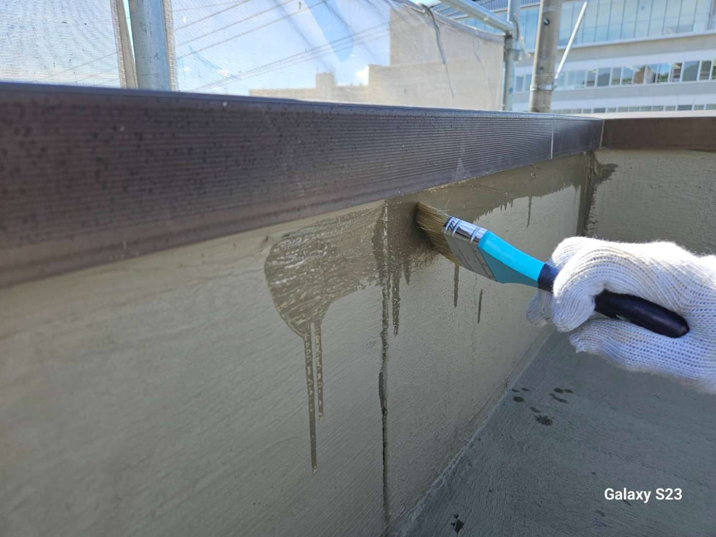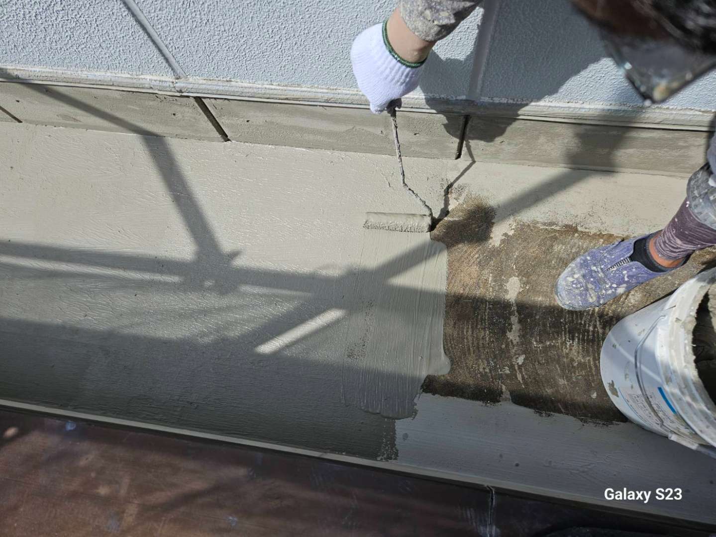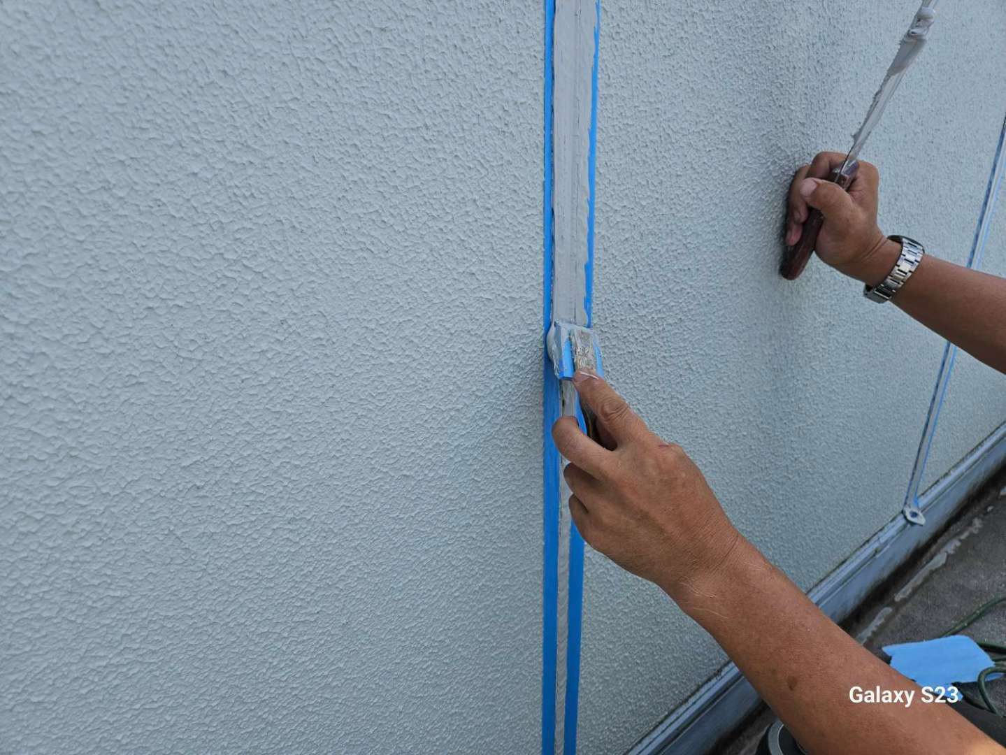 瀬戸市、H様邸の昨日の作業内容は、コーキング打ち替え作業とペントハウス部分のプライマー塗装作業と屋上下部分のシート撤去作業、ケレン作業、下地処理作業、プライマー塗装作業でした。
