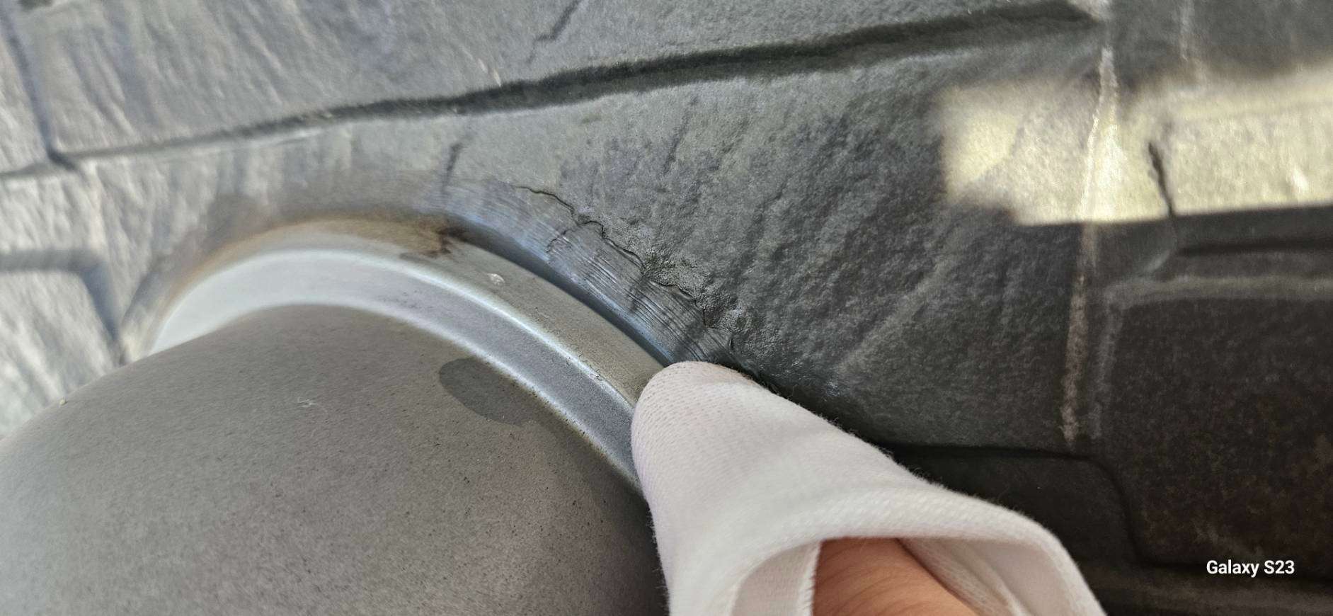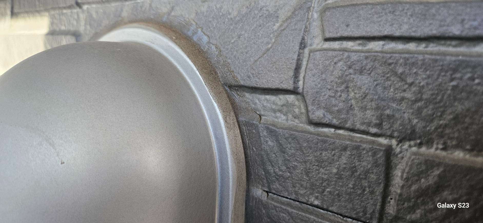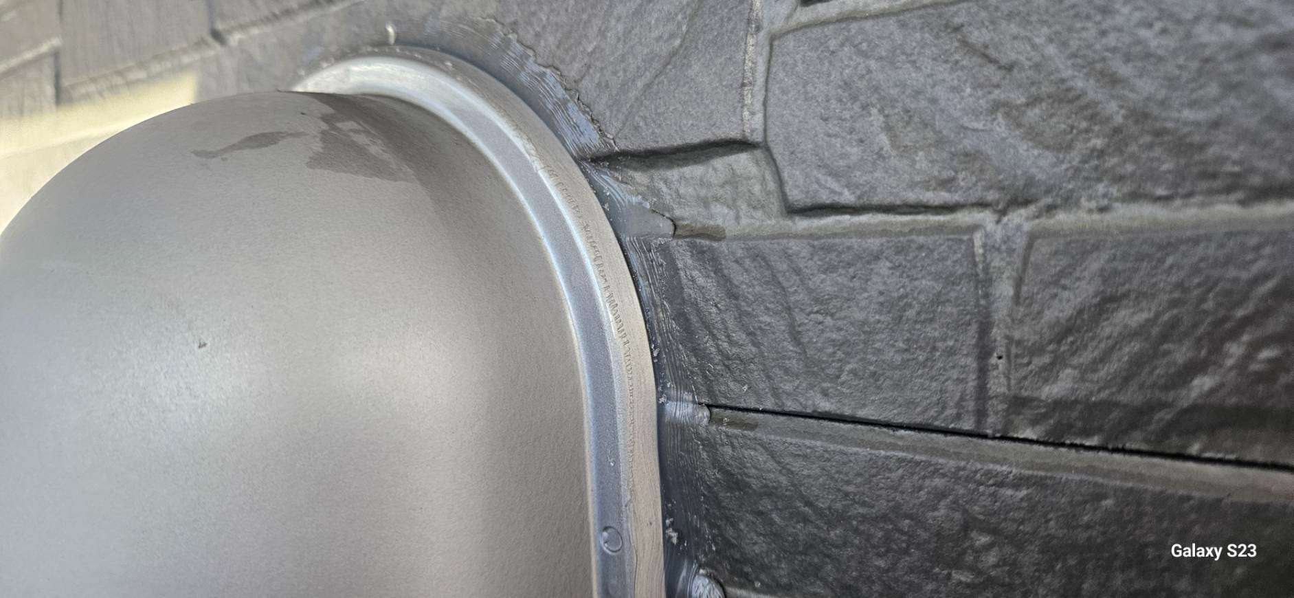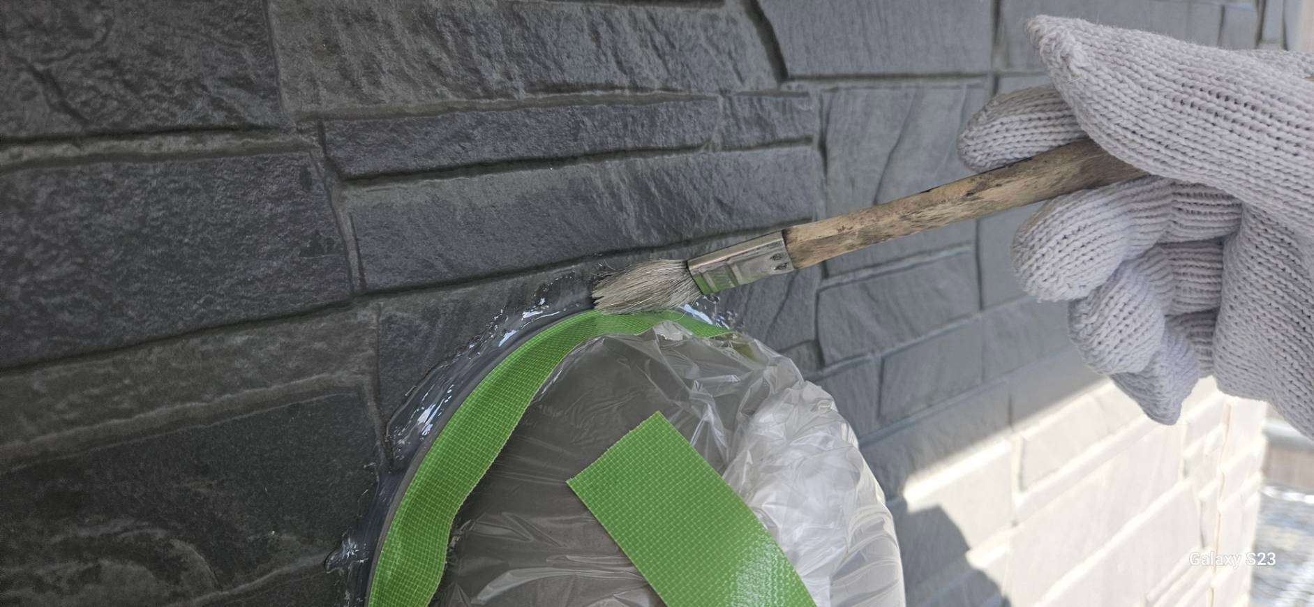 換気口まわりのクリヤーコーキング部は、塗料用シンナーで拭いてから養生し逆プライマー塗布しています。