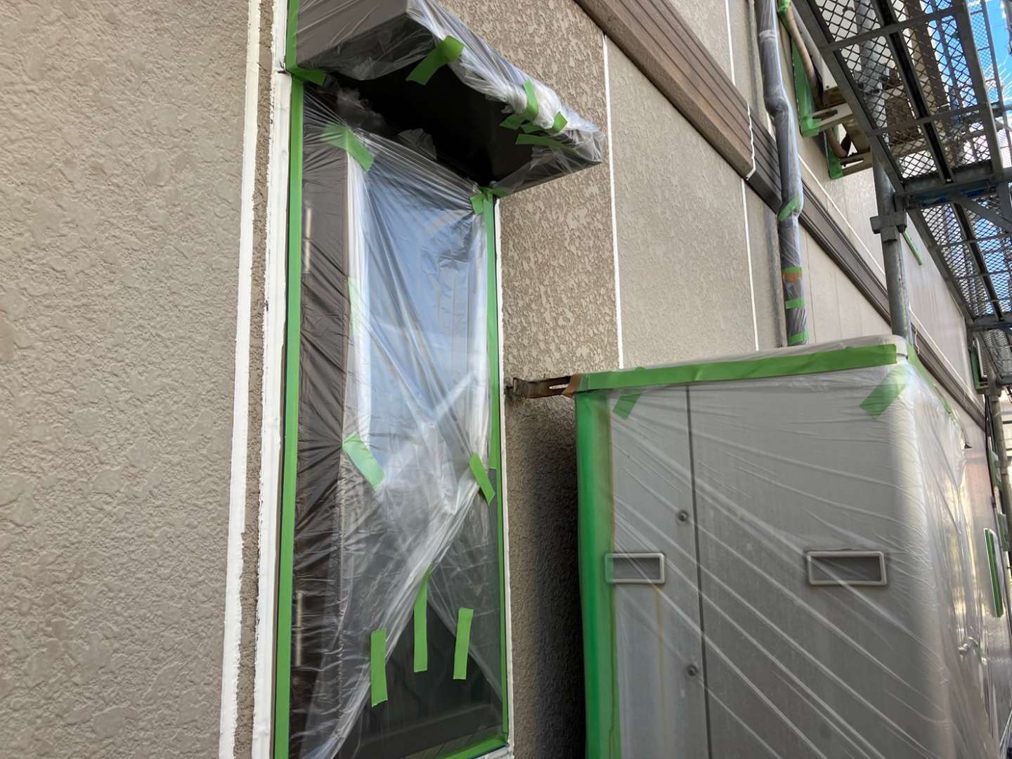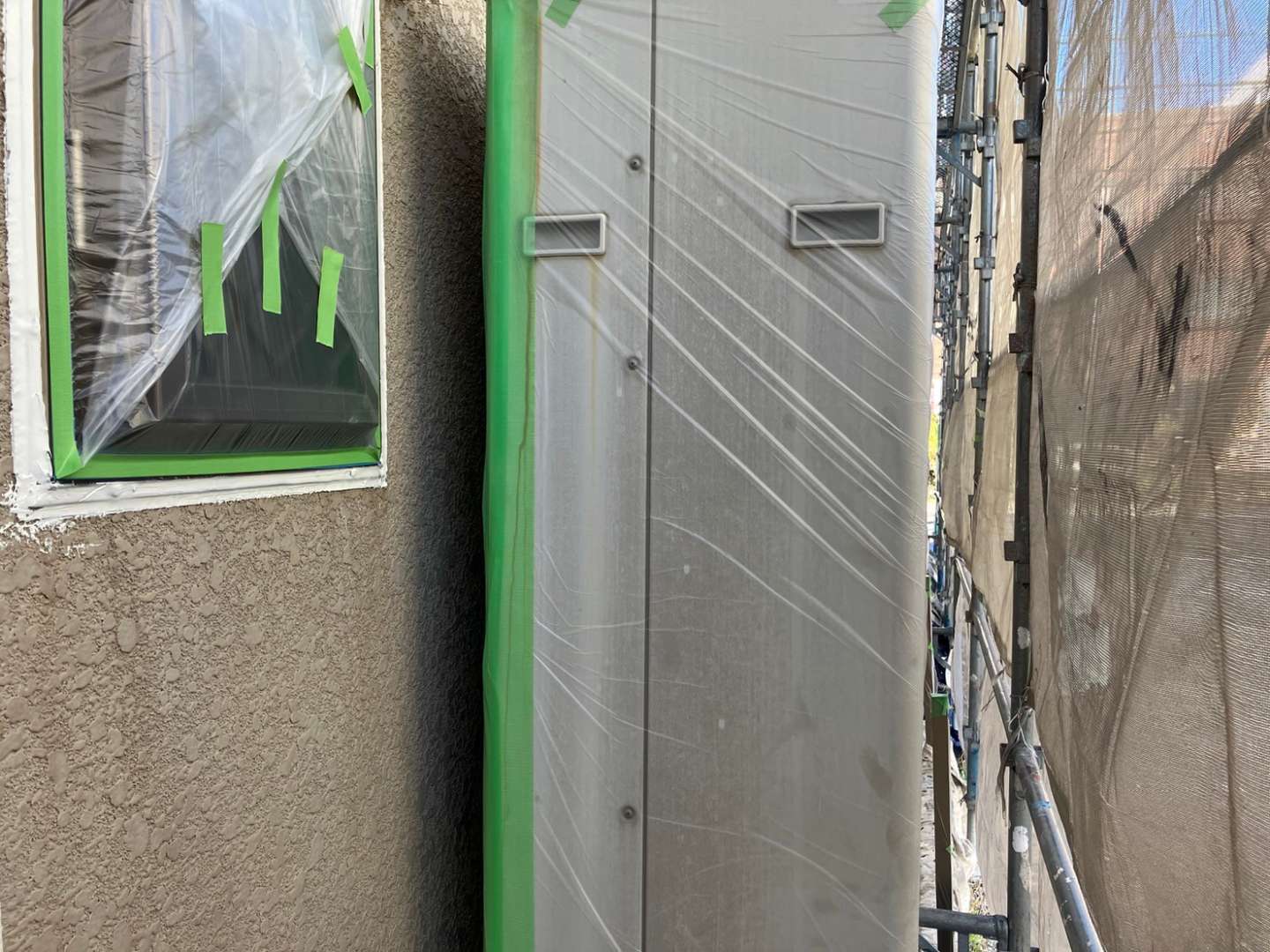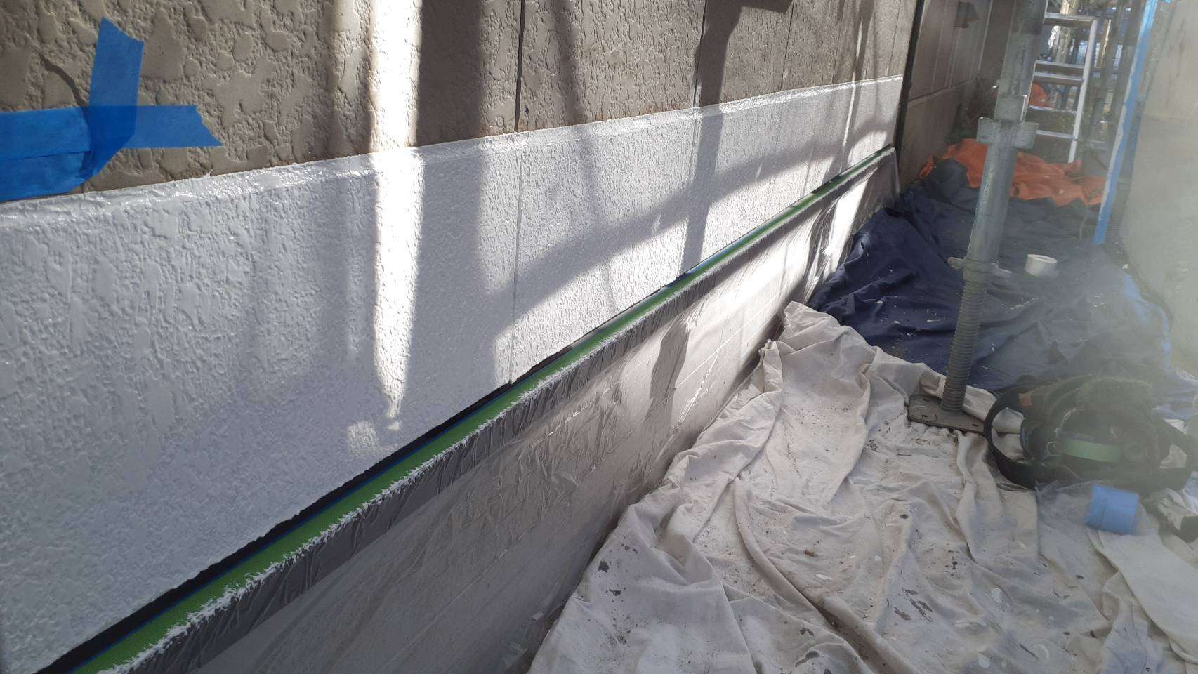養生作業・外壁補修部の下塗り(柄付け)作業・パラペット部リベット打ち作業を行いました。