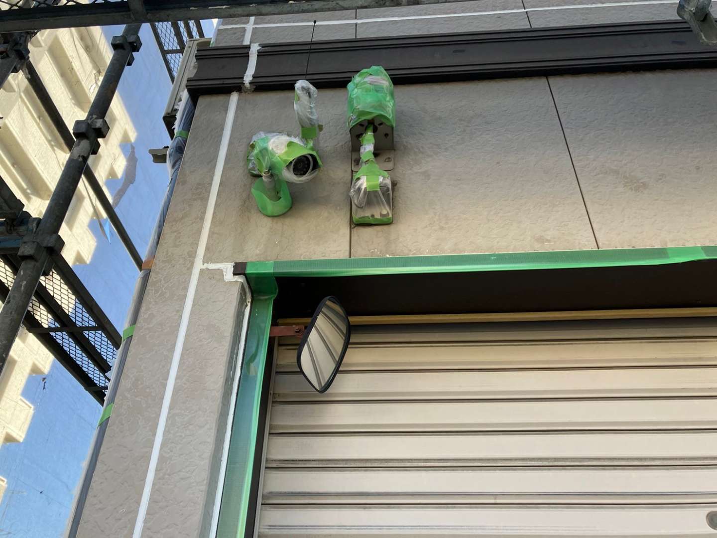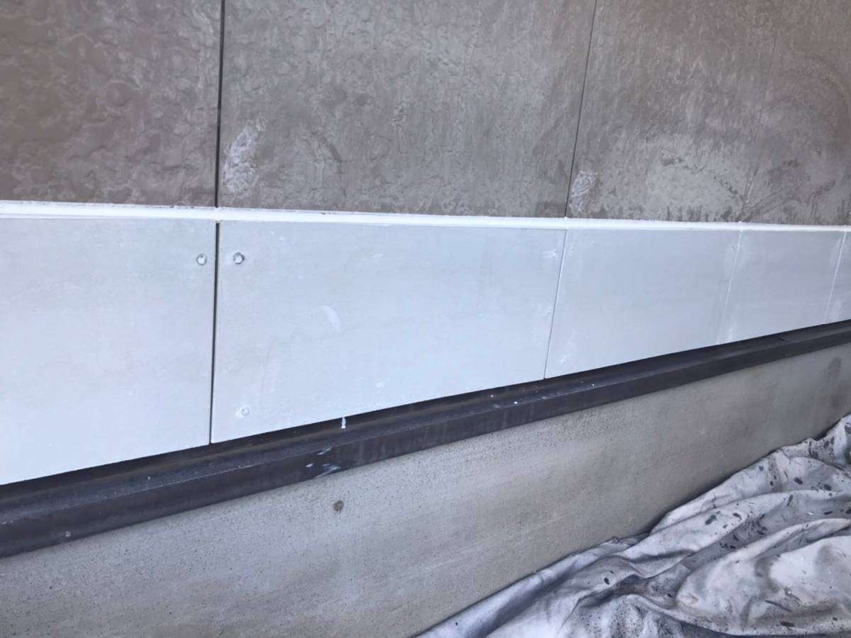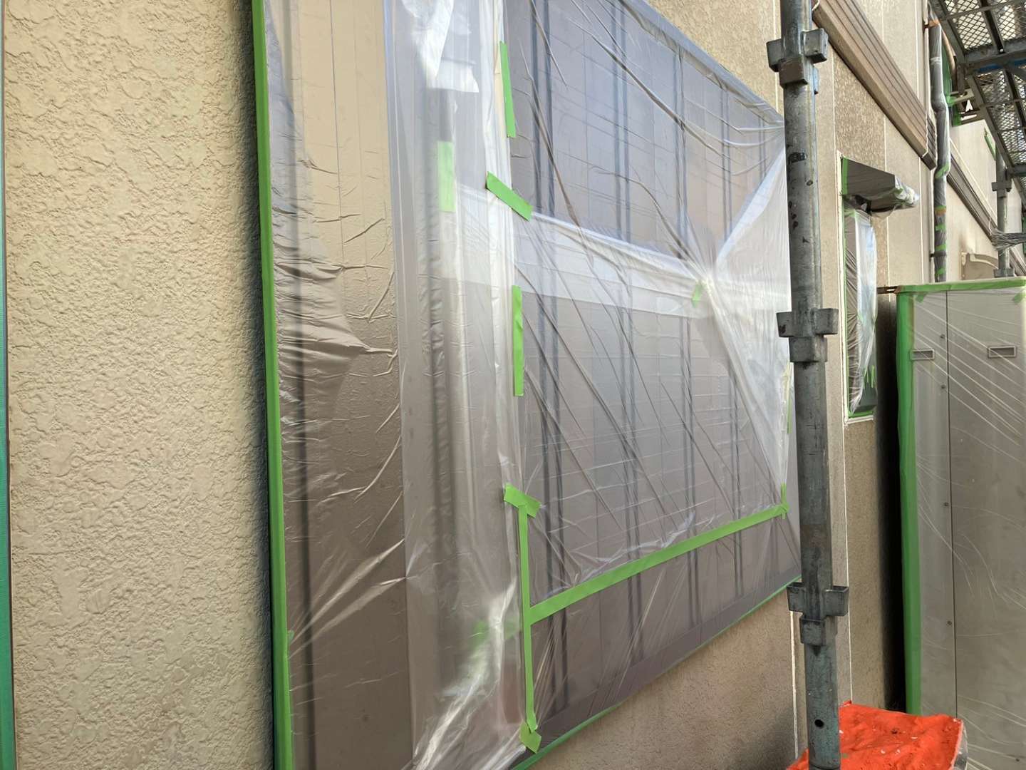 養生作業・外壁補修部の下塗り(柄付け)作業・パラペット部リベット打ち作業を行いました。