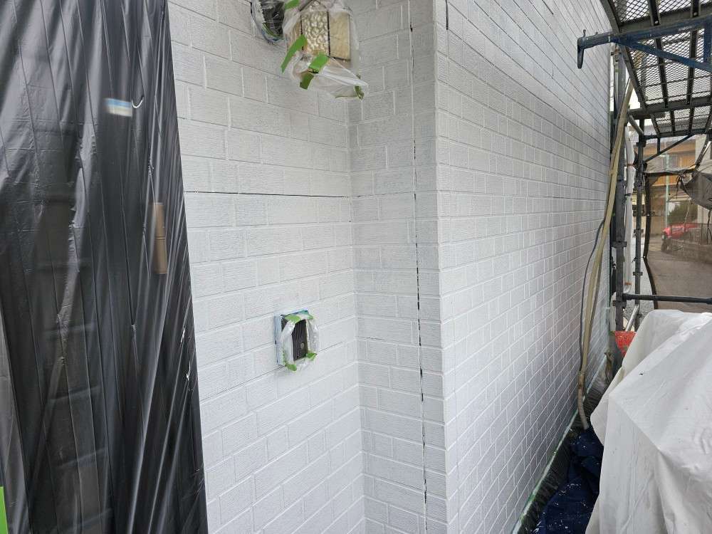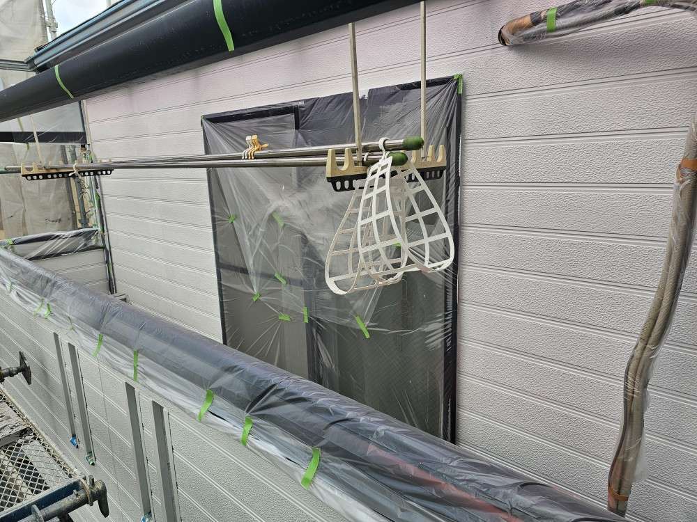 北区K様邸の昨日の作業内容は、外壁の下塗り塗装作業、軒天1回目塗装作業、破風板の下塗り塗装作業、屋根ケラバ部の錆止め塗装作業でした。