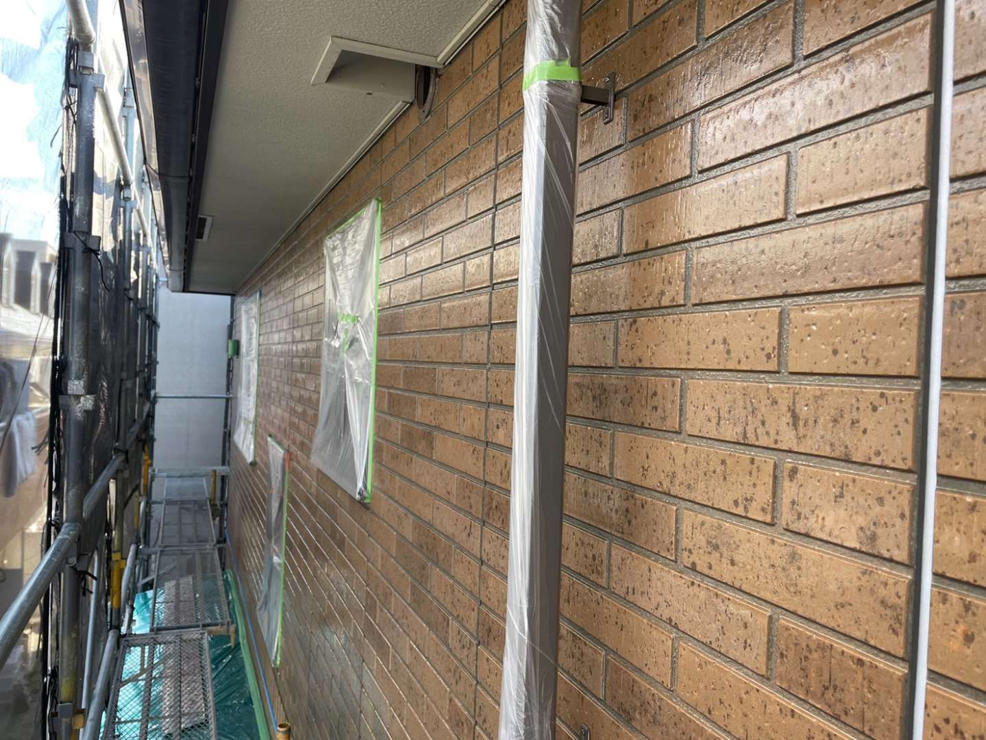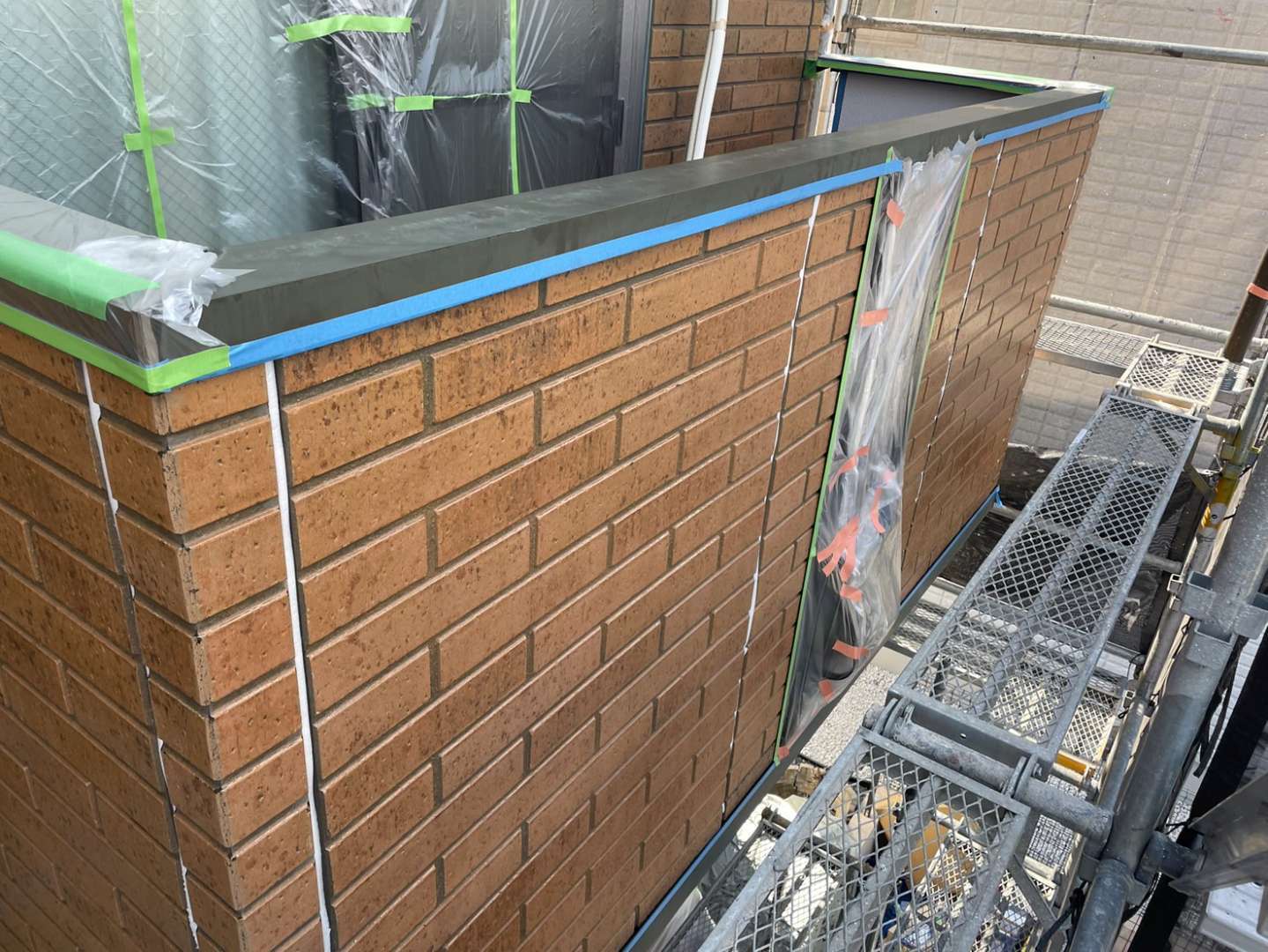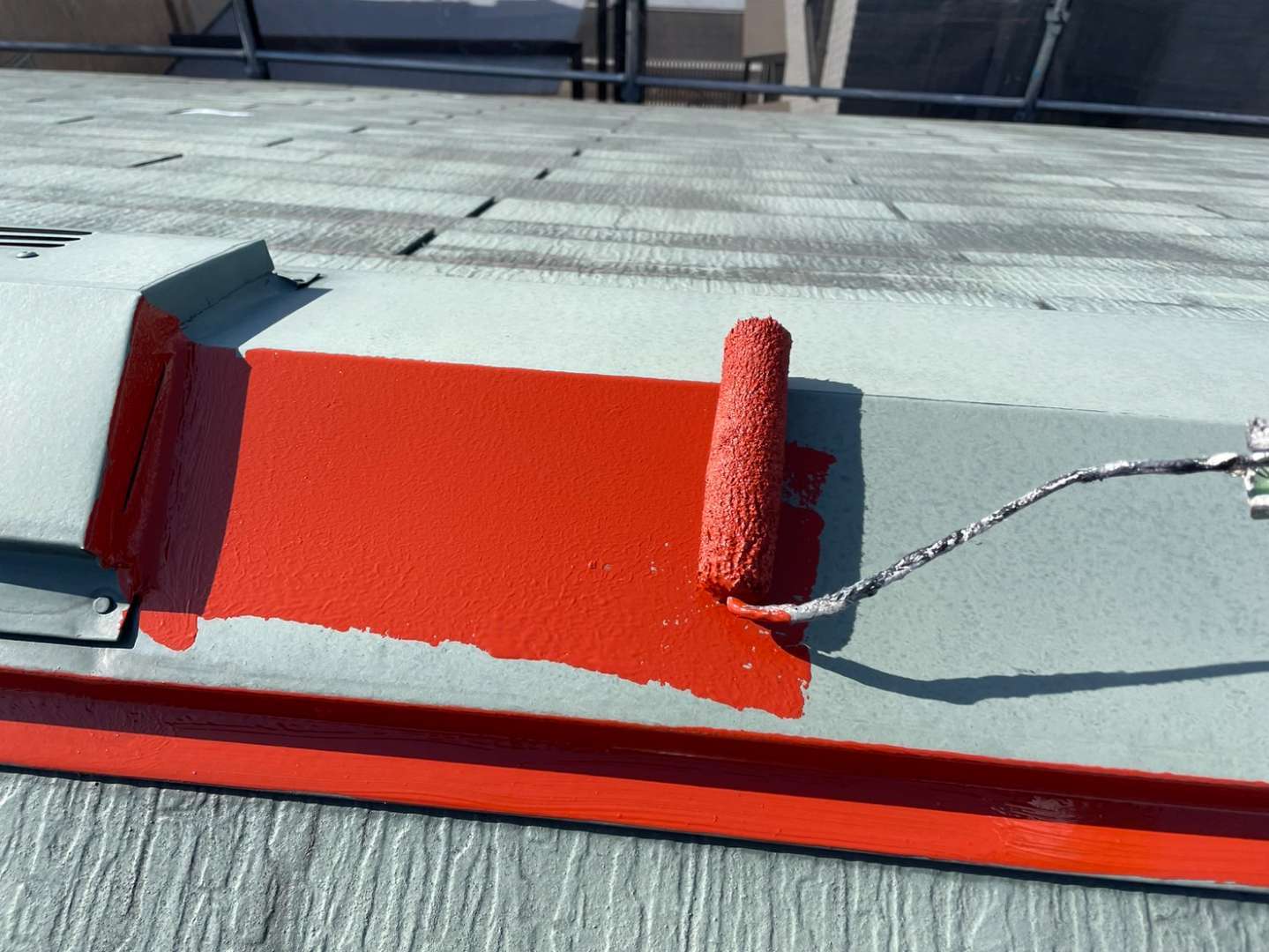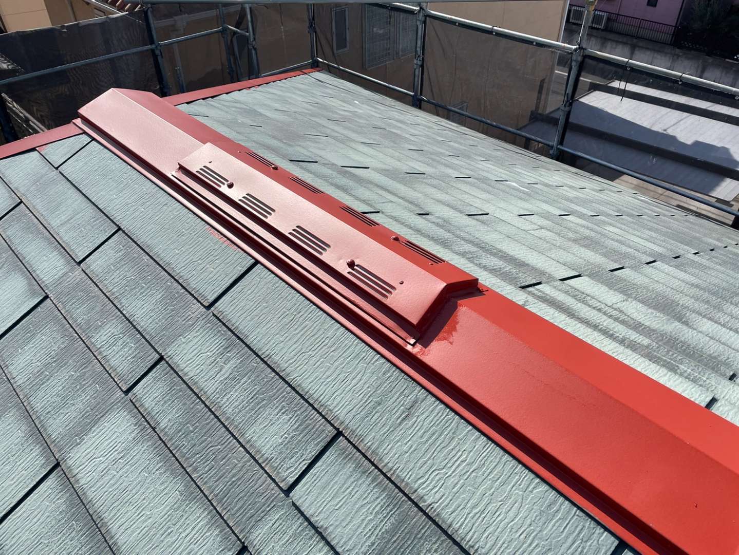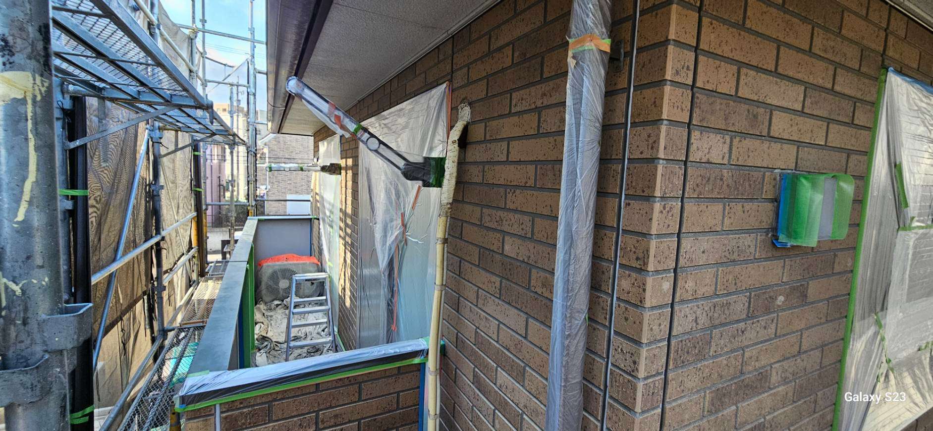 南区K様邸、昨日までの作業内容は、コーキングカット作業、養生作業、屋根棟板金錆止め塗装、補修、タスペーサー取付け、屋根下塗り作業、外壁下塗り作業まで完了しています。