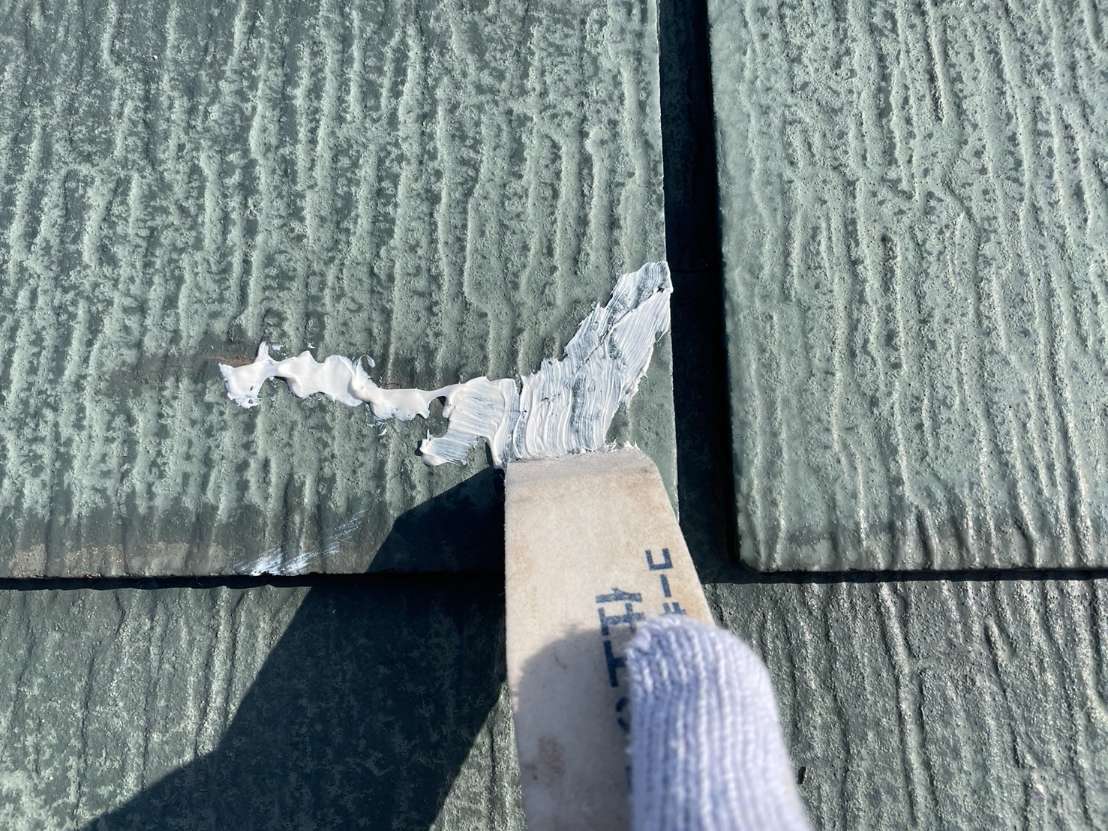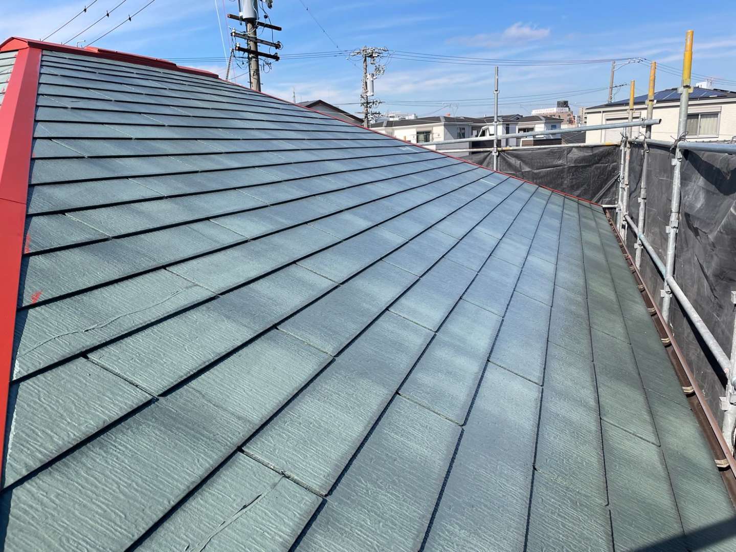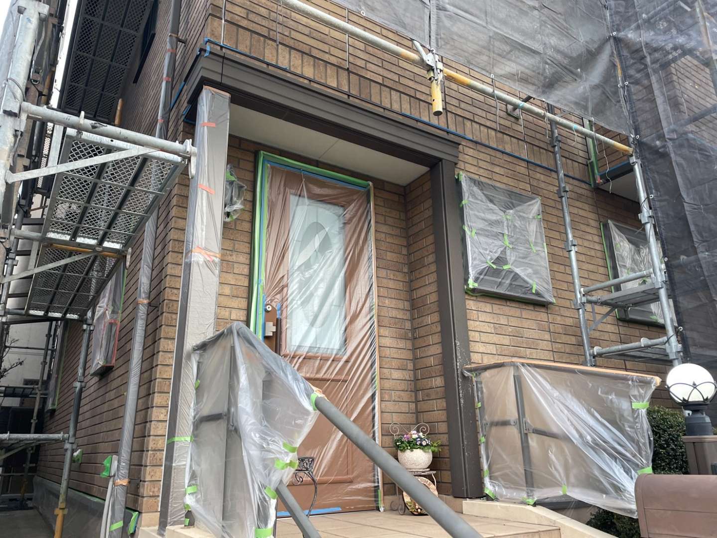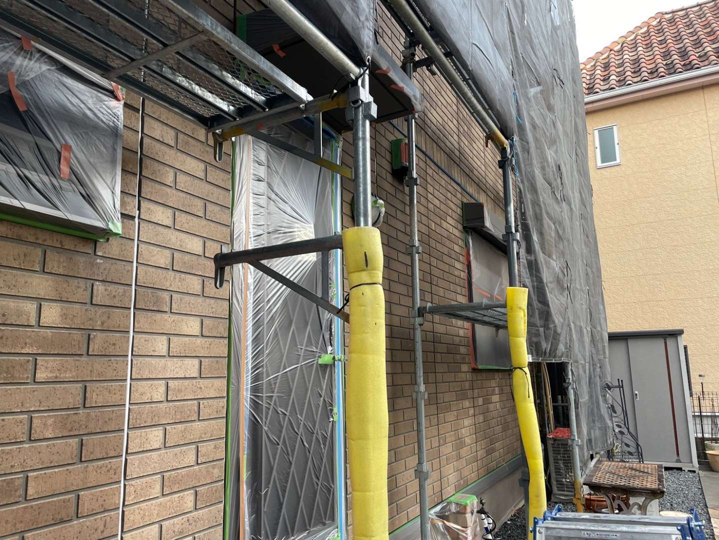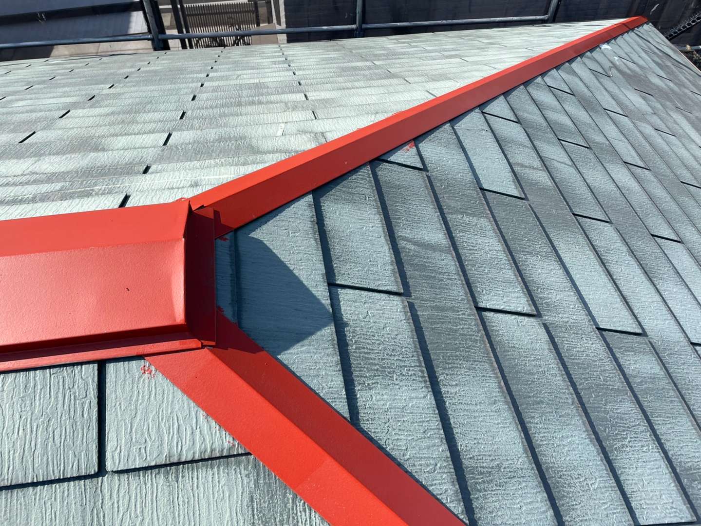 南区K様邸、昨日までの作業内容は、コーキングカット作業、養生作業、屋根棟板金錆止め塗装、補修、タスペーサー取付け、屋根下塗り作業、外壁下塗り作業まで完了しています。