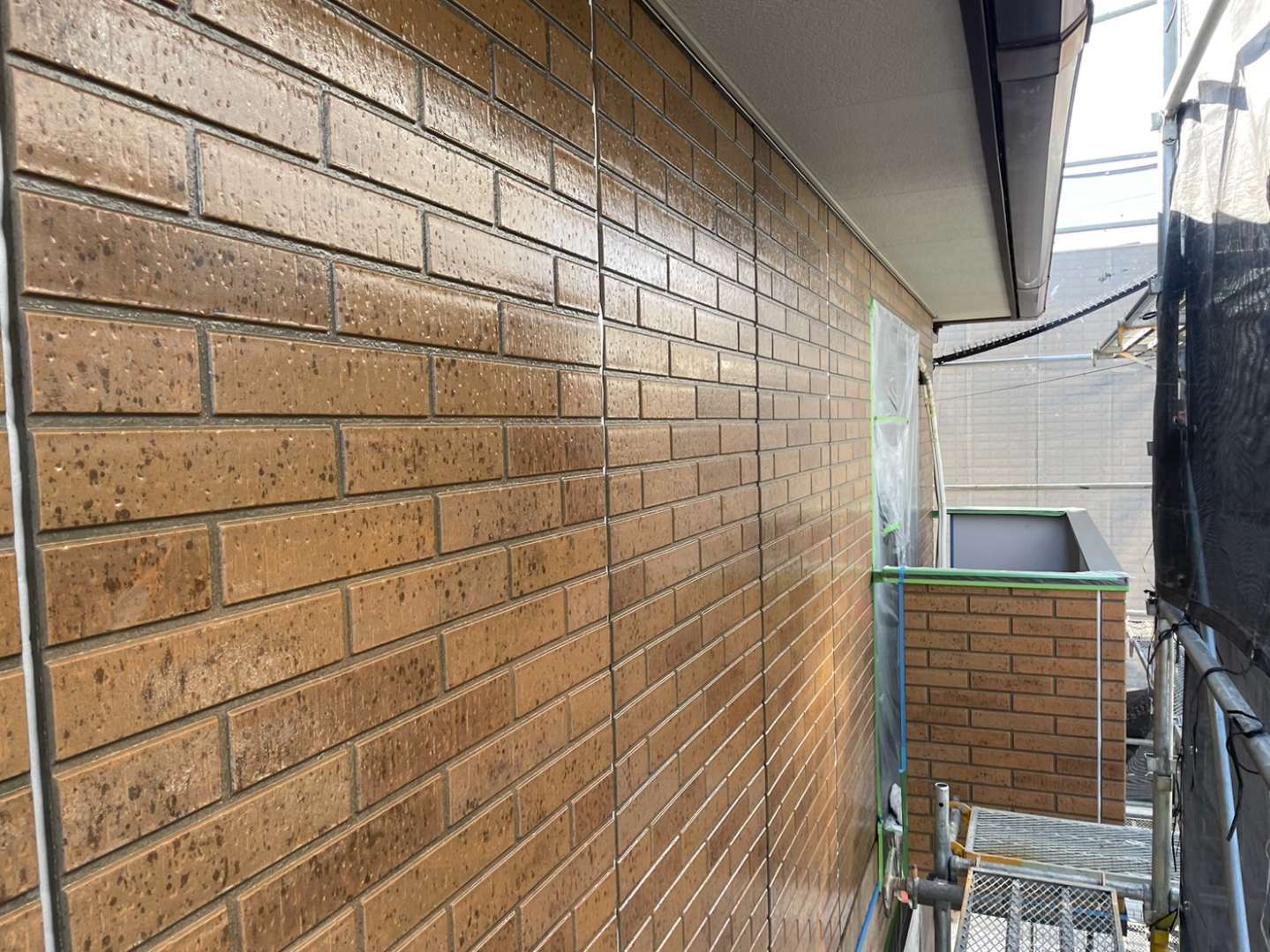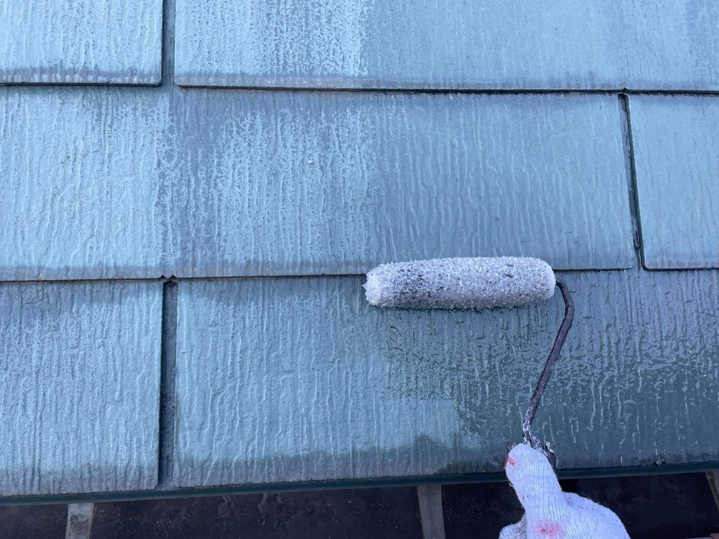 K様邸の今日の作業は、外壁クリヤー上塗り1回目塗装、屋根中塗り塗装作業予定です。