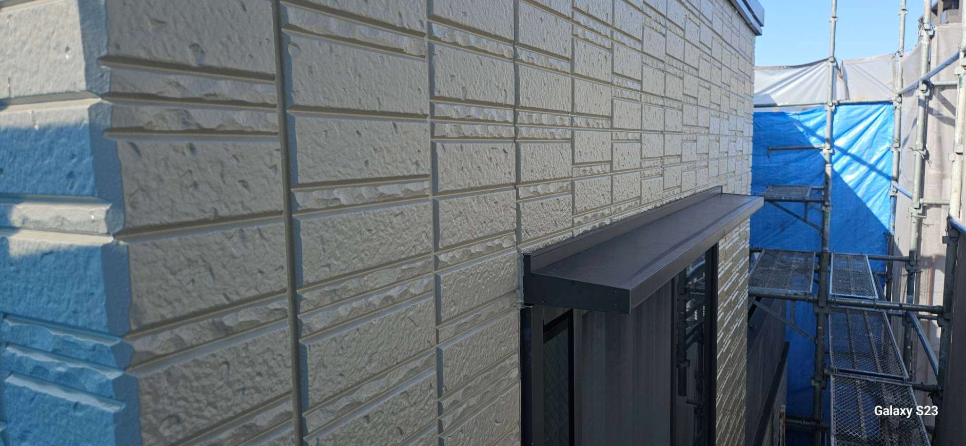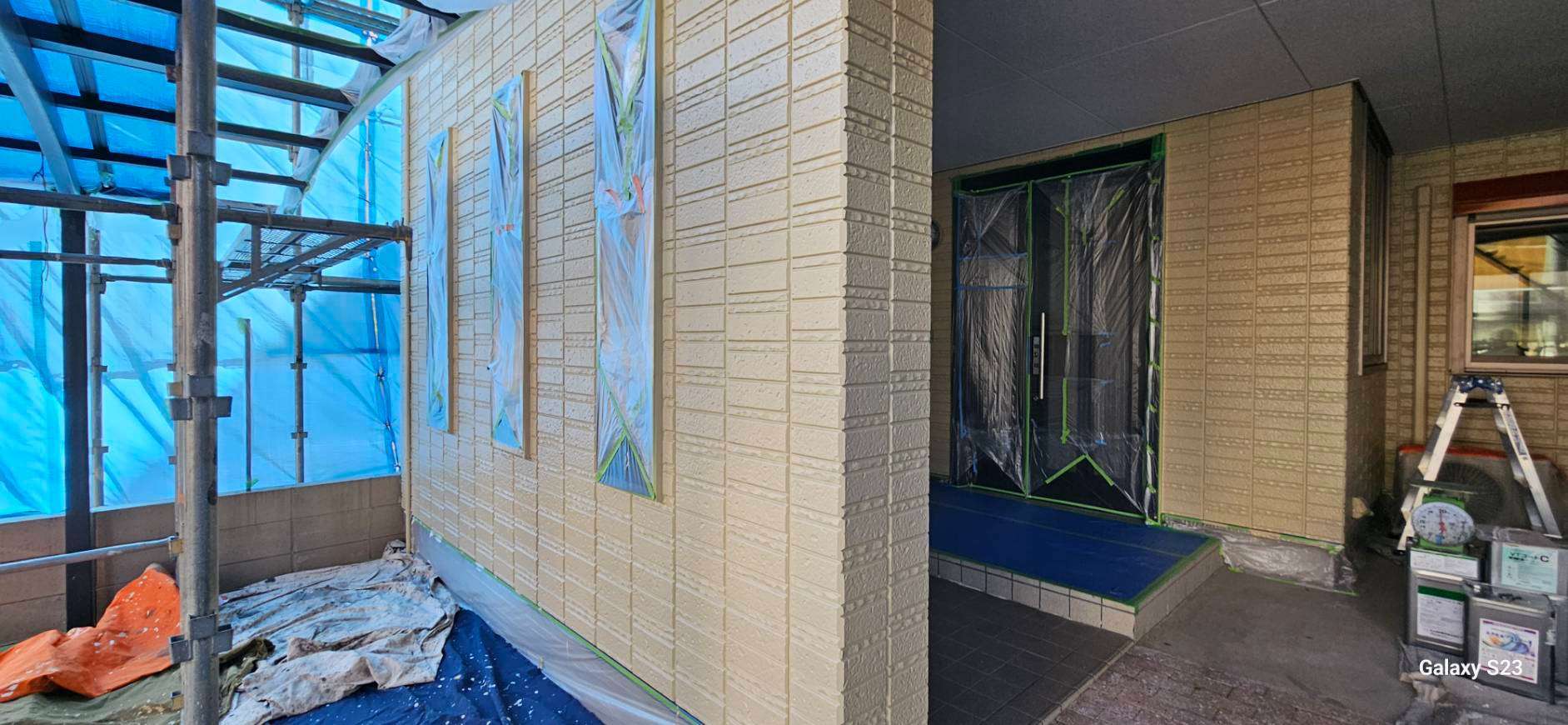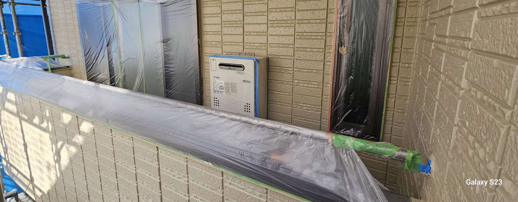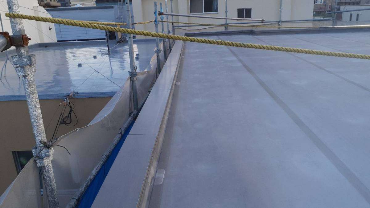 東区I様邸の昨日の作業内容は、外壁の上塗り塗装作業、屋上笠木部のケレン・プライマー塗装作業でした。