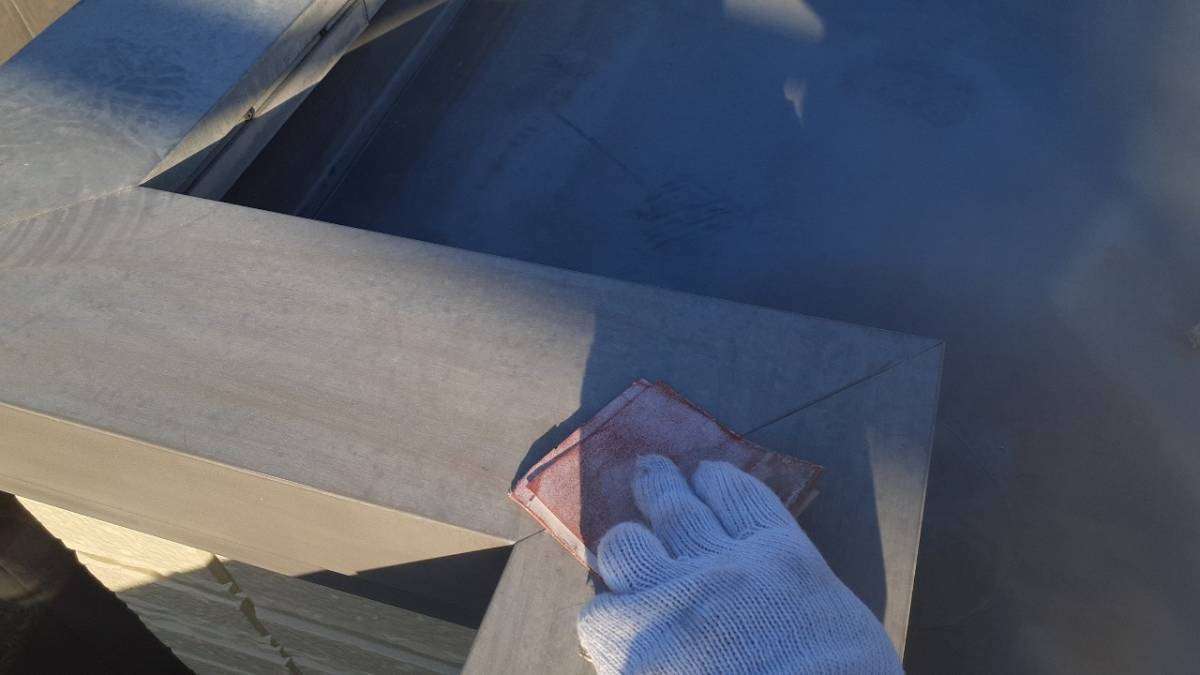 I様邸の今日の作業は、付帯部の下塗り(錆止め)塗装作業と屋上VTコート塗装作業予定です。