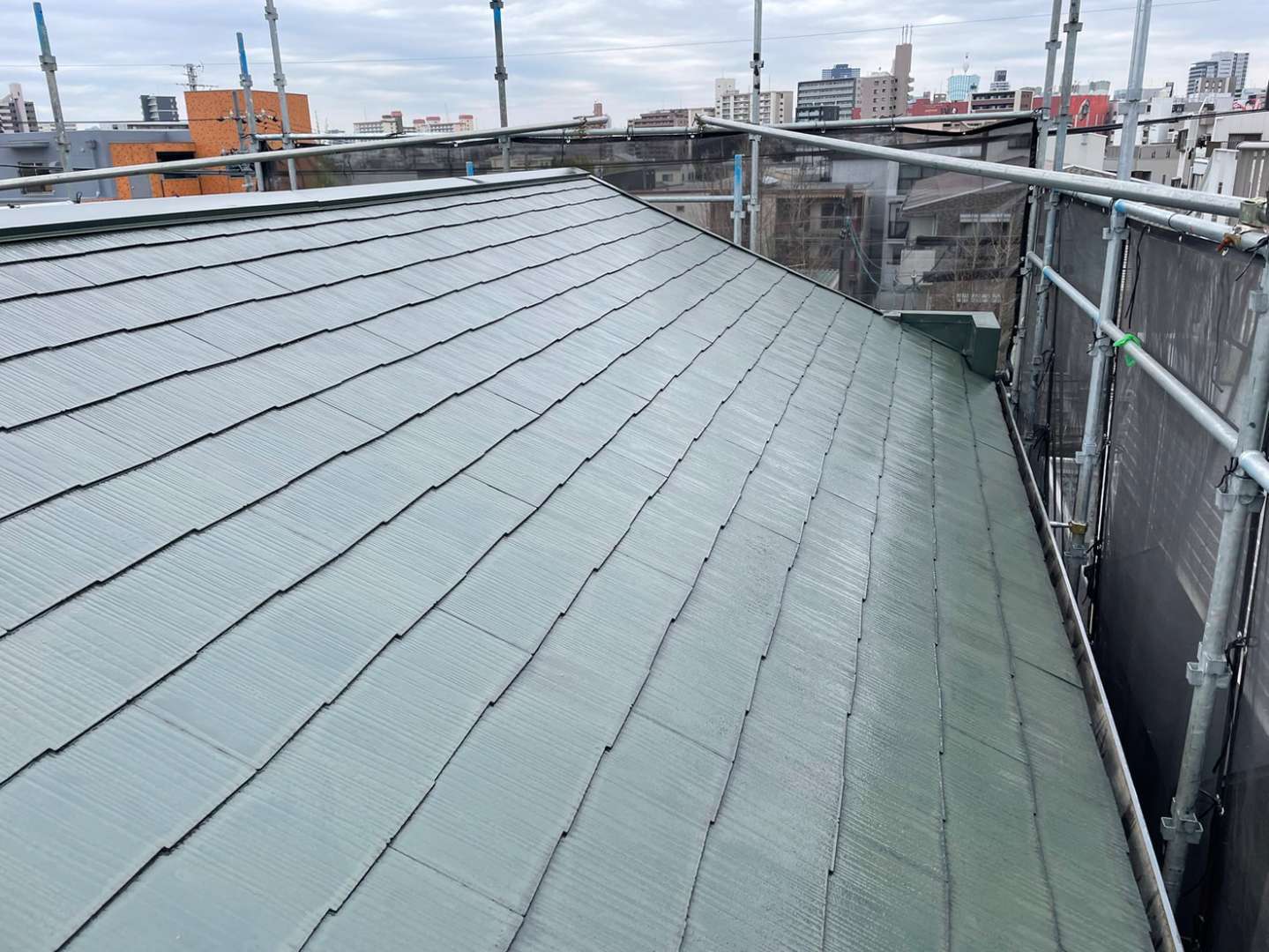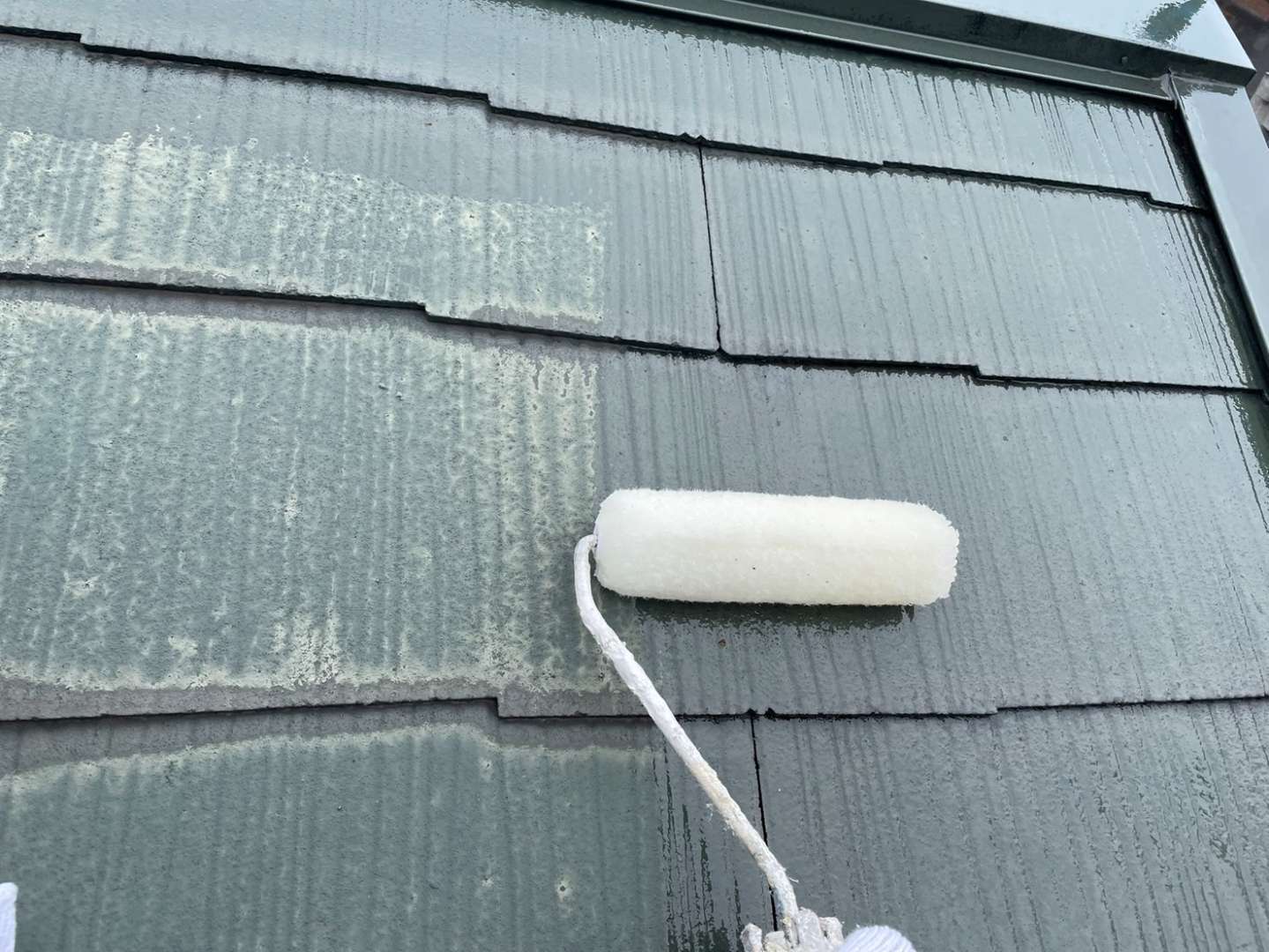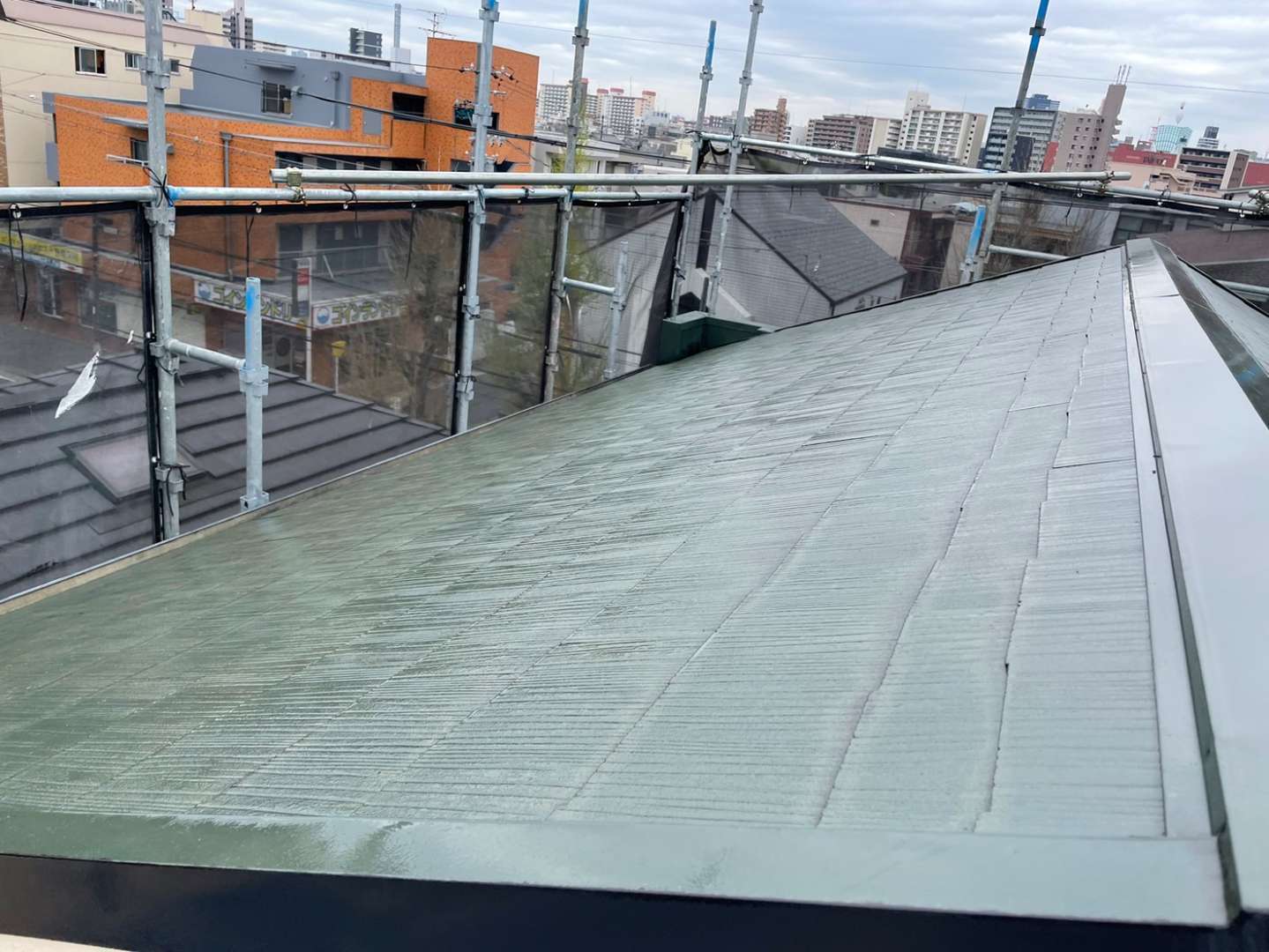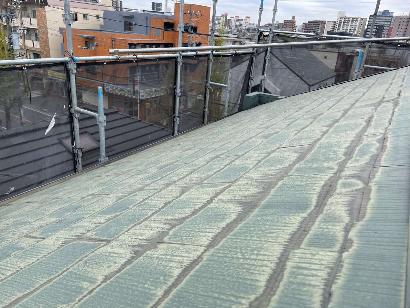 千種区K理容店様の昨日の作業は、養生作業、屋根下塗り作業、コーキング補修作業を行いました。