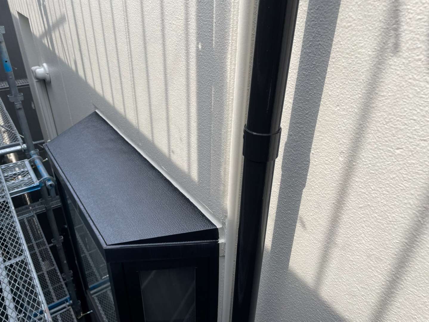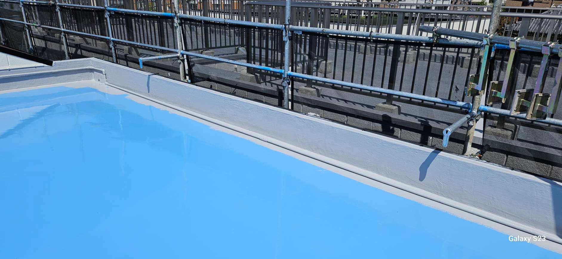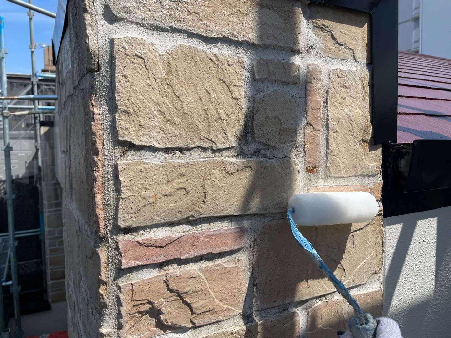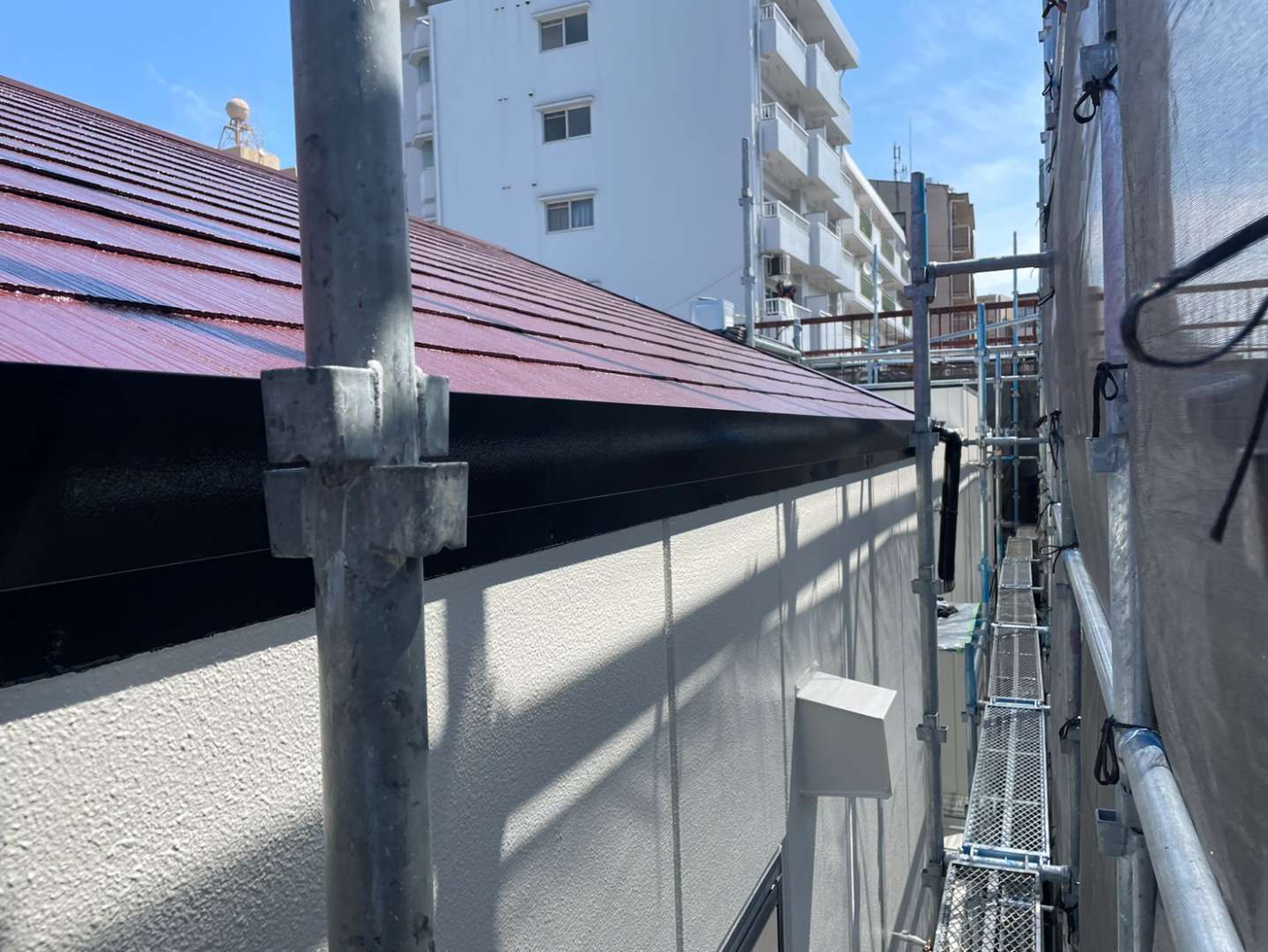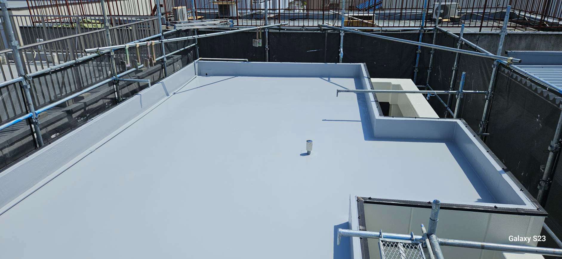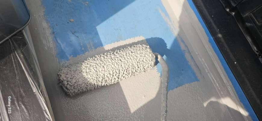 千種区N理容店様の昨日の作業は、屋上ウレタン通気工法防水工事のトップコート塗装、玄関上ウレタン密着工法防水工事のトップコート塗装、屋根上塗り、付帯部の上塗り2回目塗装、サッシ下の面台コーキング、タイル部の撥水剤塗装作業を行いました。
