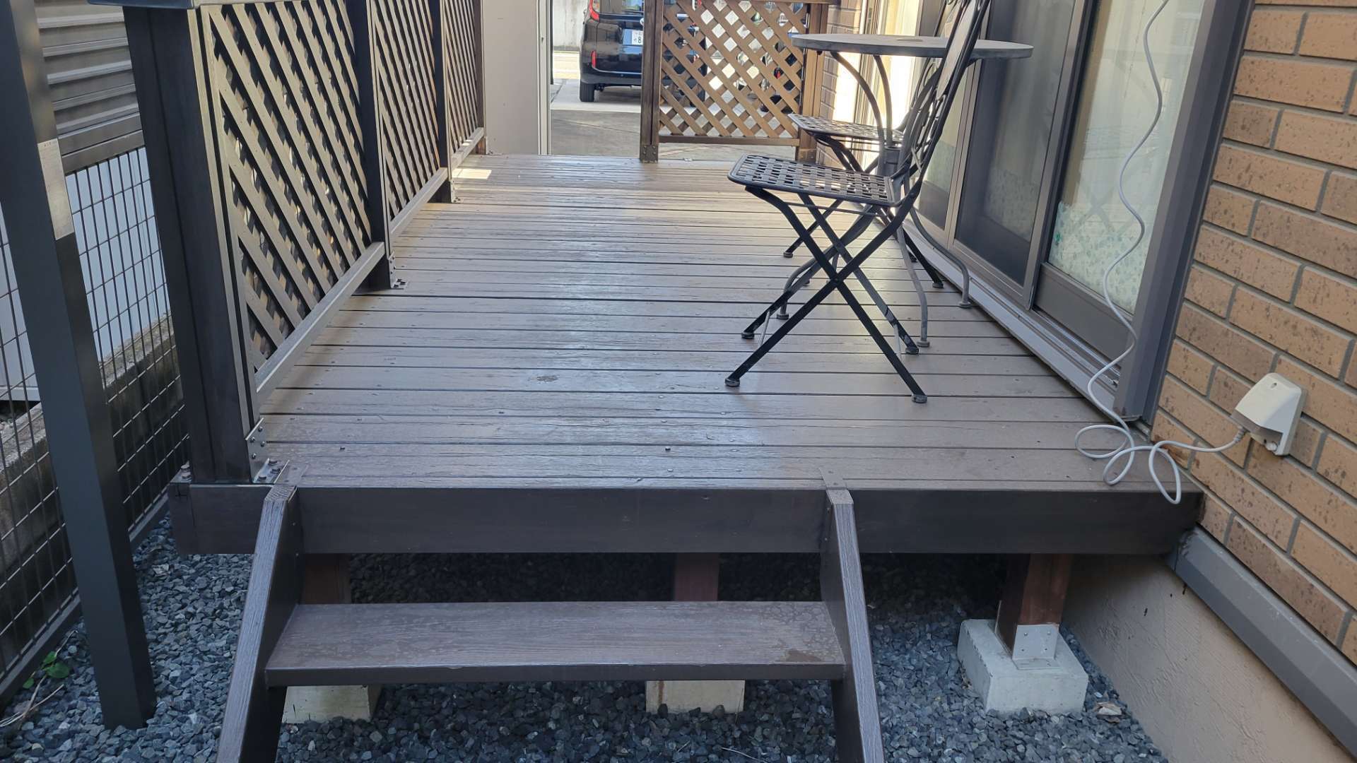 既存のウッドデッキ解体・外壁のクリヤー・水切り塗装作業を行いました。