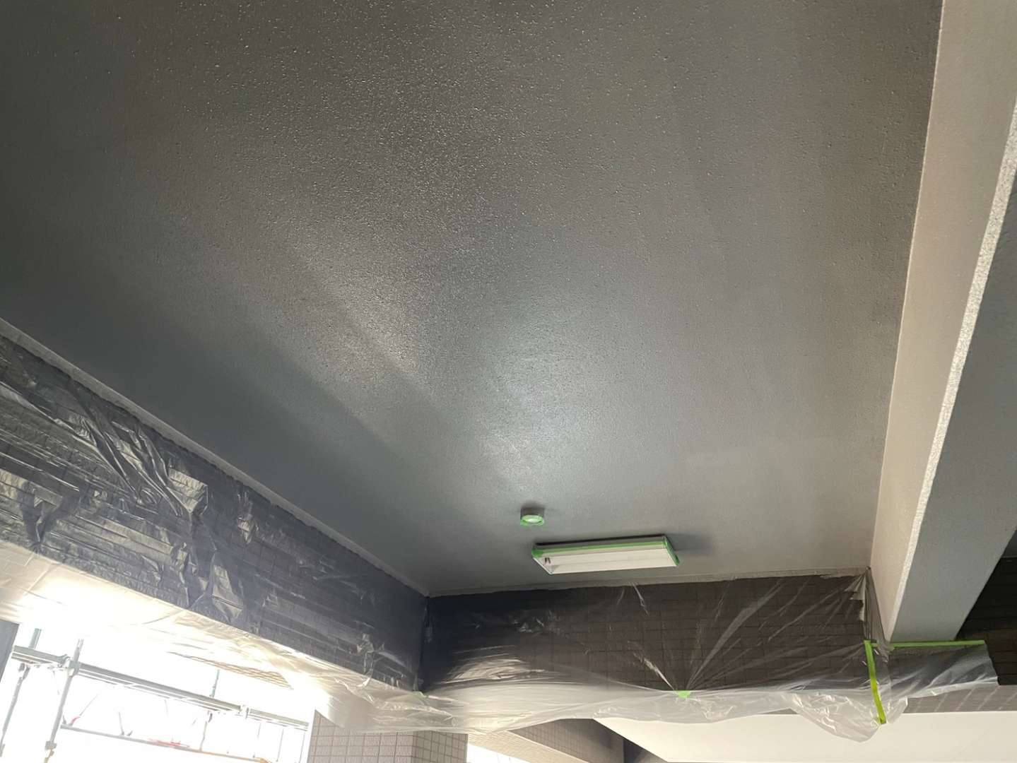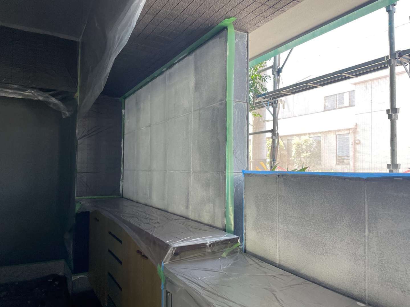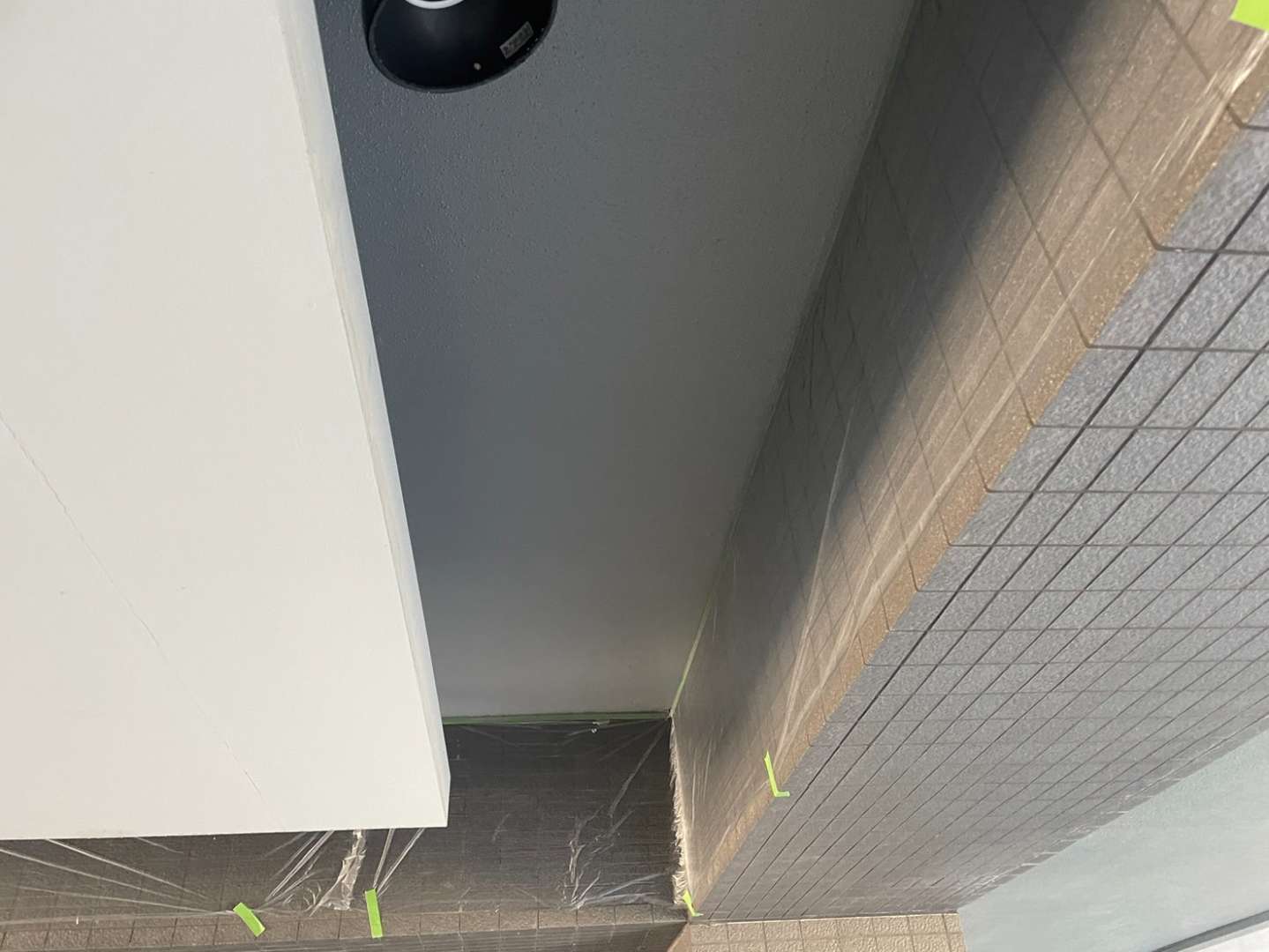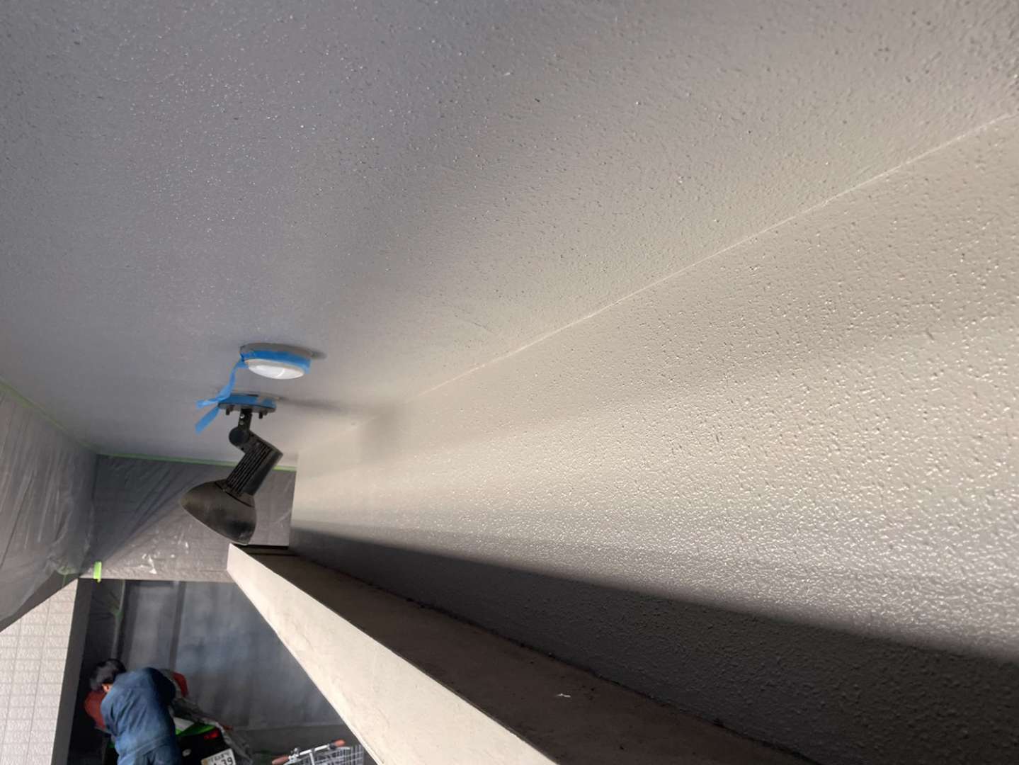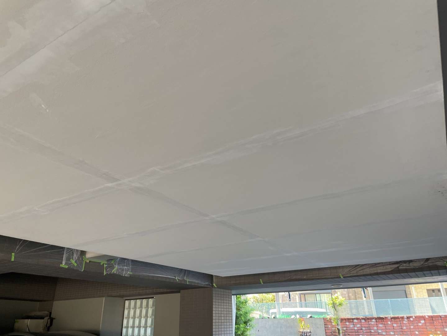 窓廻り面台のコーキング作業・排水管の塗装作業・1F駐車場の養生・天井補修作業を行っていました。