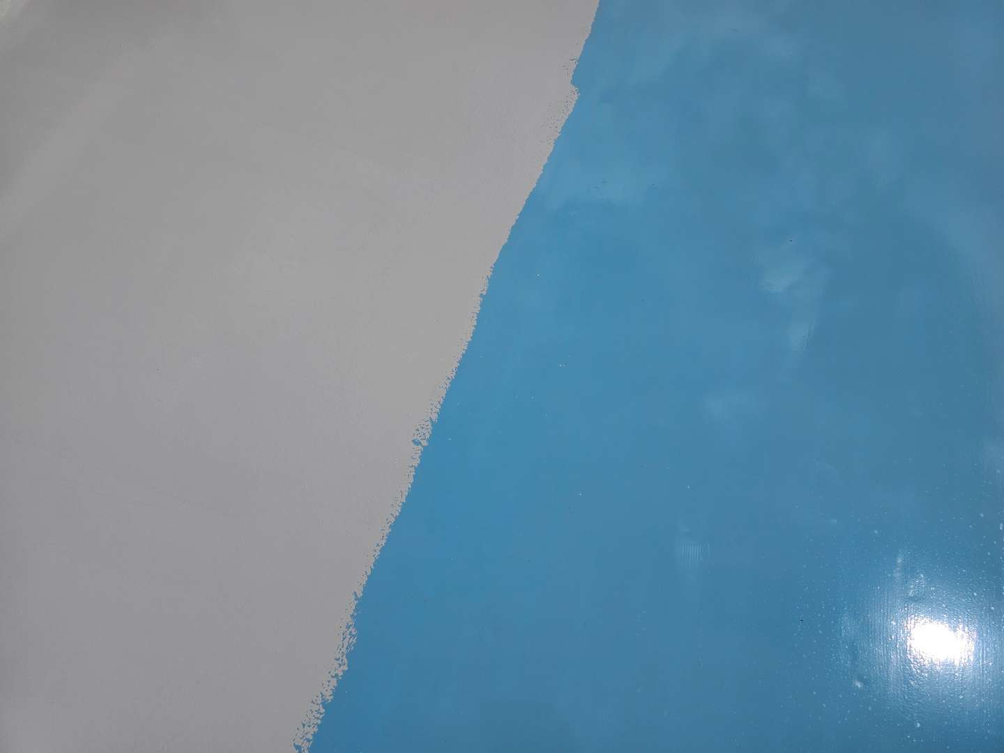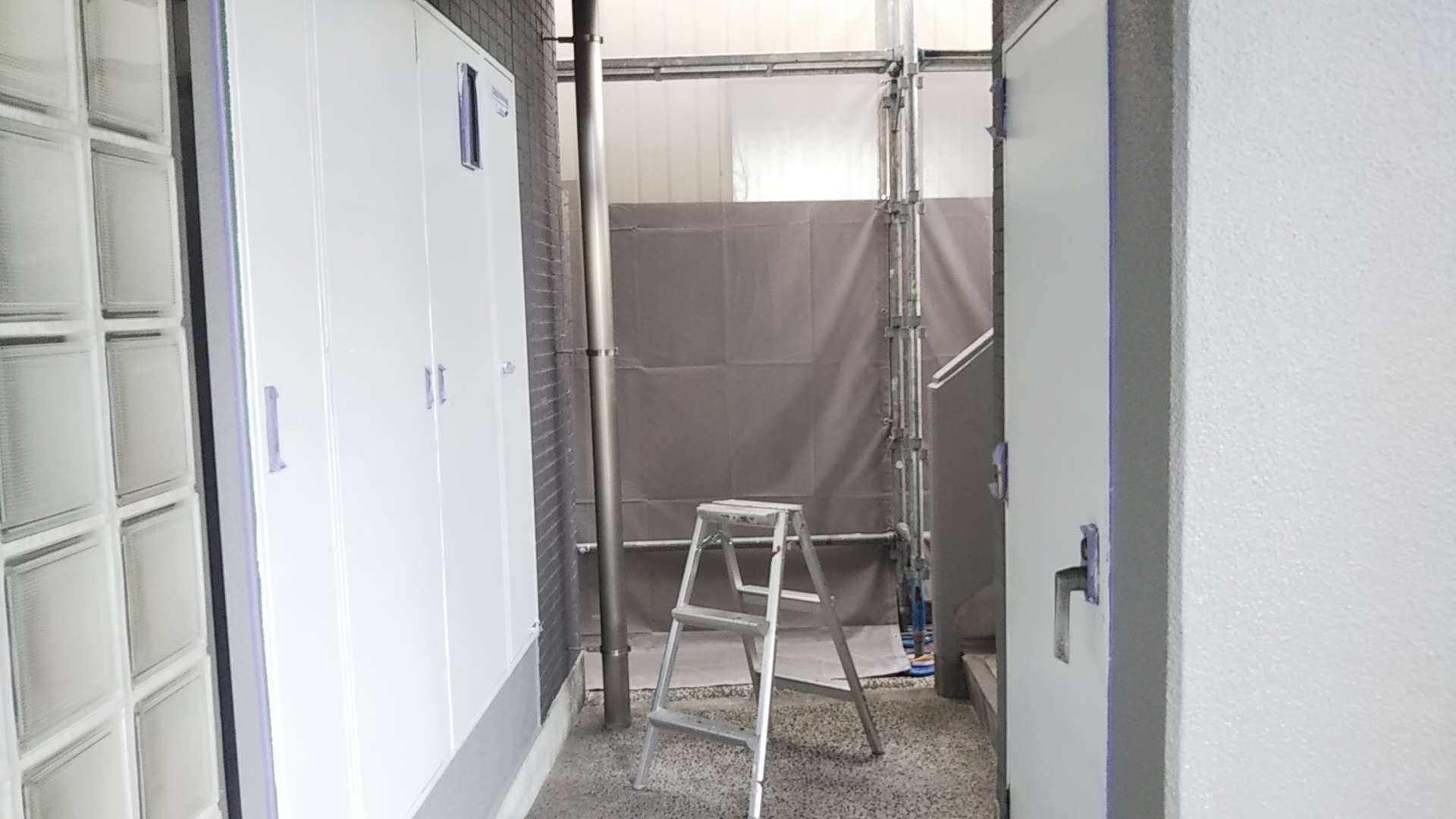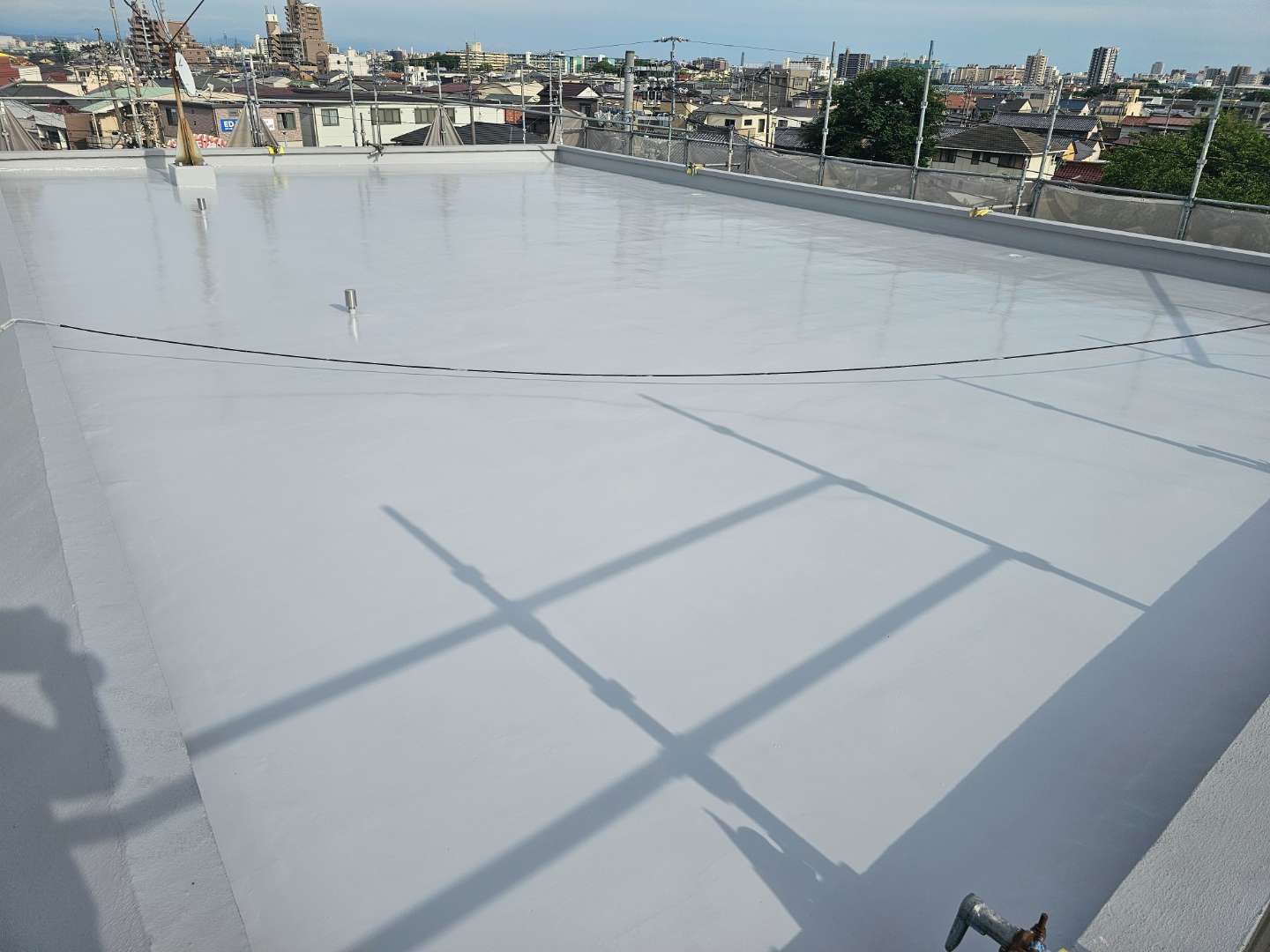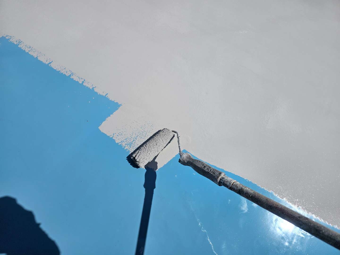 屋上のトップコート塗装・付帯部鉄部の錆止め塗装・上塗り1回目塗装作業を行いました。