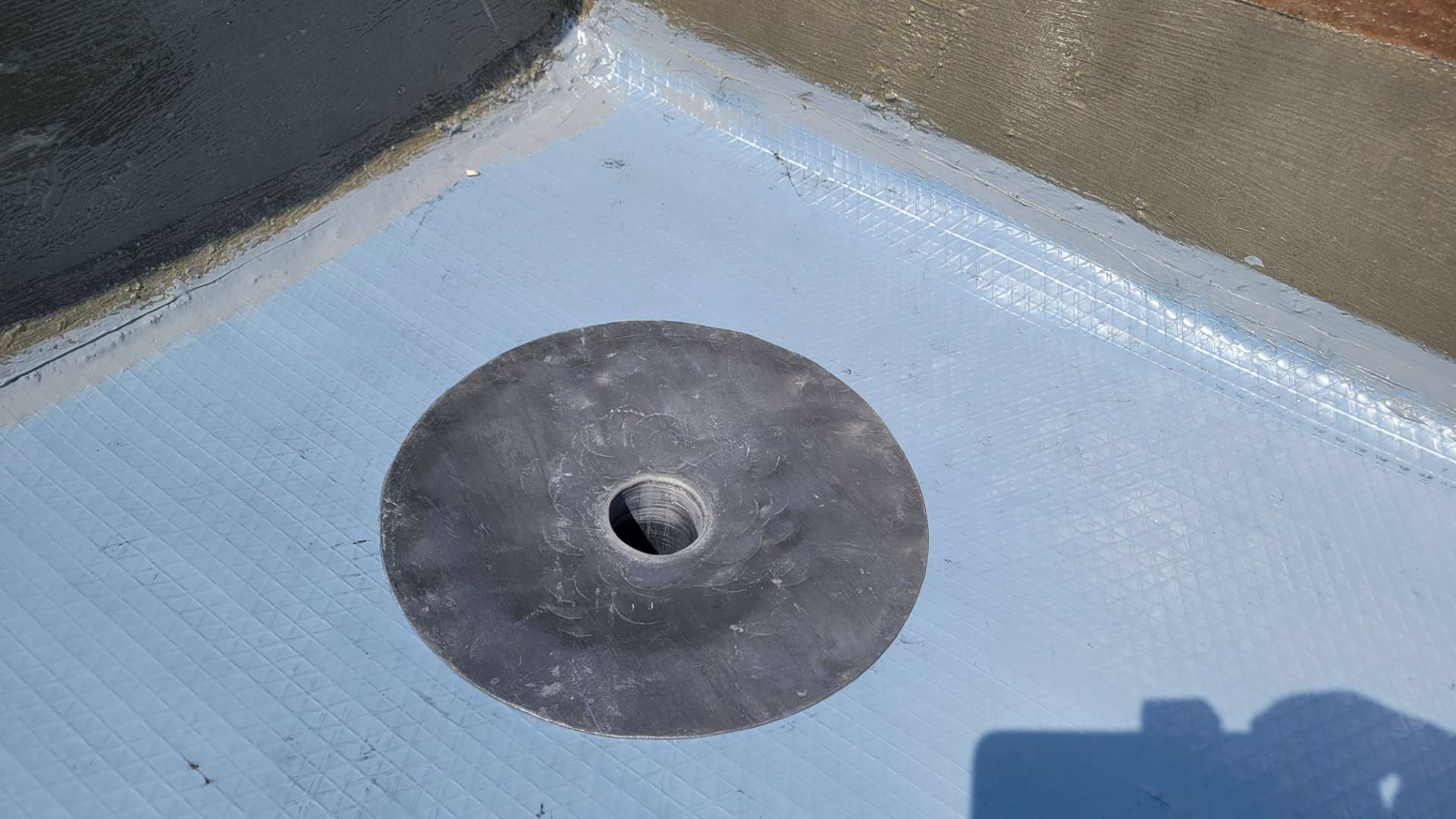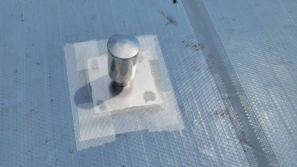 通気シート貼り付け・改修ドレン、脱気筒取り付け・立ち上がり部メッシュ仕様ウレタン1層目、2層目塗装・平場のウレタン樹脂1層目塗装・ハッチのケレン・錆止め塗装作業を行いました。