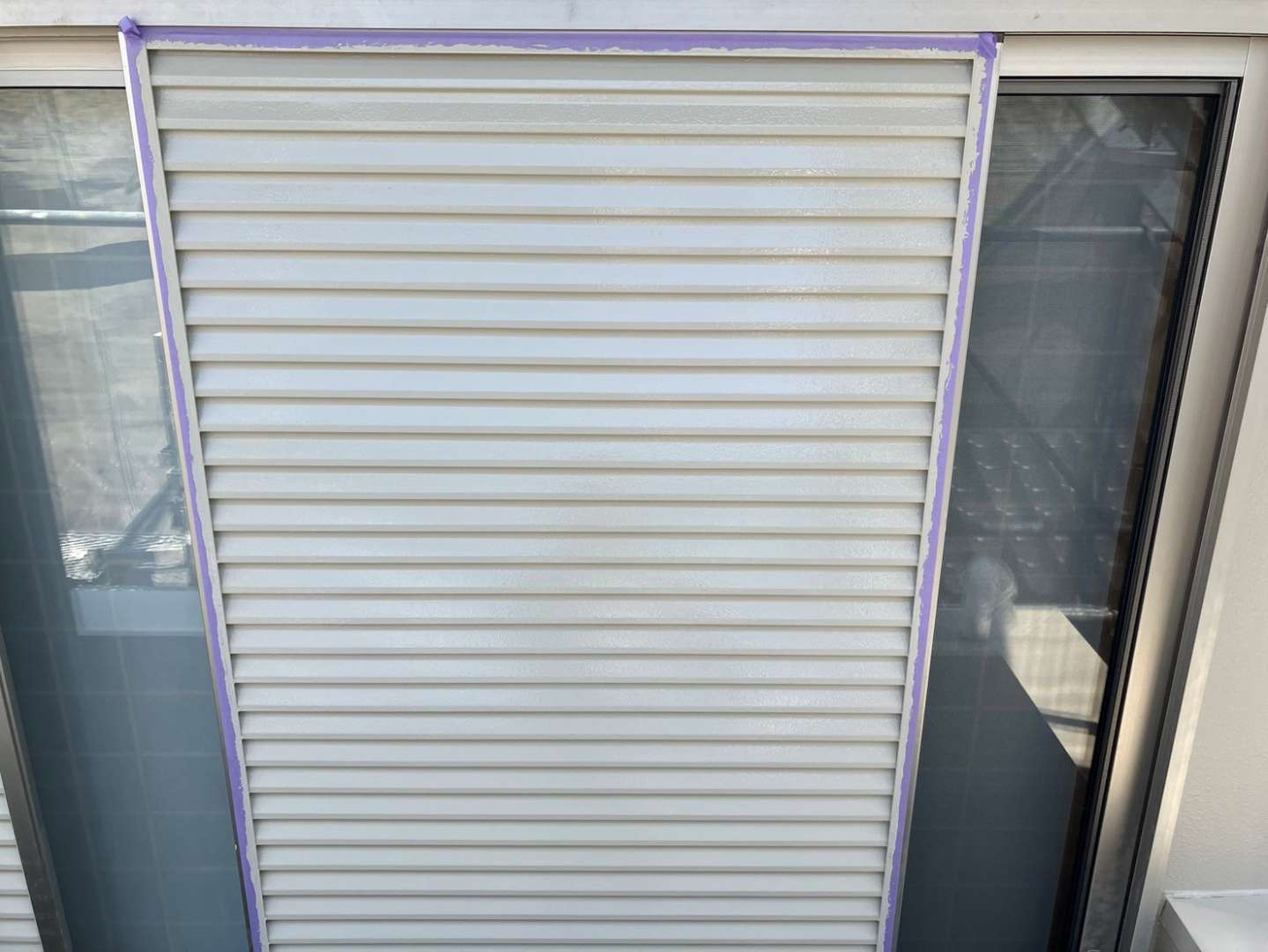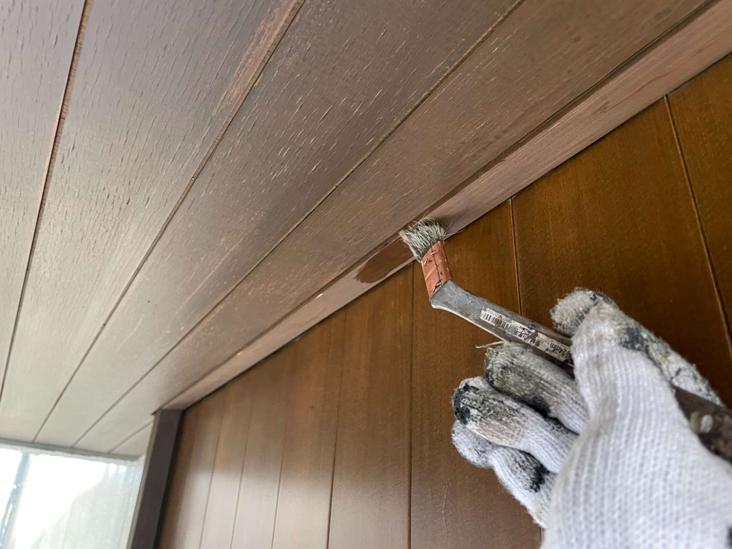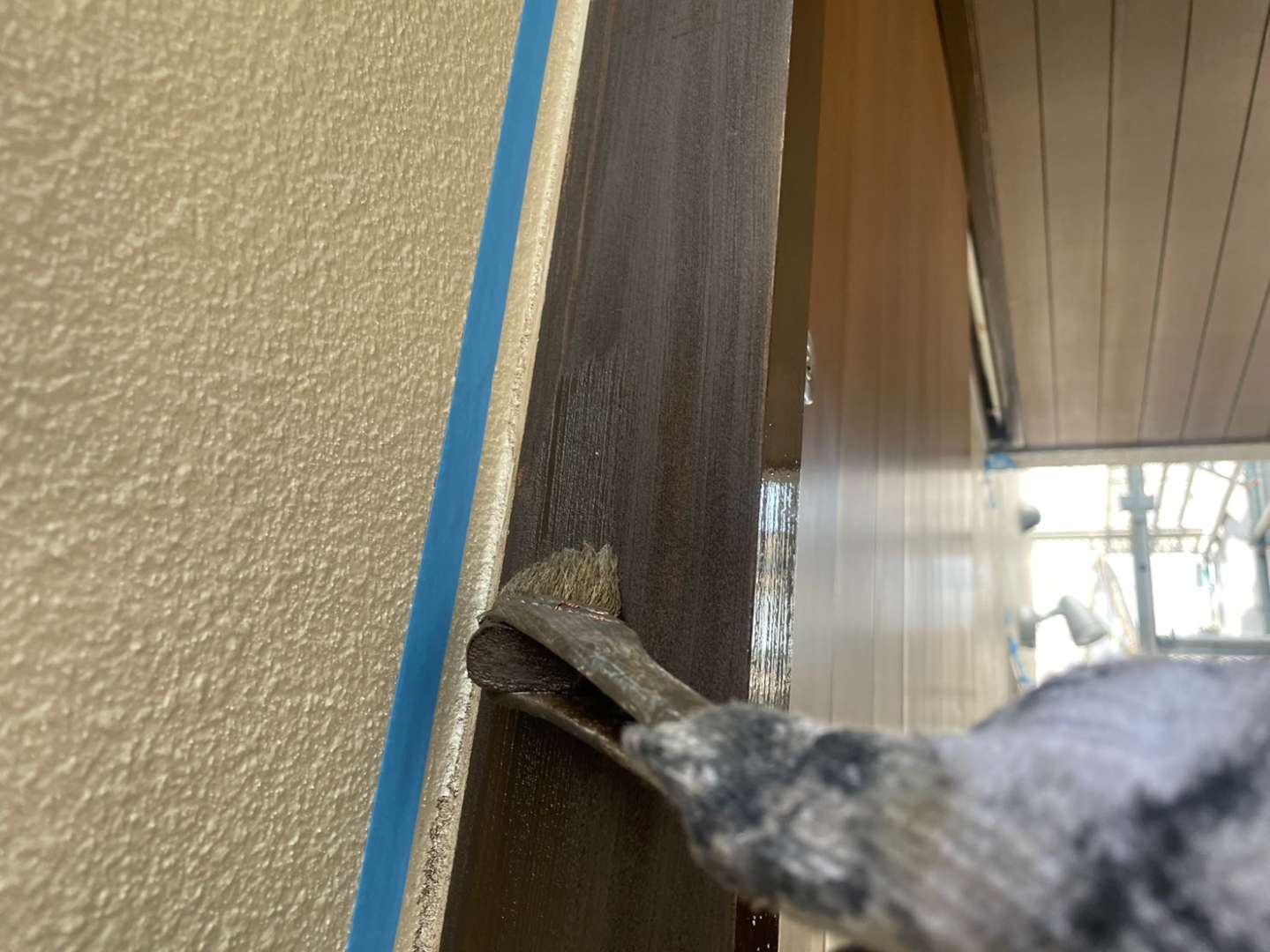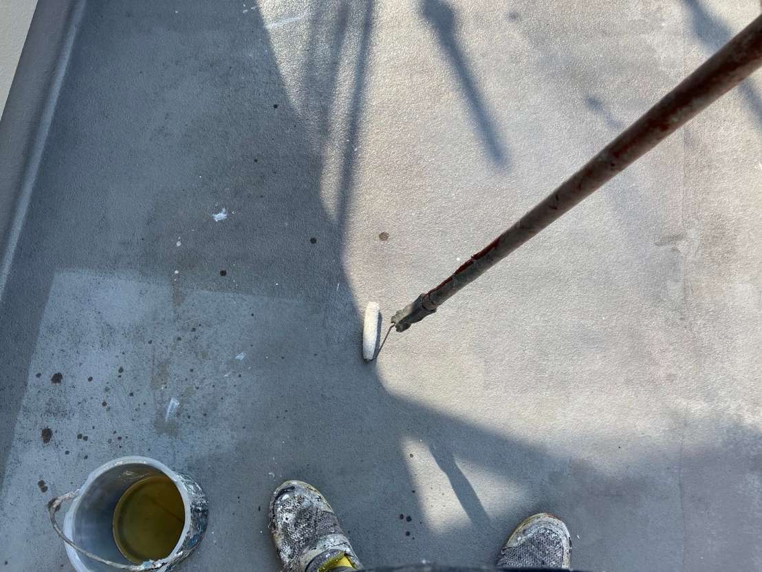 千種区Y様邸の昨日の作業内容は、付帯部塗装作業・下屋根の上塗り塗装作業・ベランダ防水工事のプライマー塗装作業・窓廻りコーキング(シーリング)作業を行っています。
