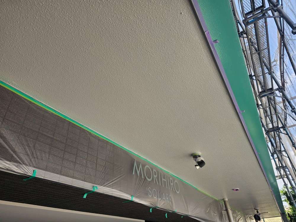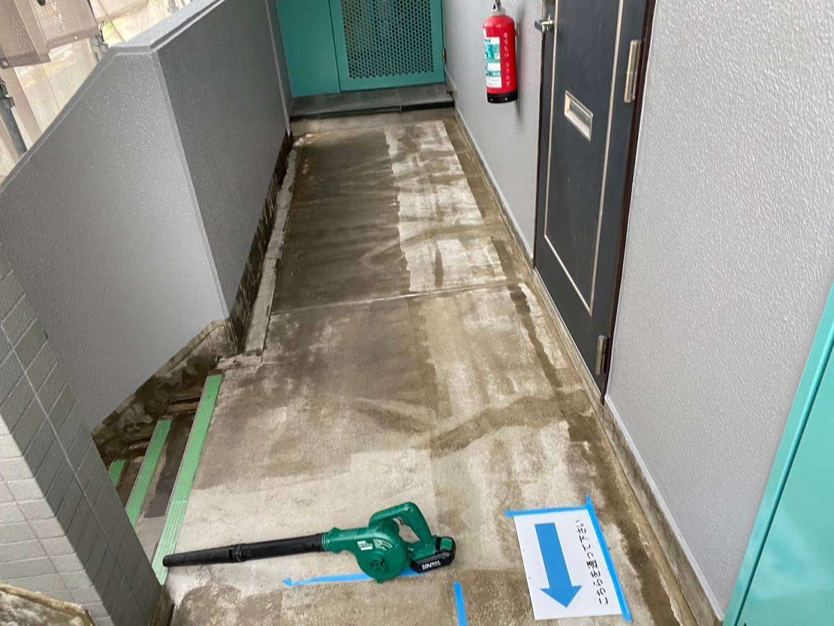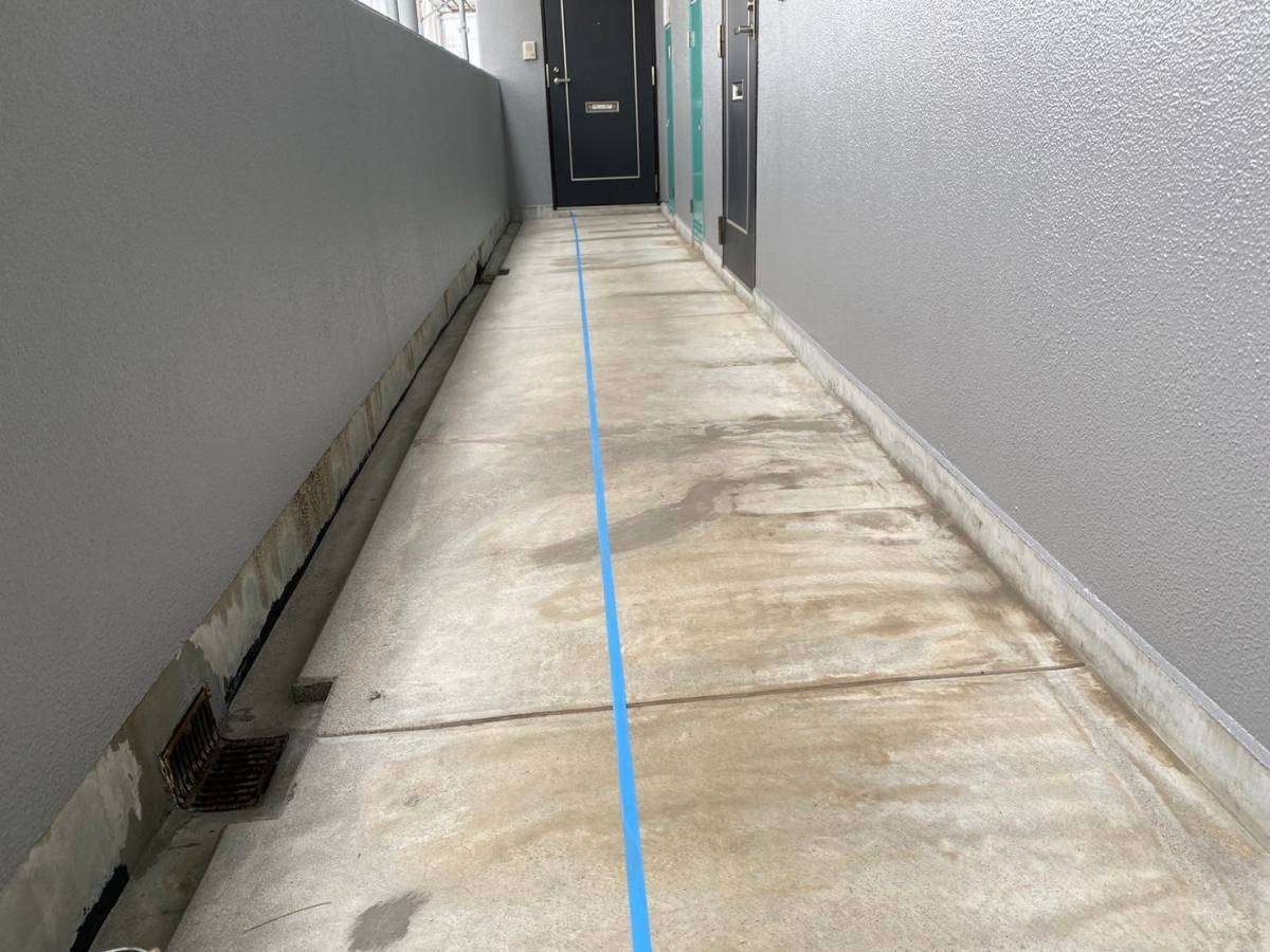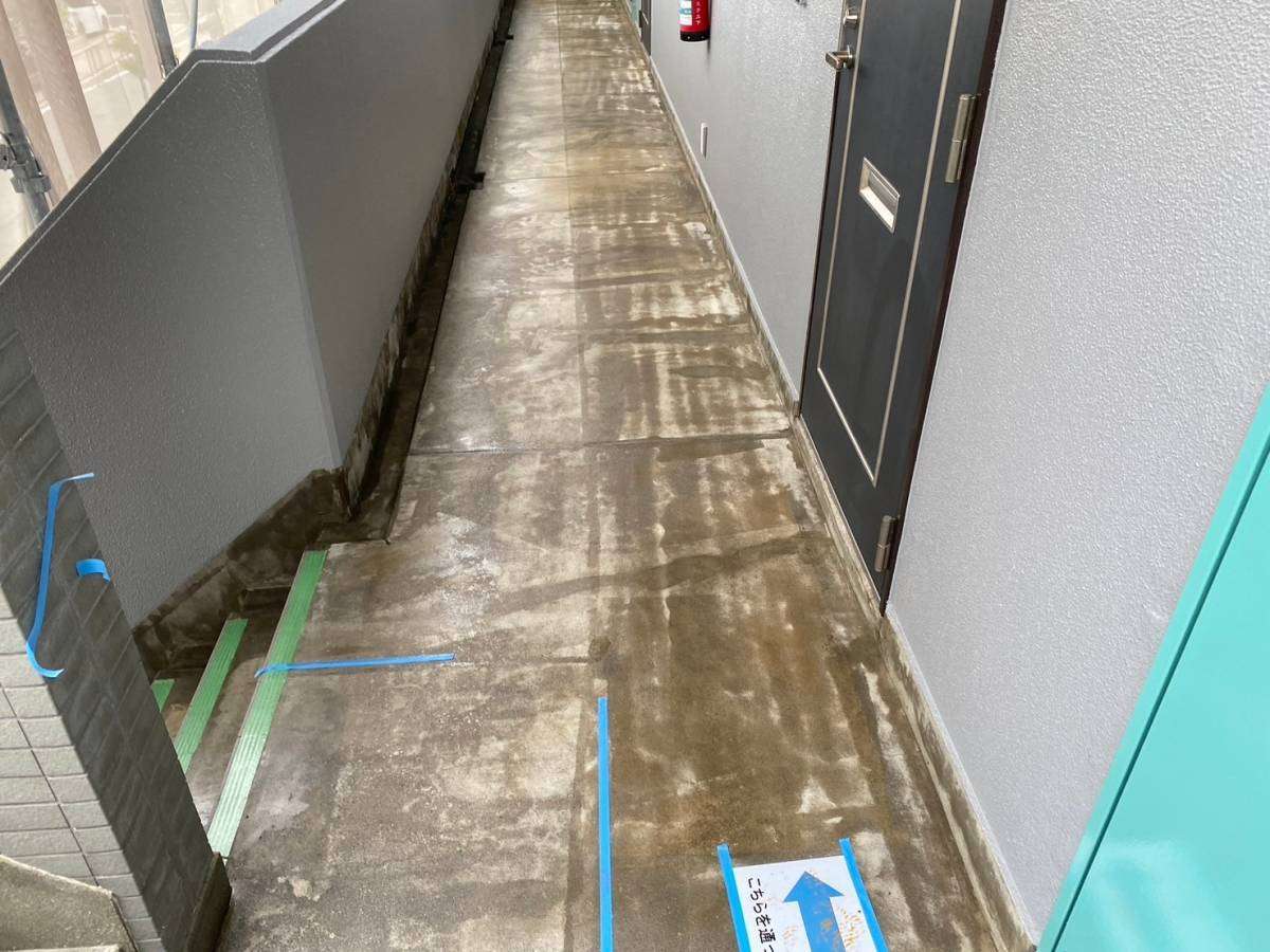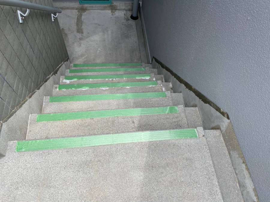 4階、通路の防水作業・階段通路のプライマー塗装作業・軒天塗装作業を行っていました。