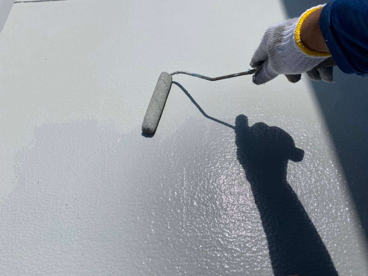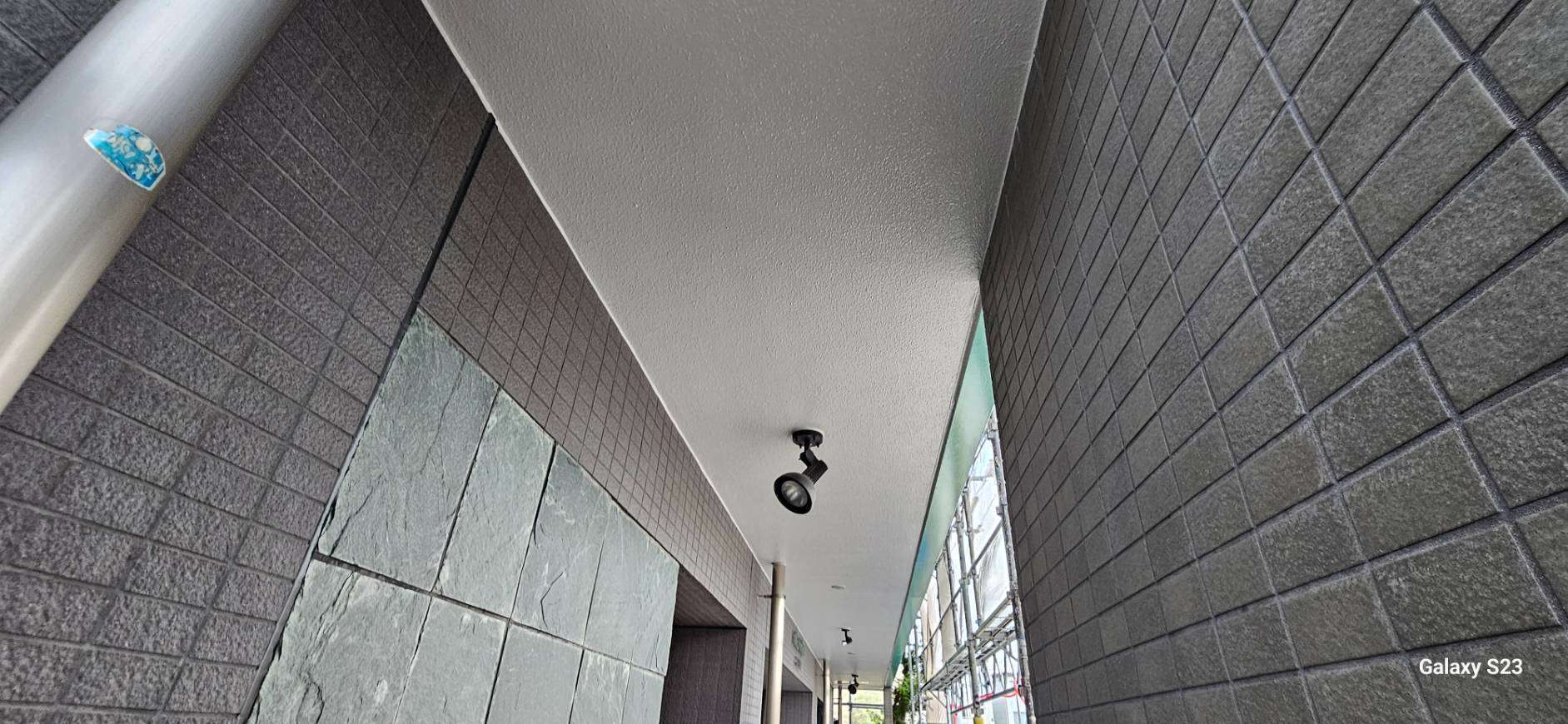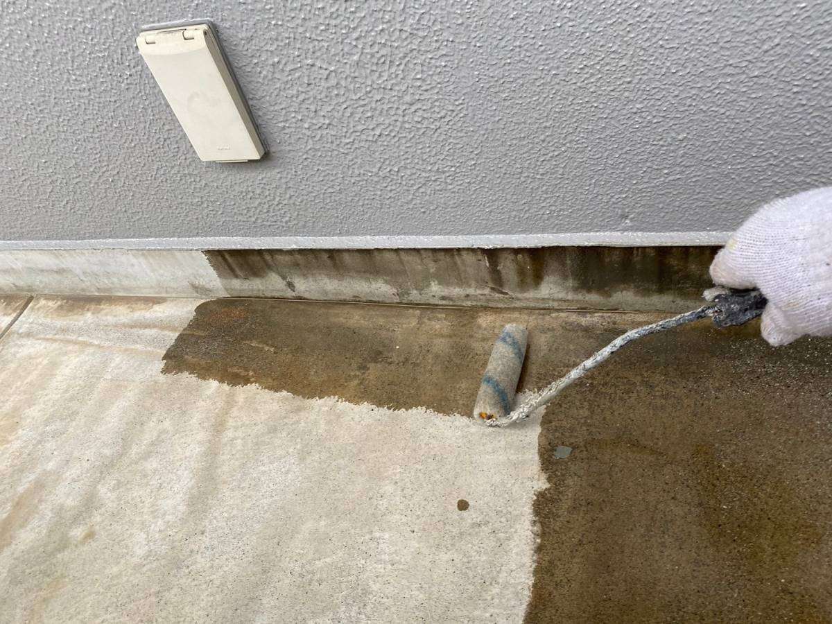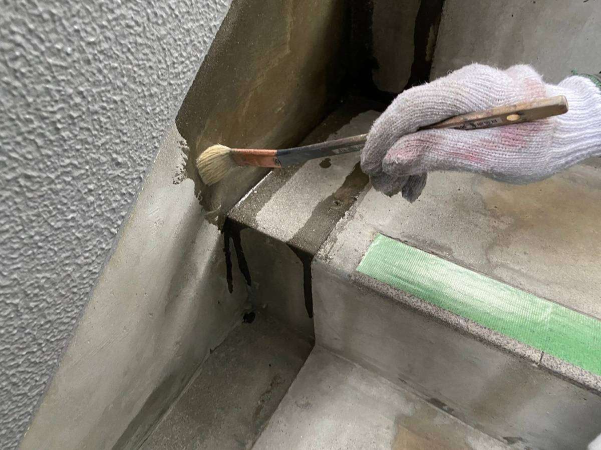 4階、通路の防水作業・階段通路のプライマー塗装作業・軒天塗装作業を行っていました。