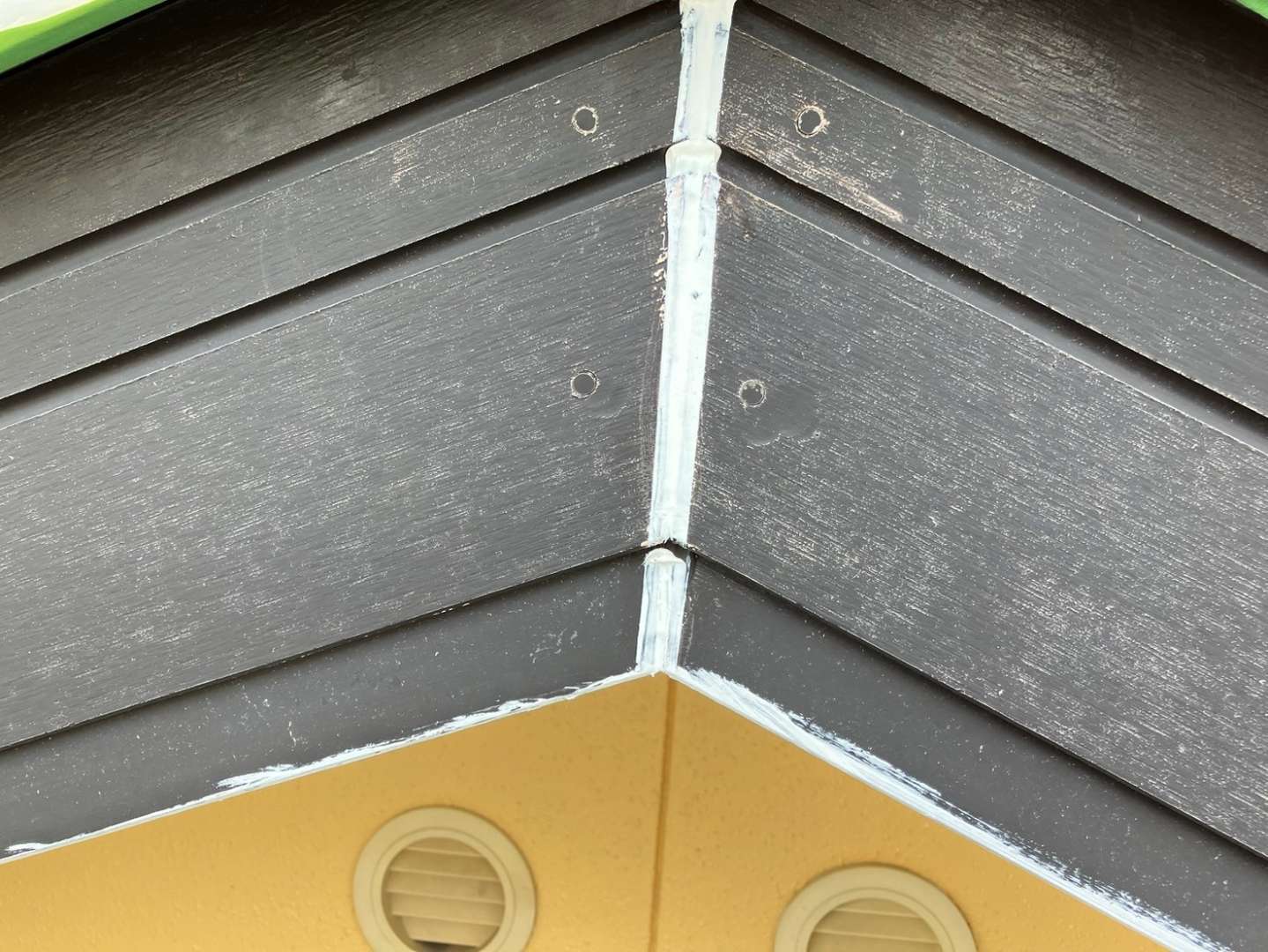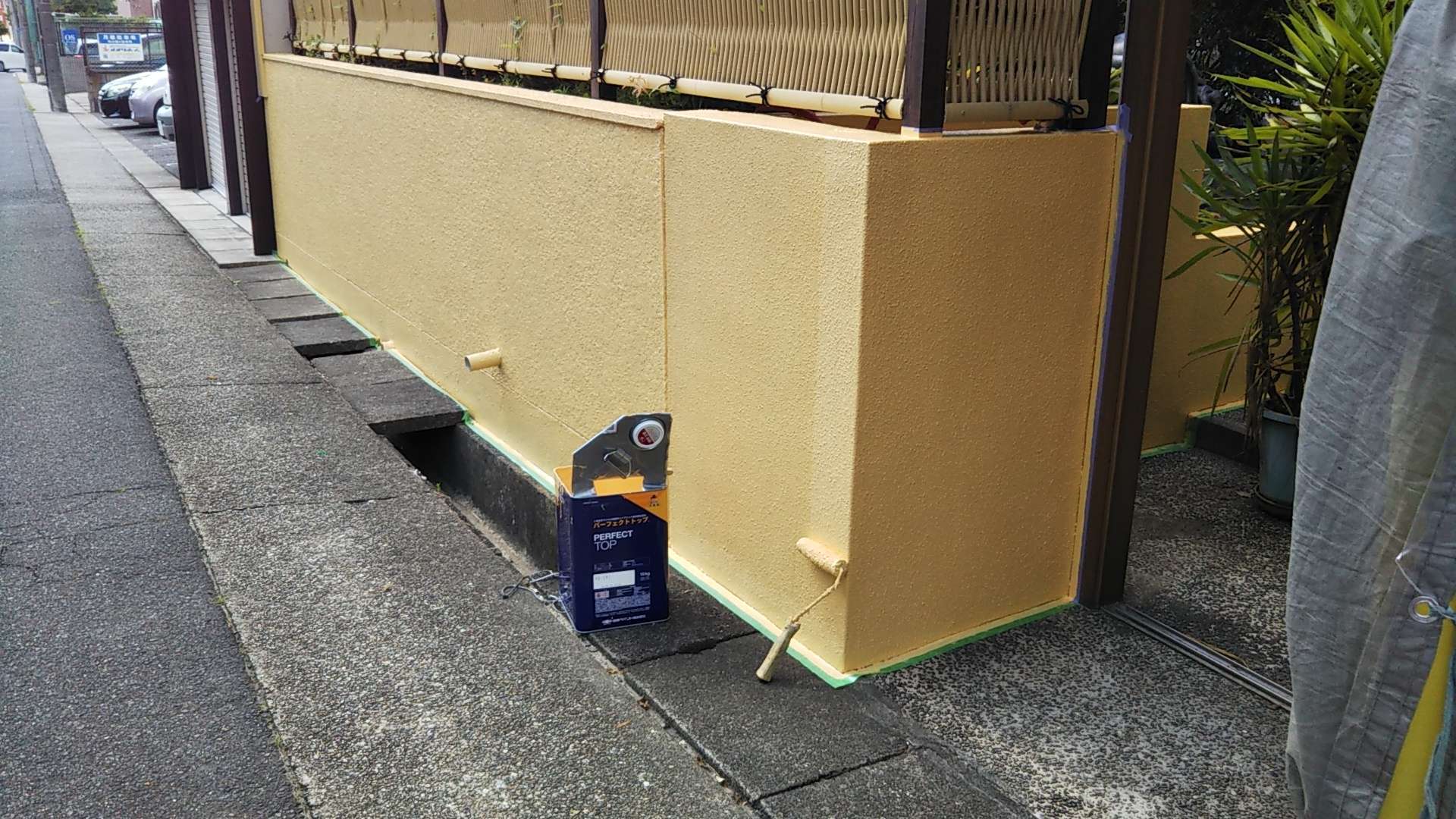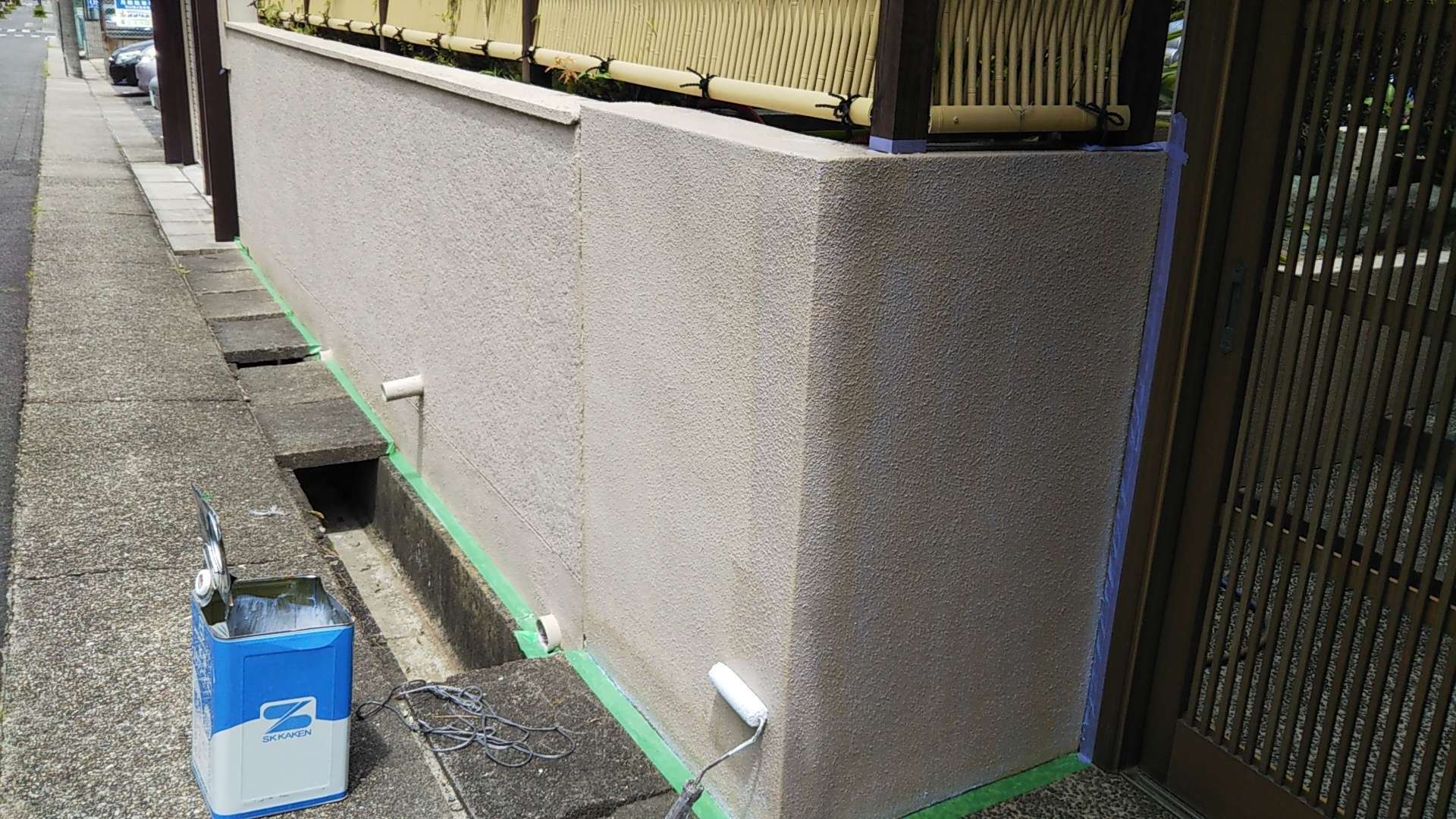 名東区のS様邸の昨日の作業内容は、外壁の上塗り塗装・破風板のコーキング(シーリング)・塀塗装作業を行っていました。