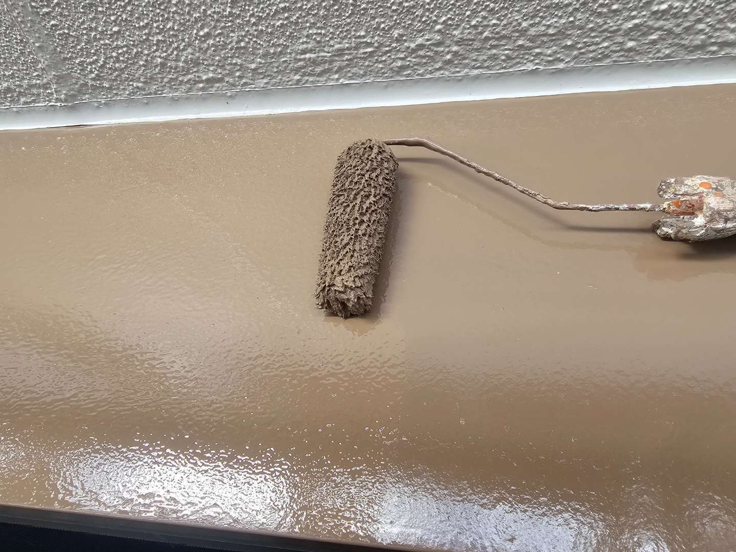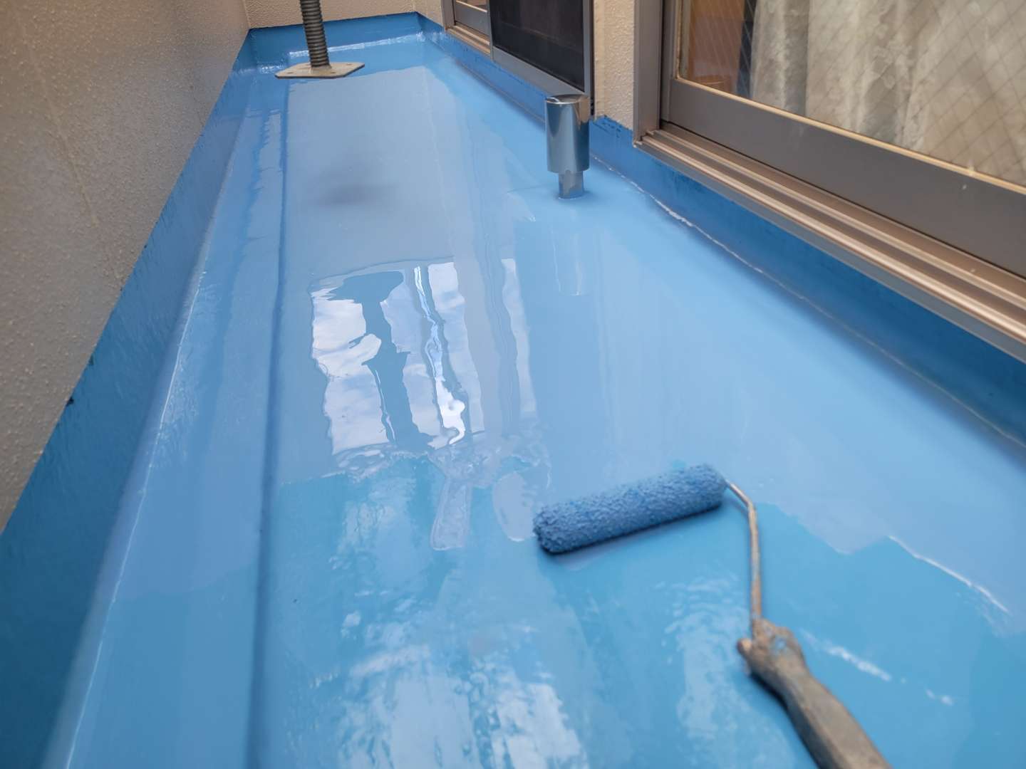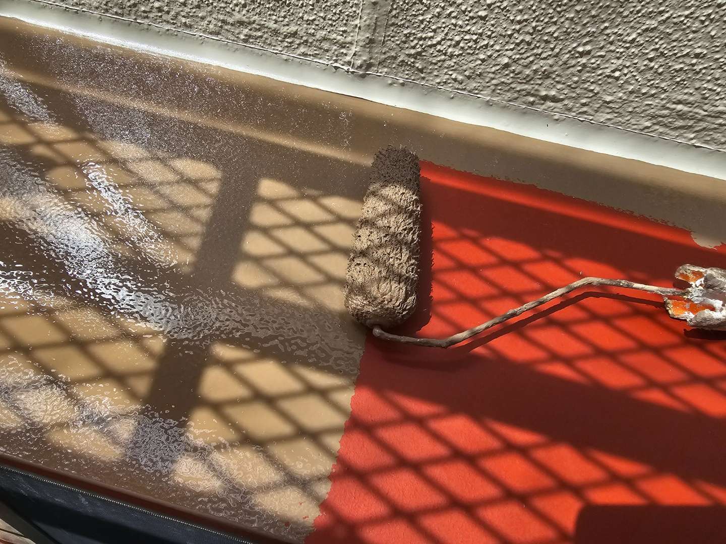 名古屋市北区のI様邸の昨日の作業内容は、付帯部塗装作業・ベランダ防水(ウレタン樹脂2層目塗装)作業を行っていました。
