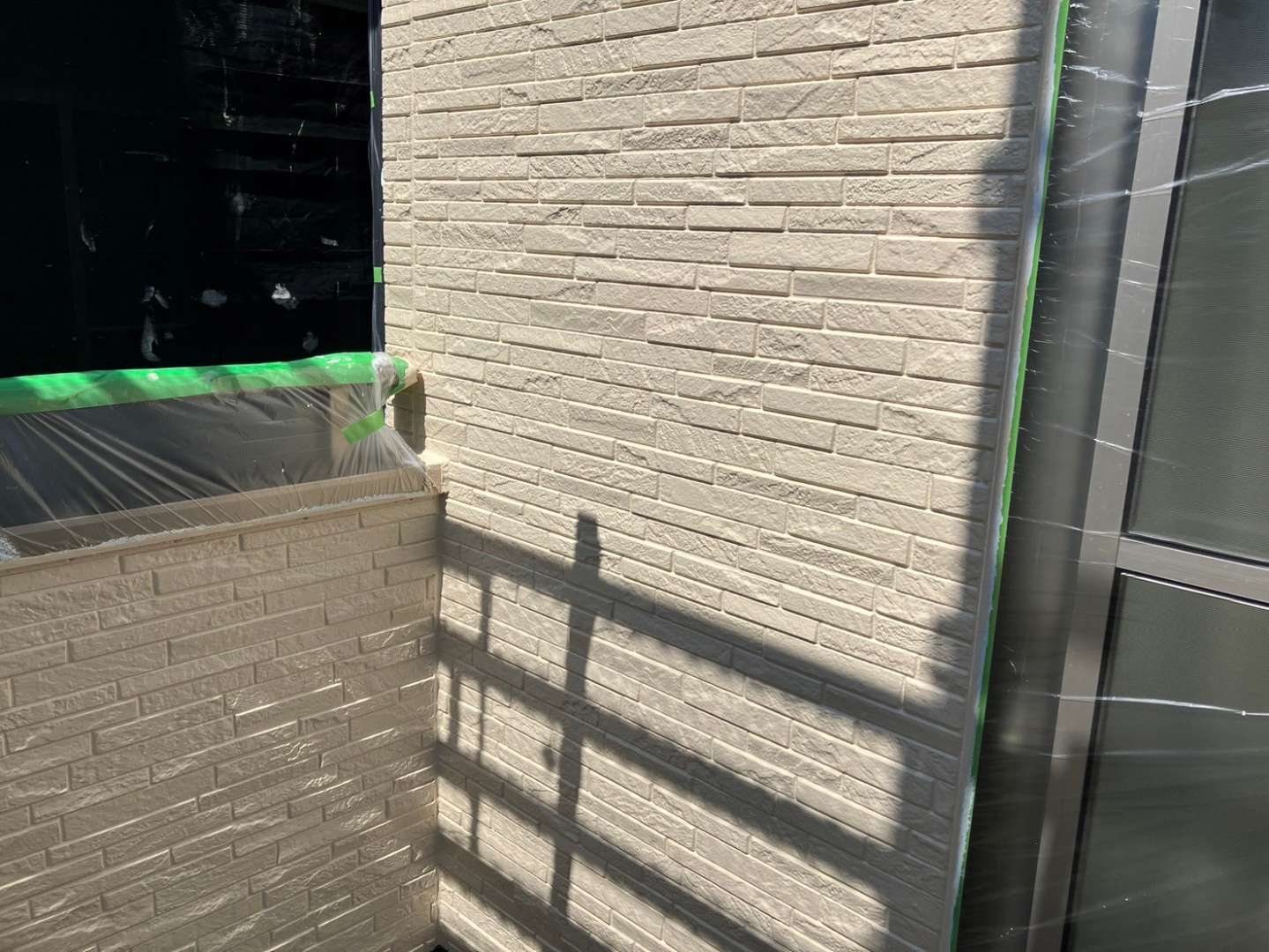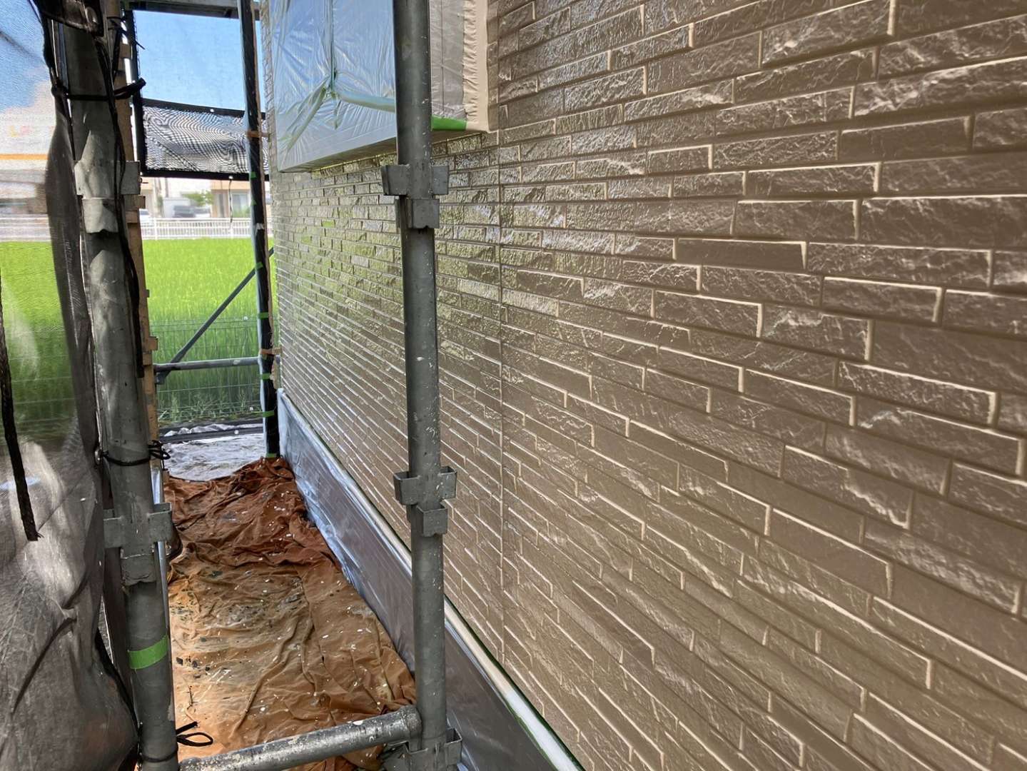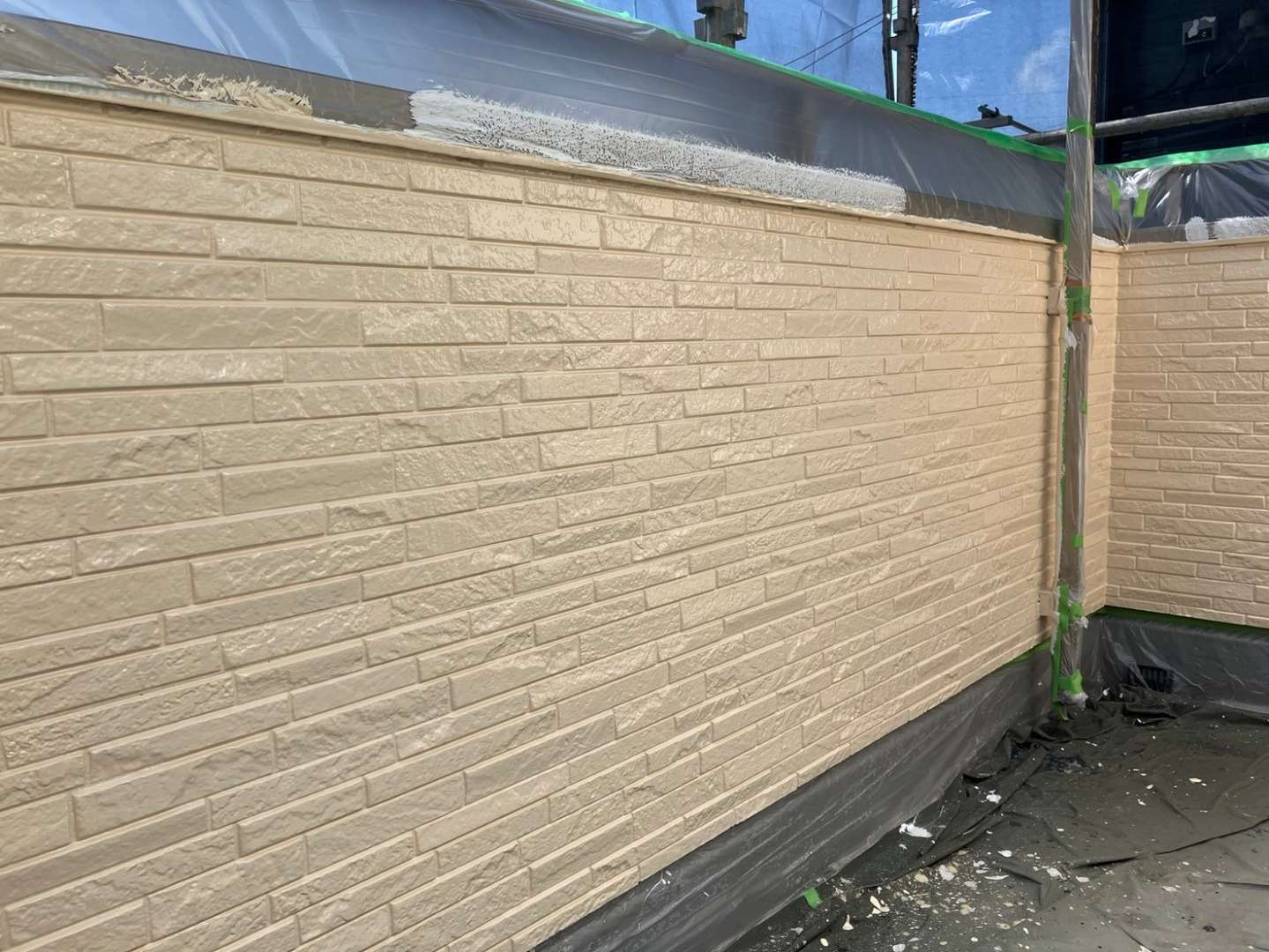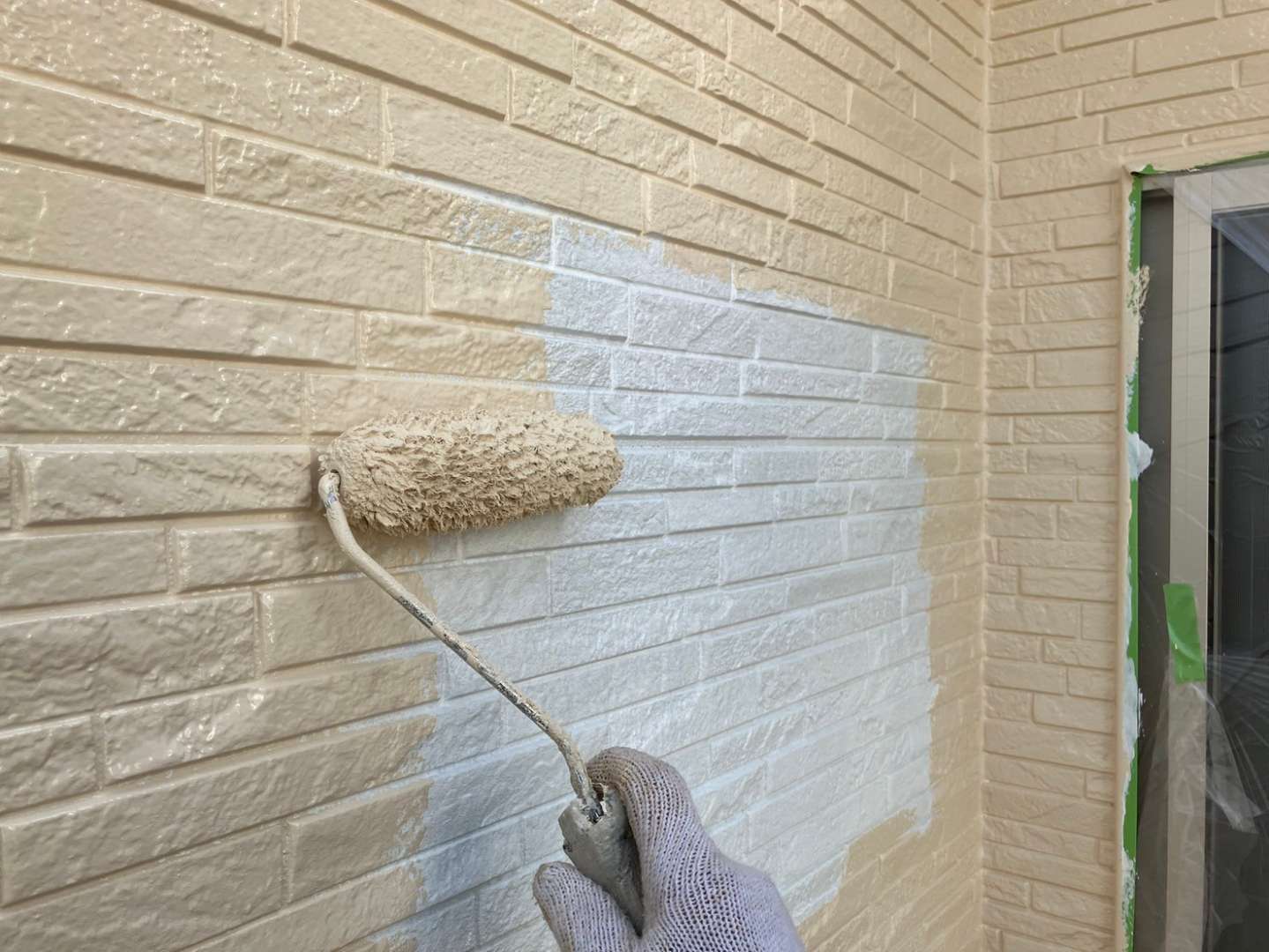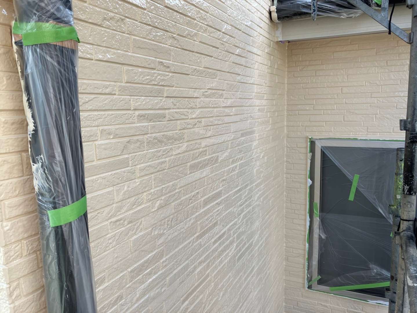 O様邸の今日の作業は、外壁の色替え部の中塗り塗装作業予定です。