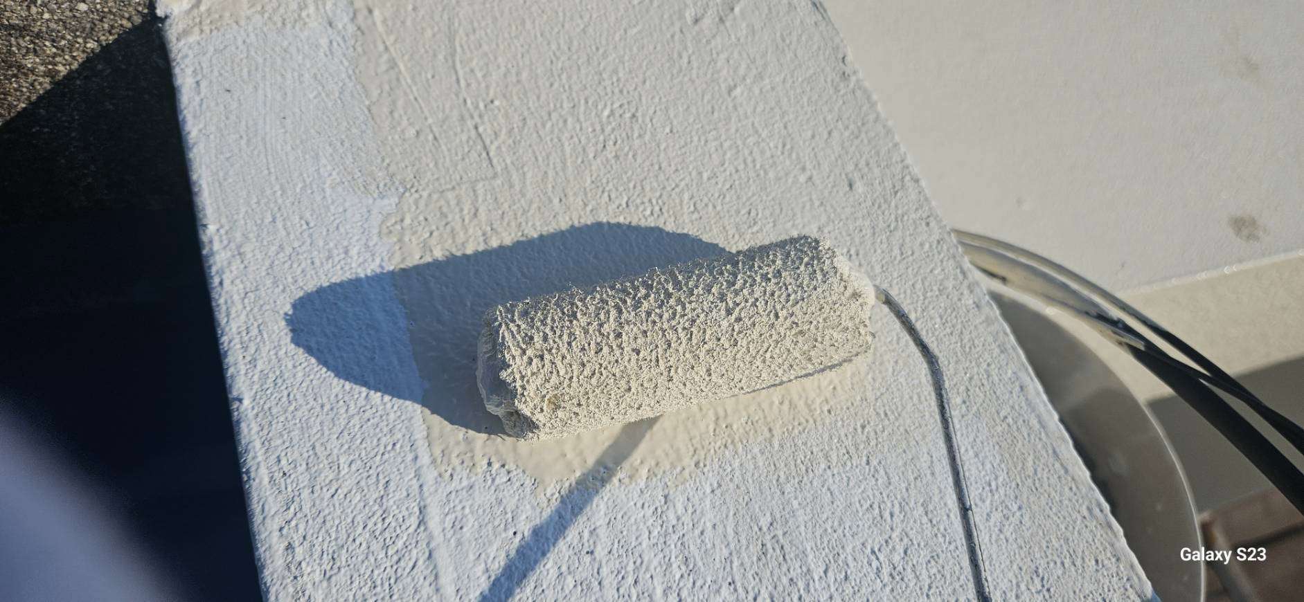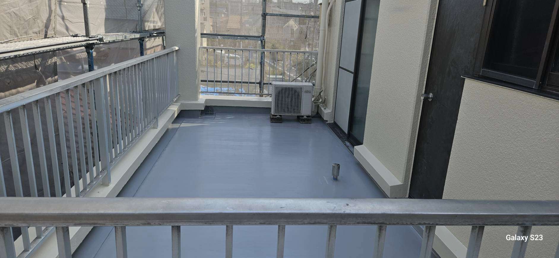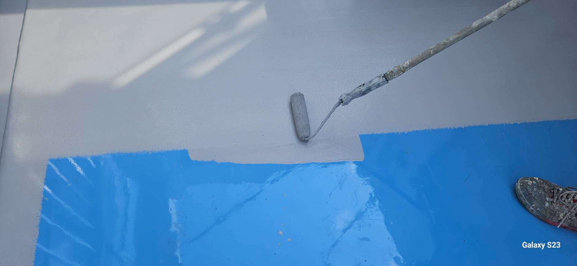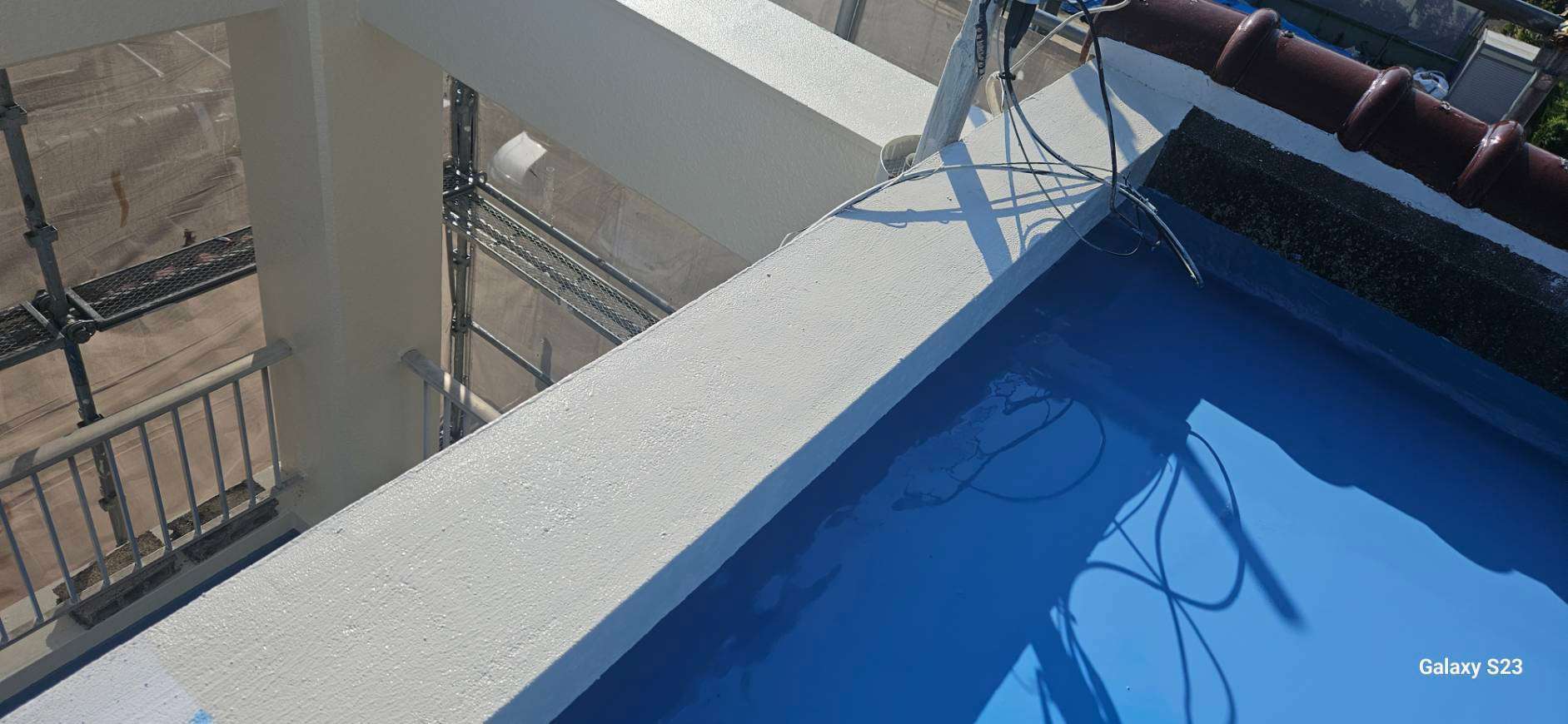 屋上防水作業のトップコート塗装作業と、ベランダ防水作業のトップコート塗装・笠木補修部分の上塗り塗装作業を行っていました。