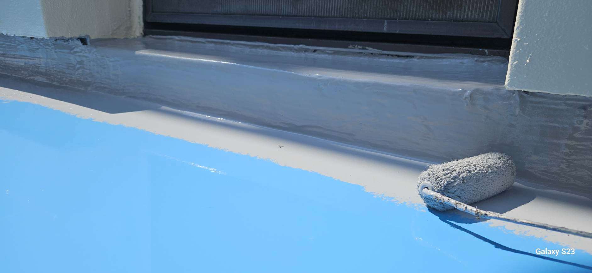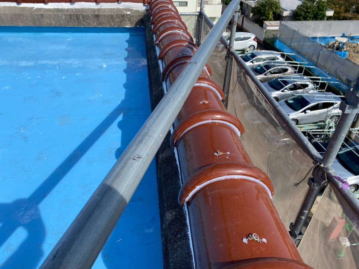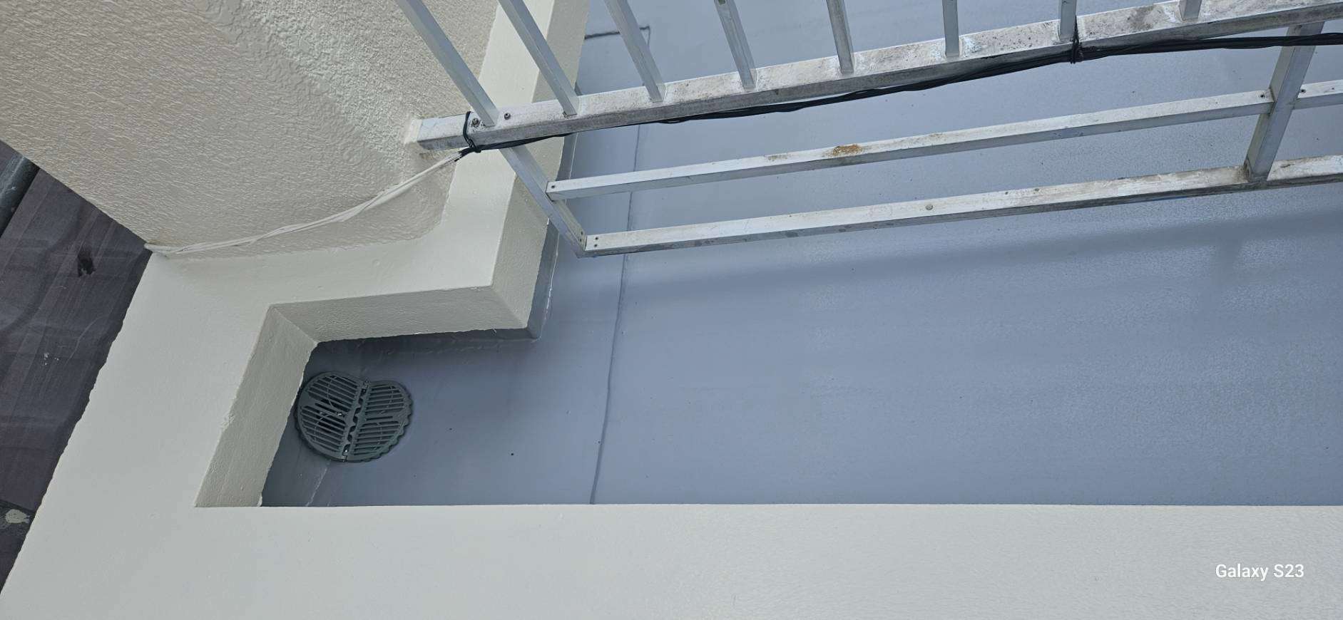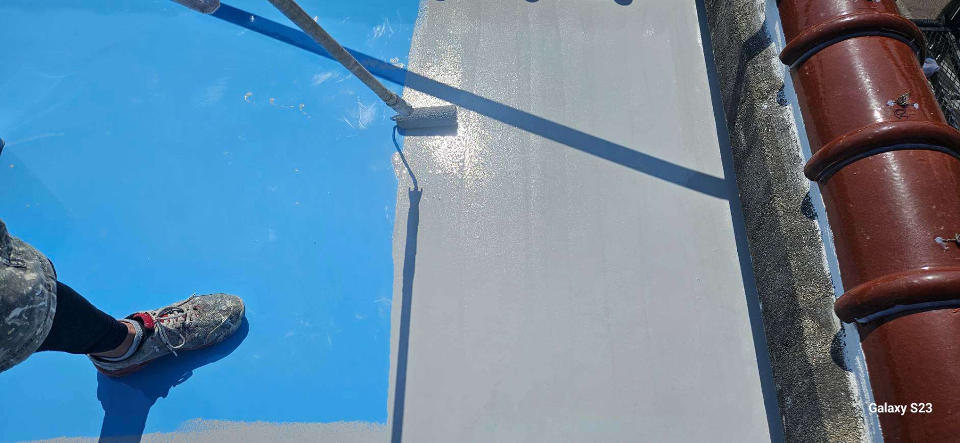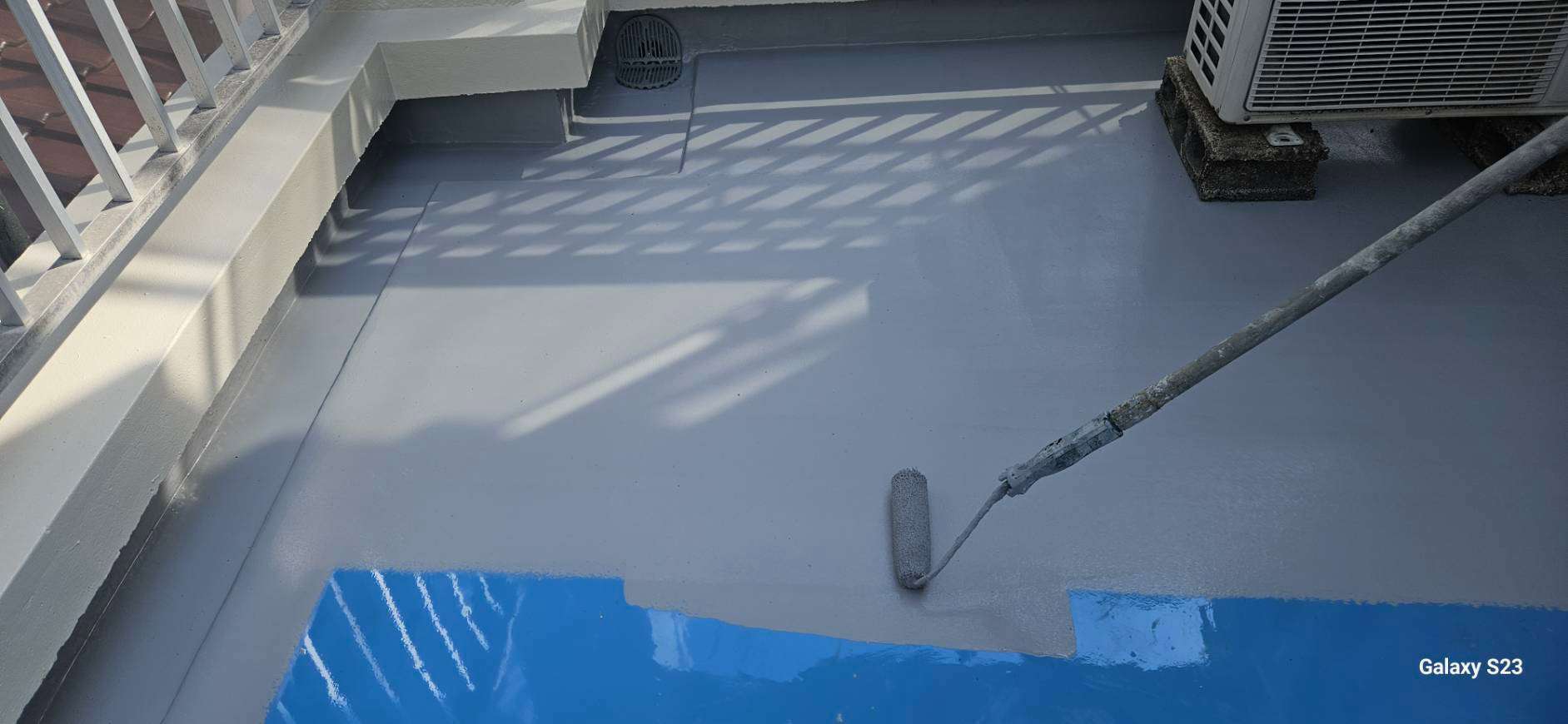 屋上防水作業のトップコート塗装作業と、ベランダ防水作業のトップコート塗装・笠木補修部分の上塗り塗装作業を行っていました。