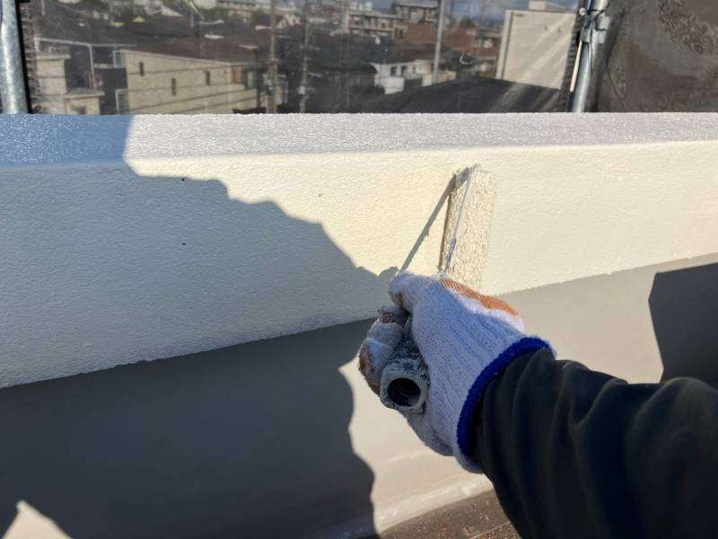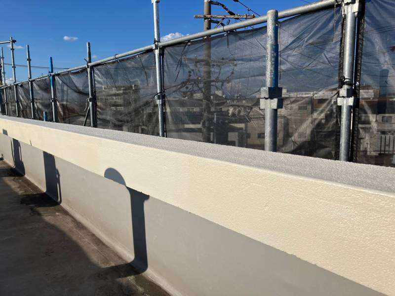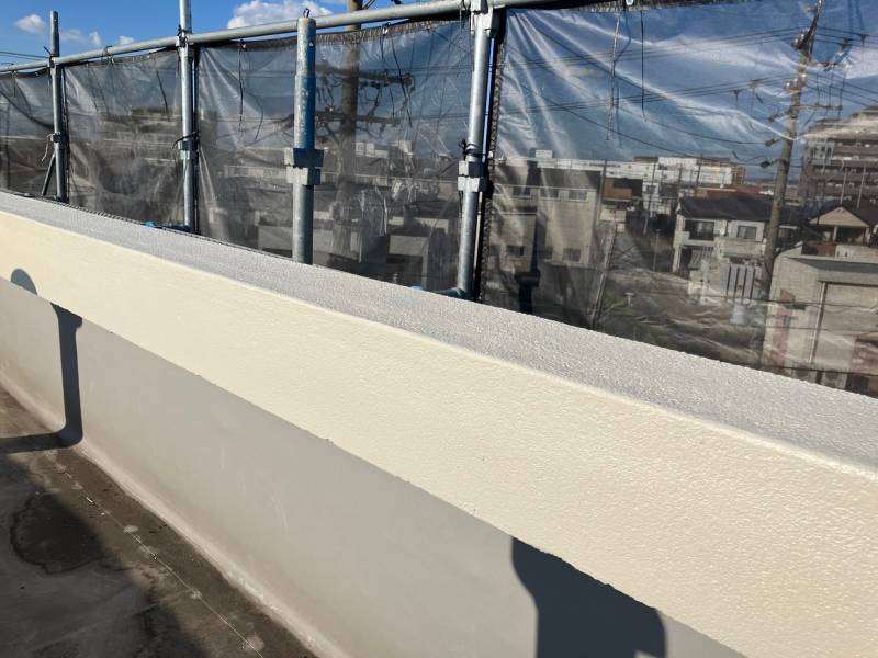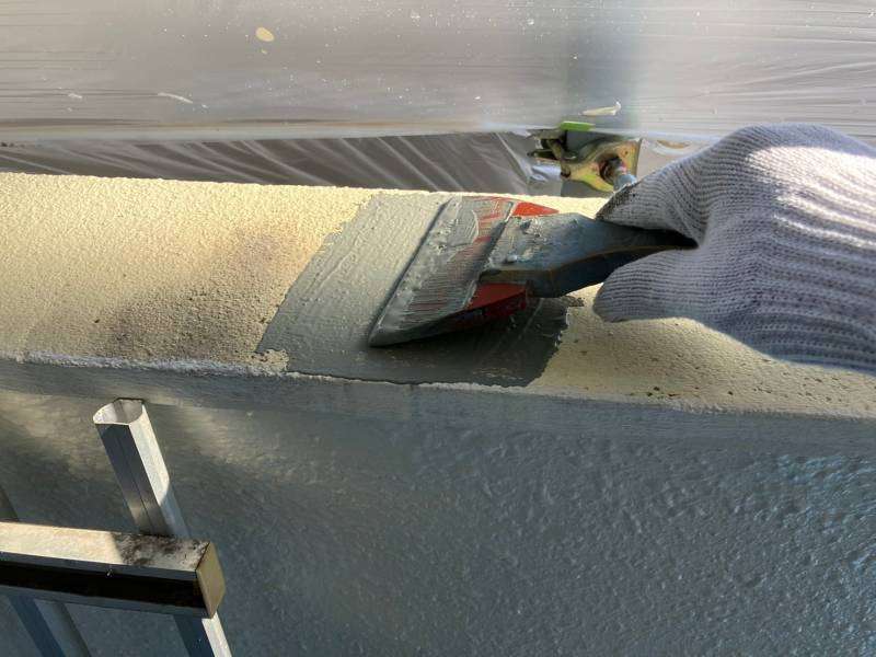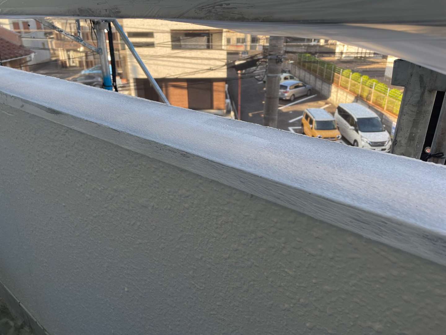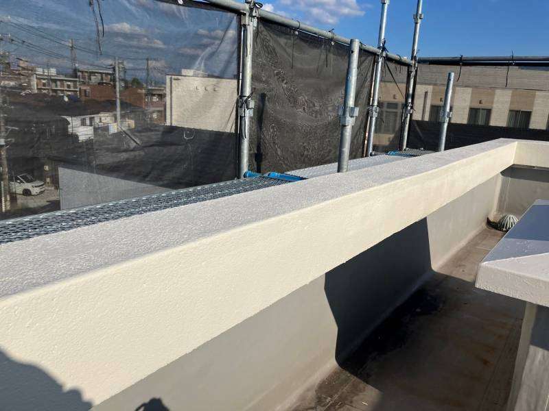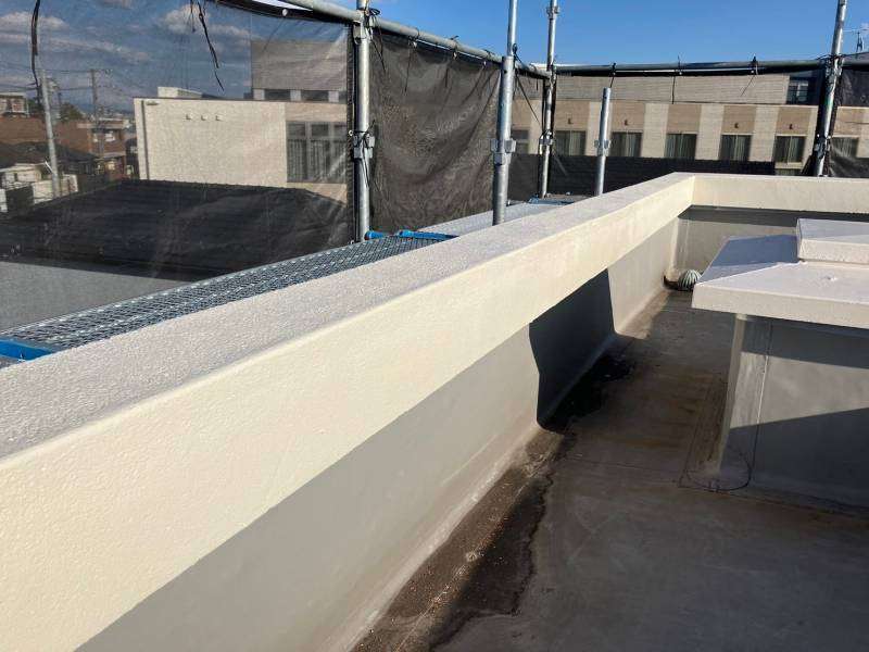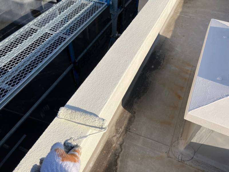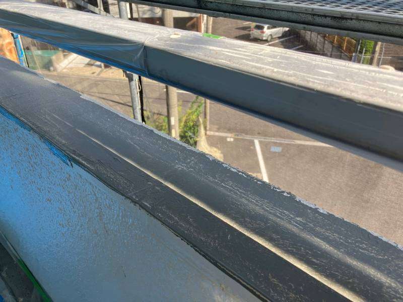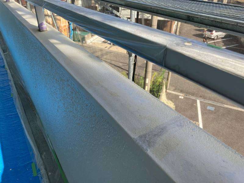 屋上の笠木付帯部塗装・通路の笠木部の亀裂部補修作業・通路の塗装作業を行っていました。