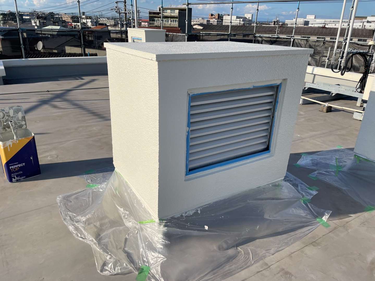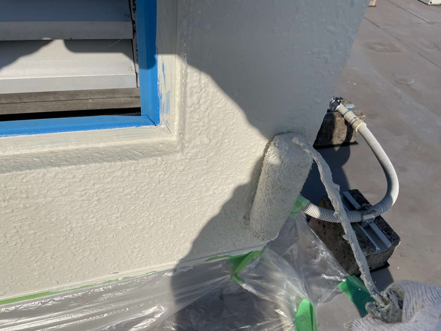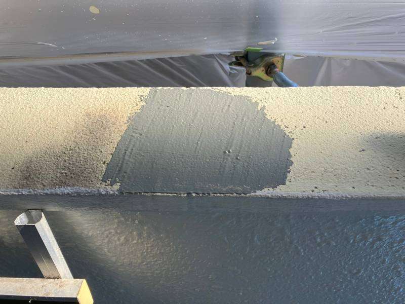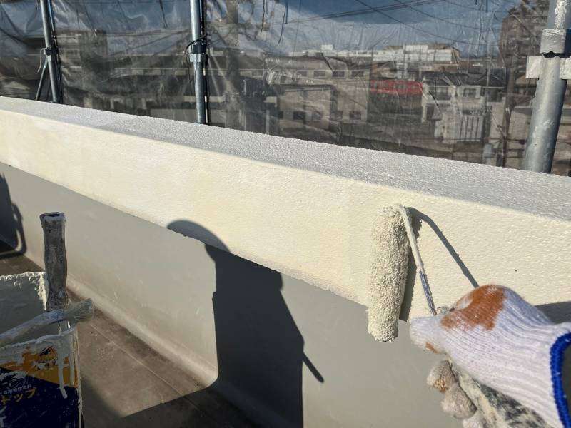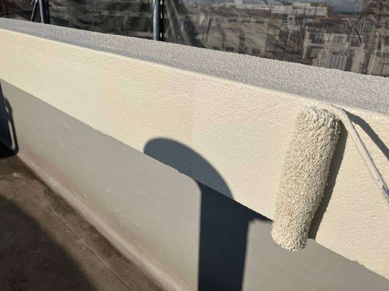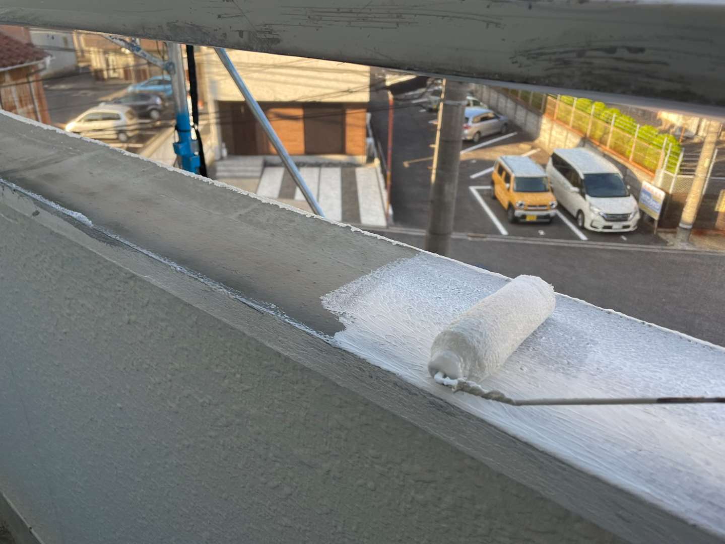 屋上の笠木付帯部塗装・通路の笠木部の亀裂部補修作業・通路の塗装作業を行っていました。