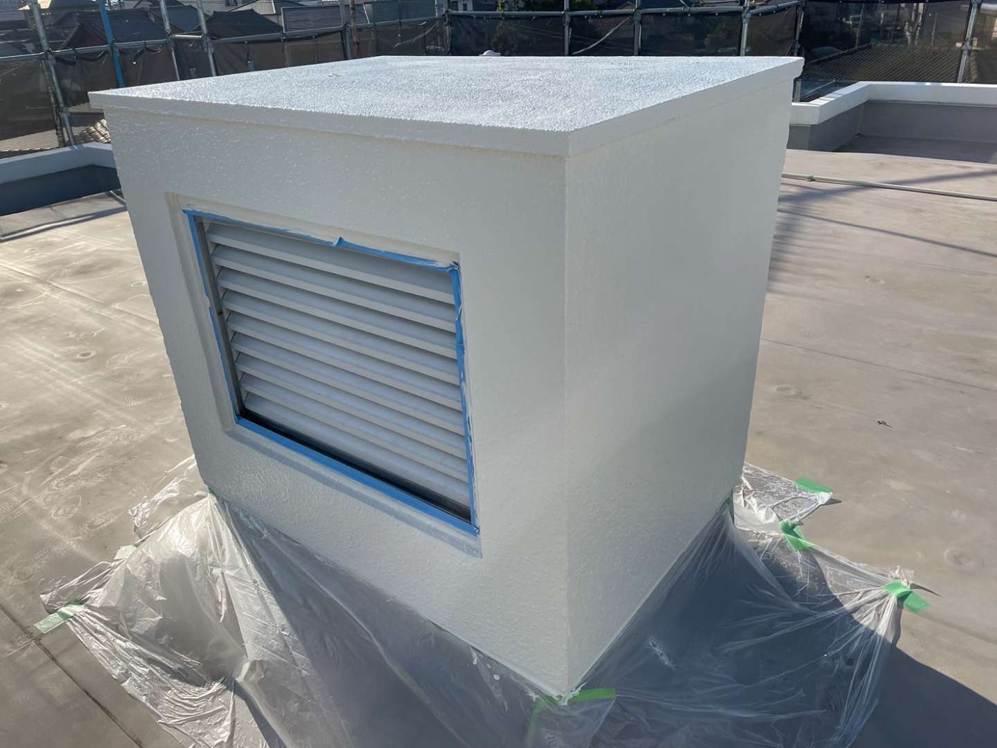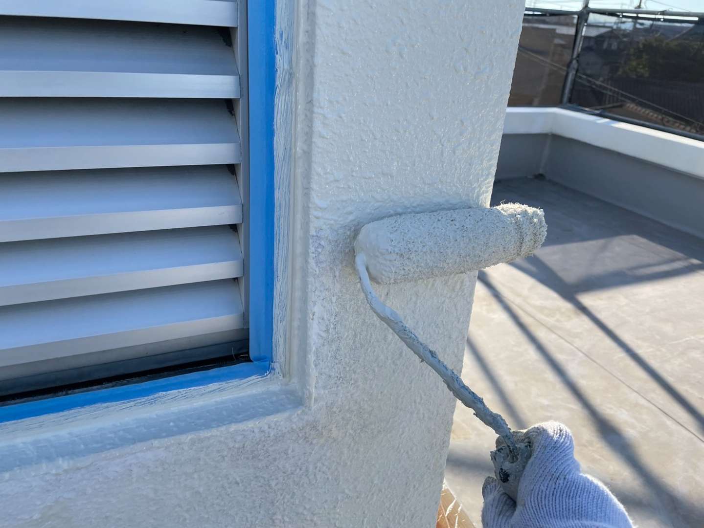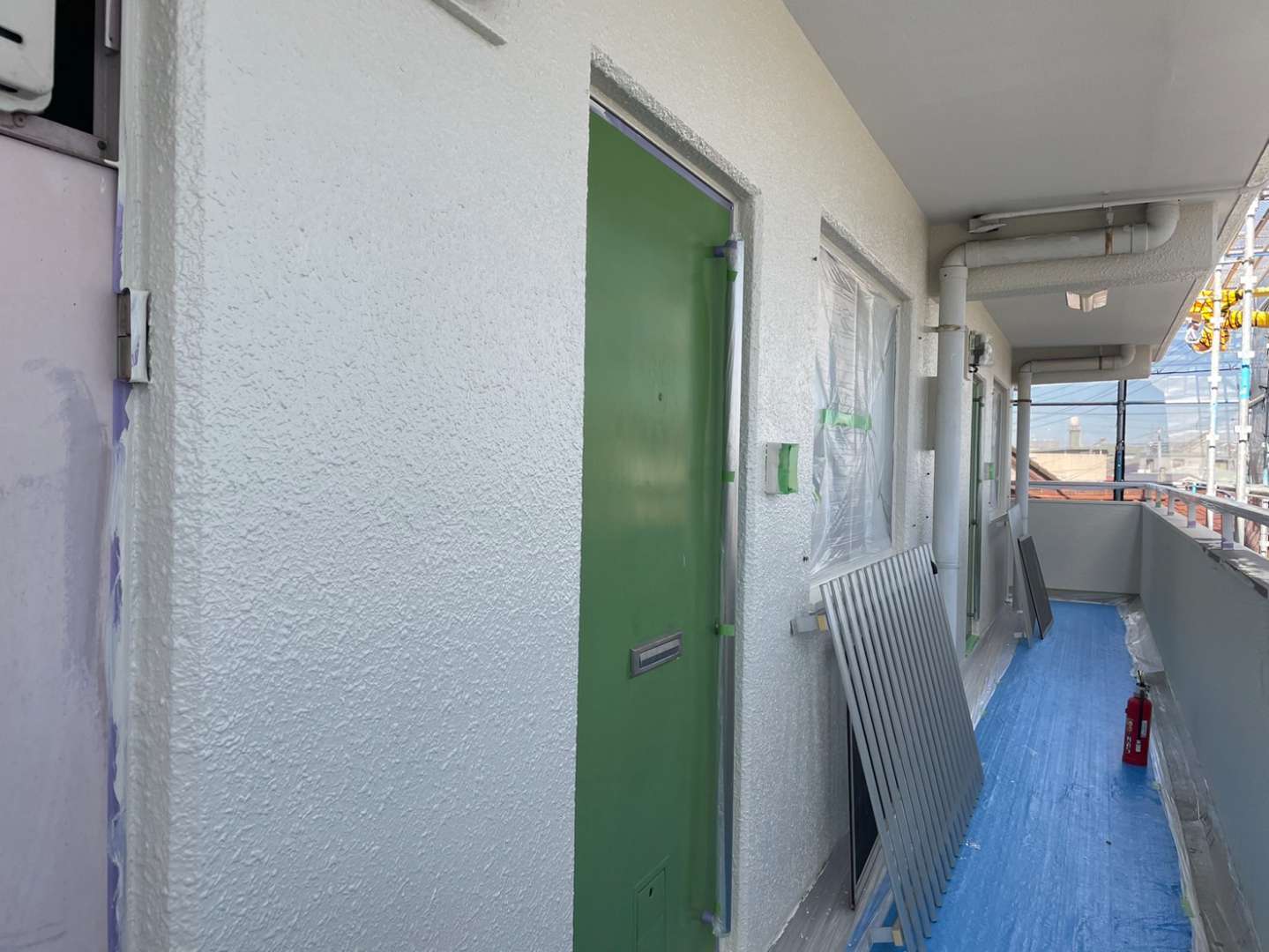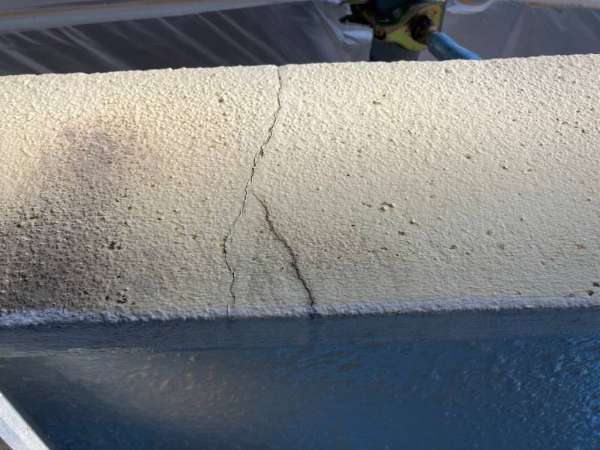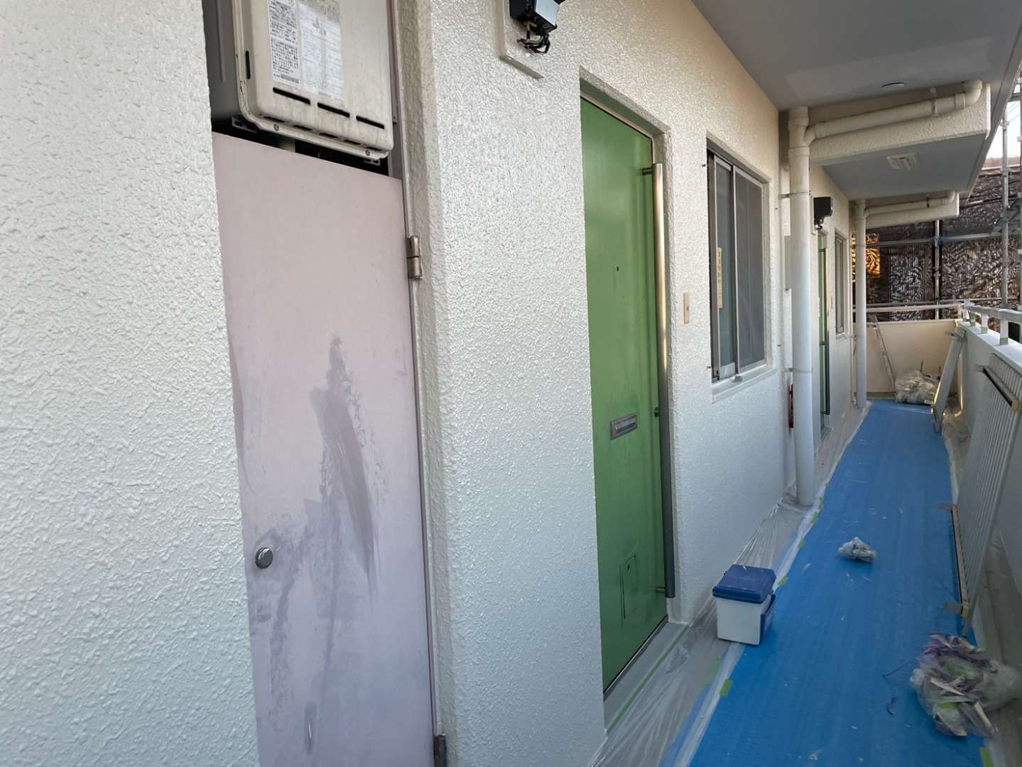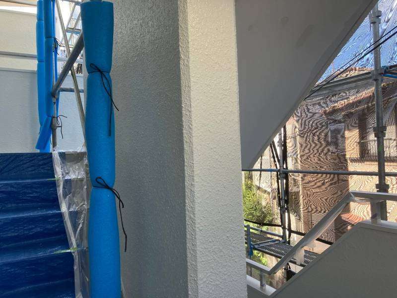 屋上の笠木付帯部塗装・通路の笠木部の亀裂部補修作業・通路の塗装作業を行っていました。