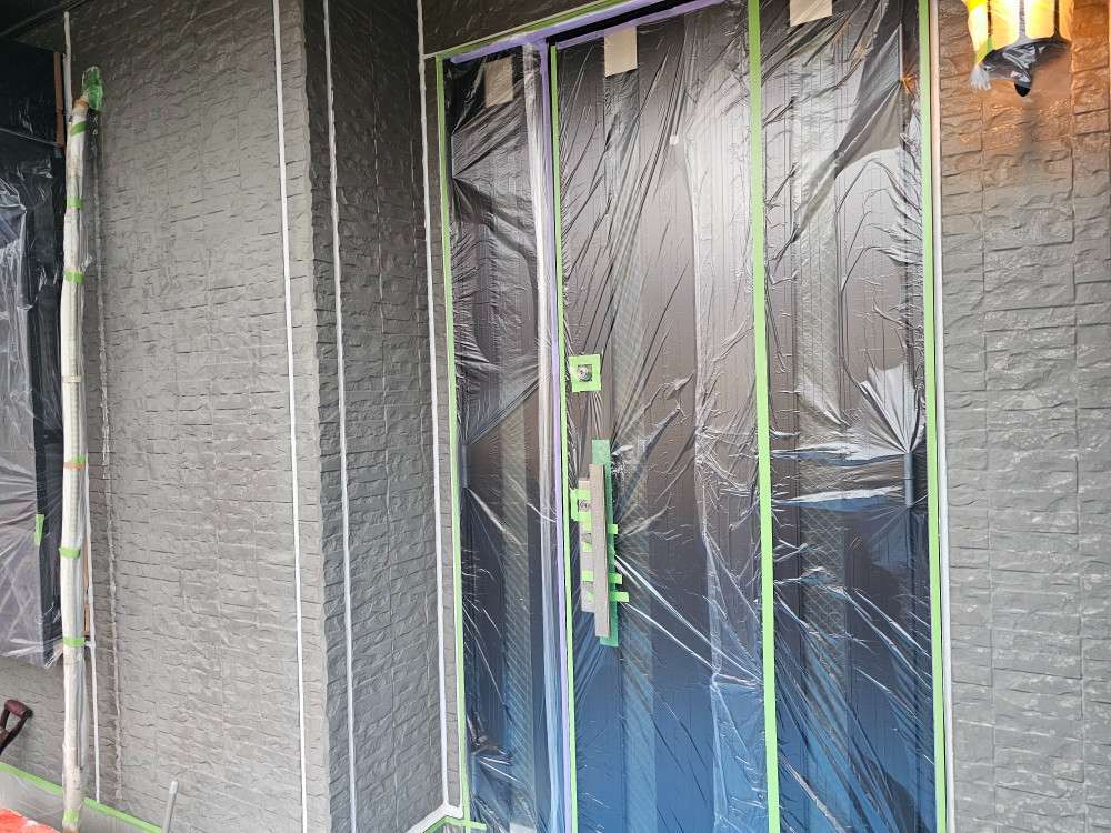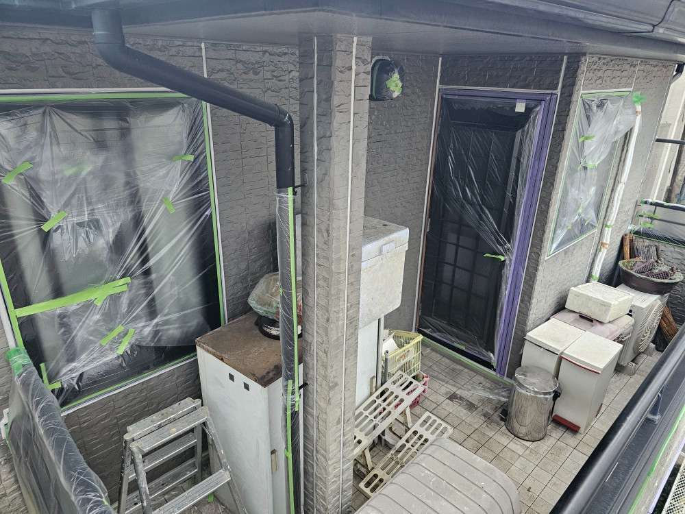 千種区T様邸の昨日の作業内容は、外壁の補修作業、養生作業、エアコンの配管カバー外し作業、屋根カバー工法の換気棟取付け等の作業を行っています。