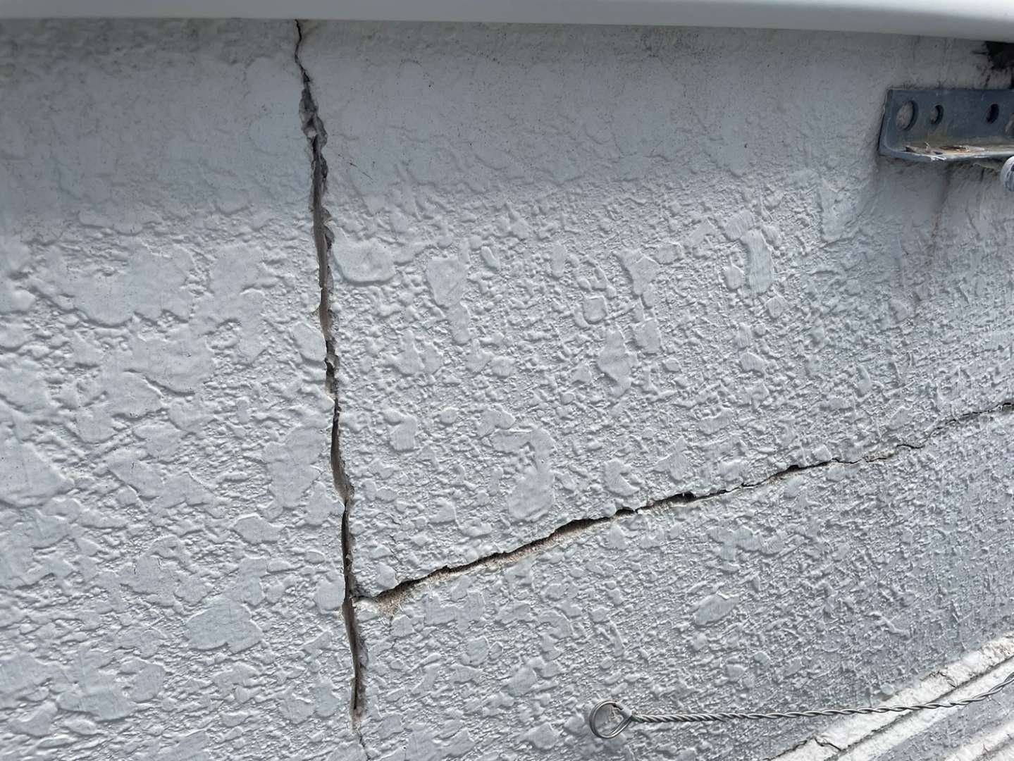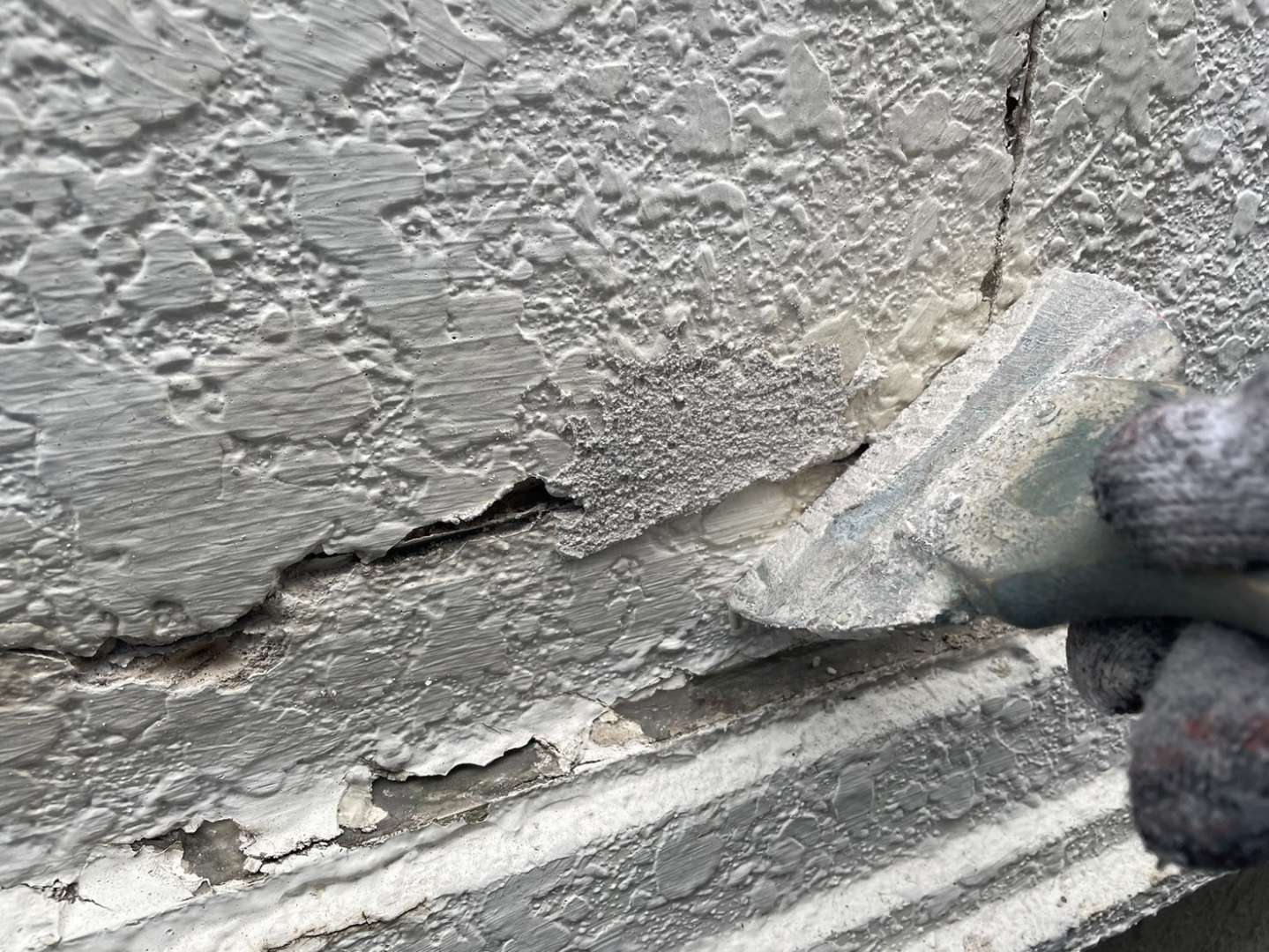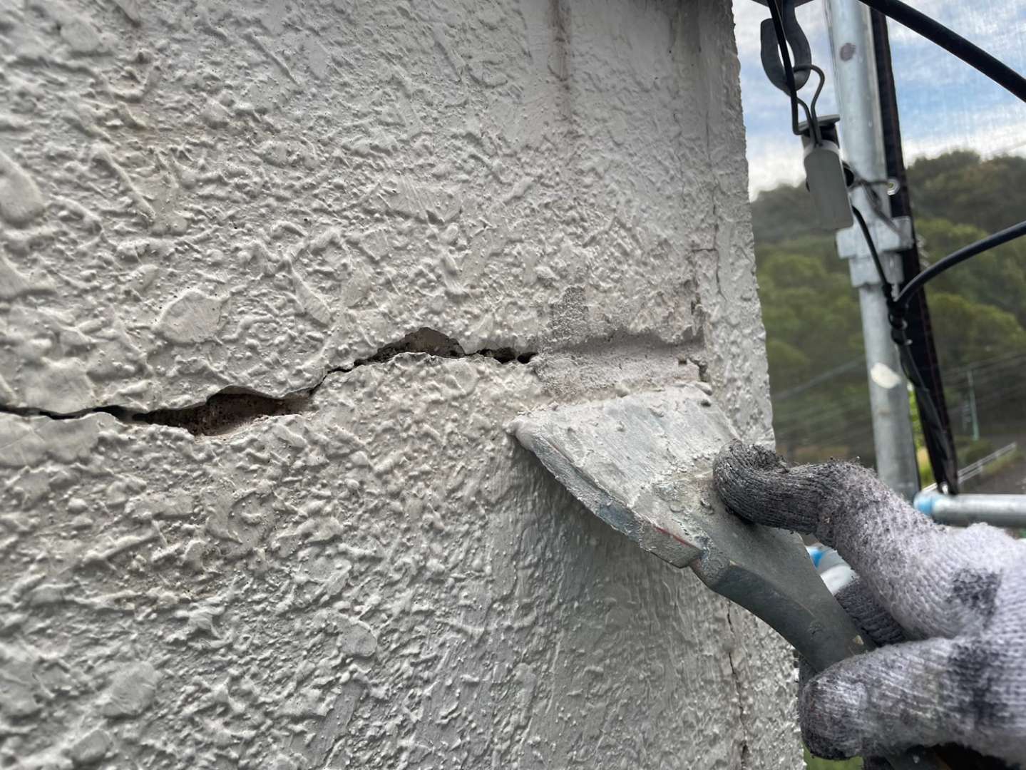 今日の作業は、劣化亀裂補修部の柄付け・下塗り塗装作業予定です。