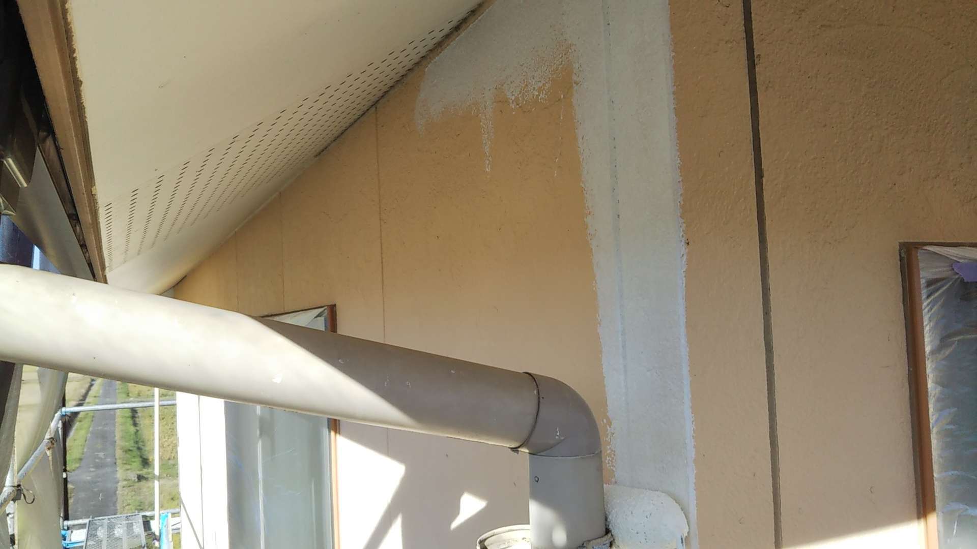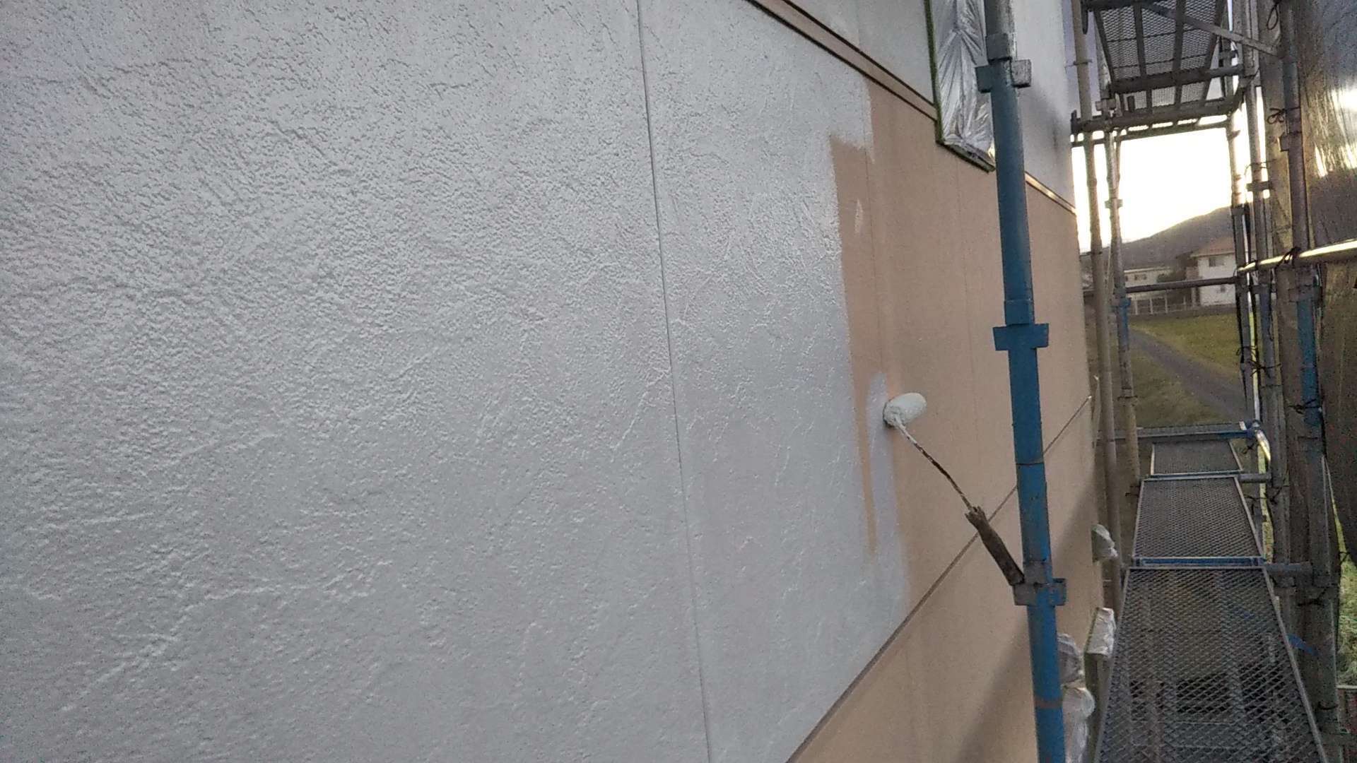 今日の作業は、前日に引き続き外壁の下塗り塗装作業を行っています。