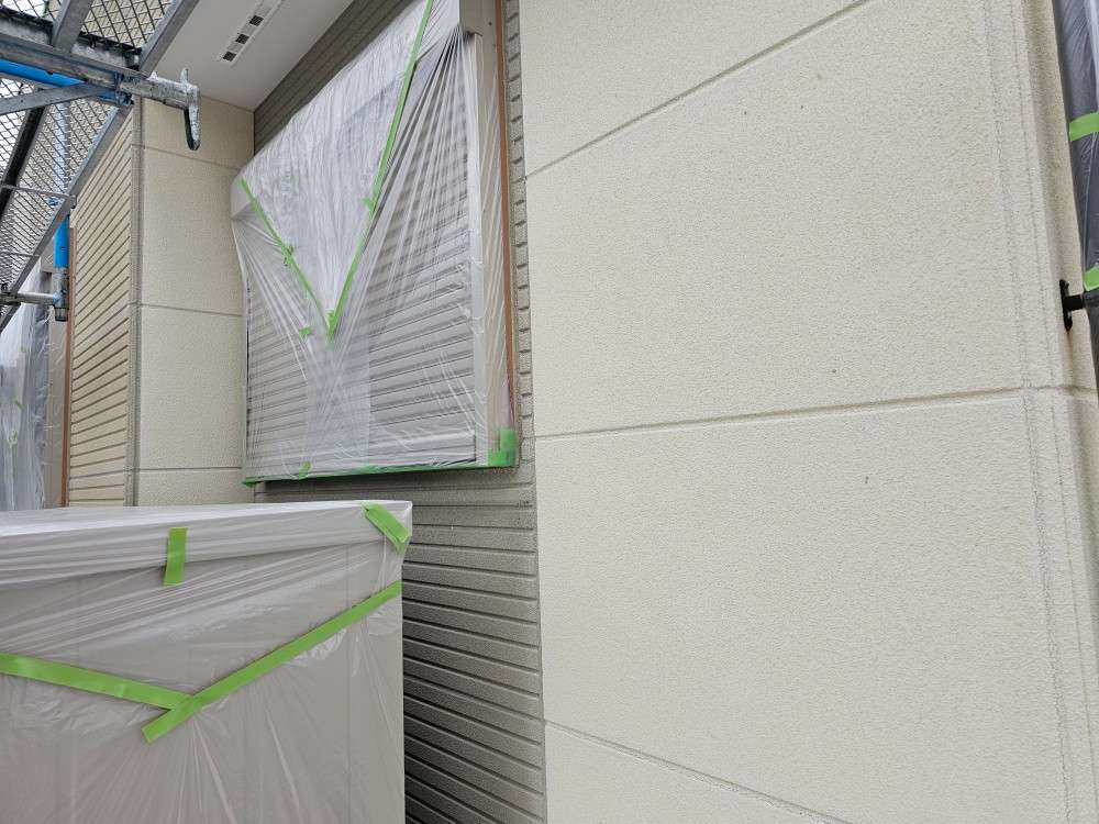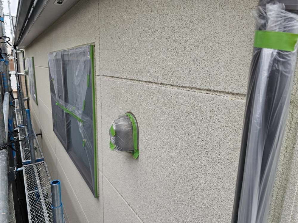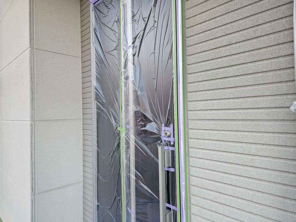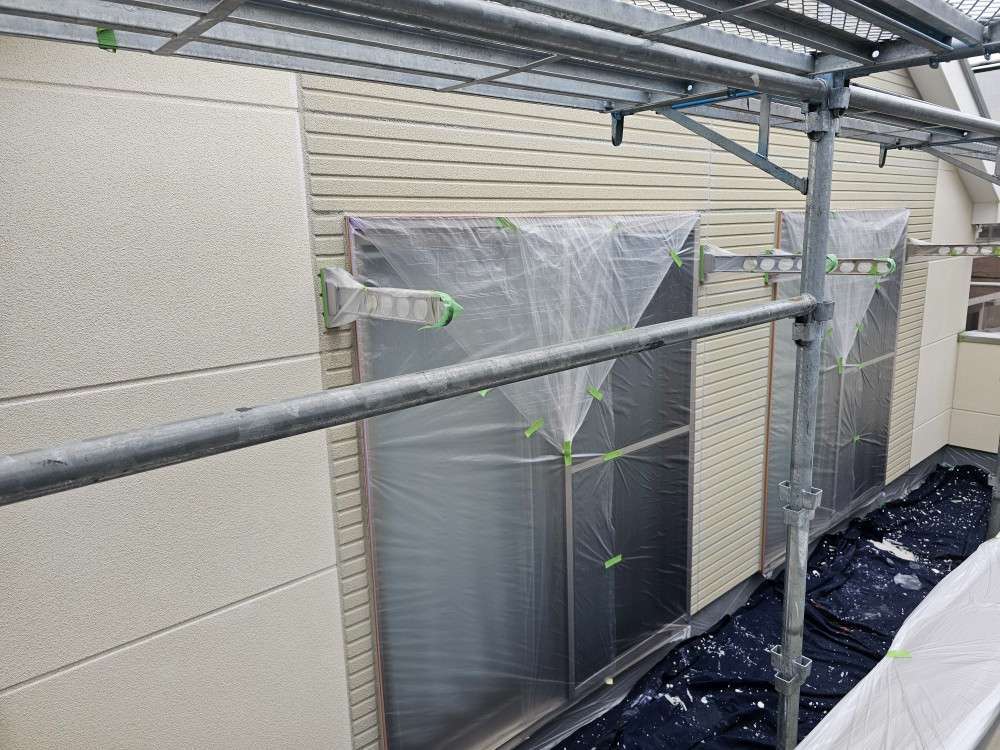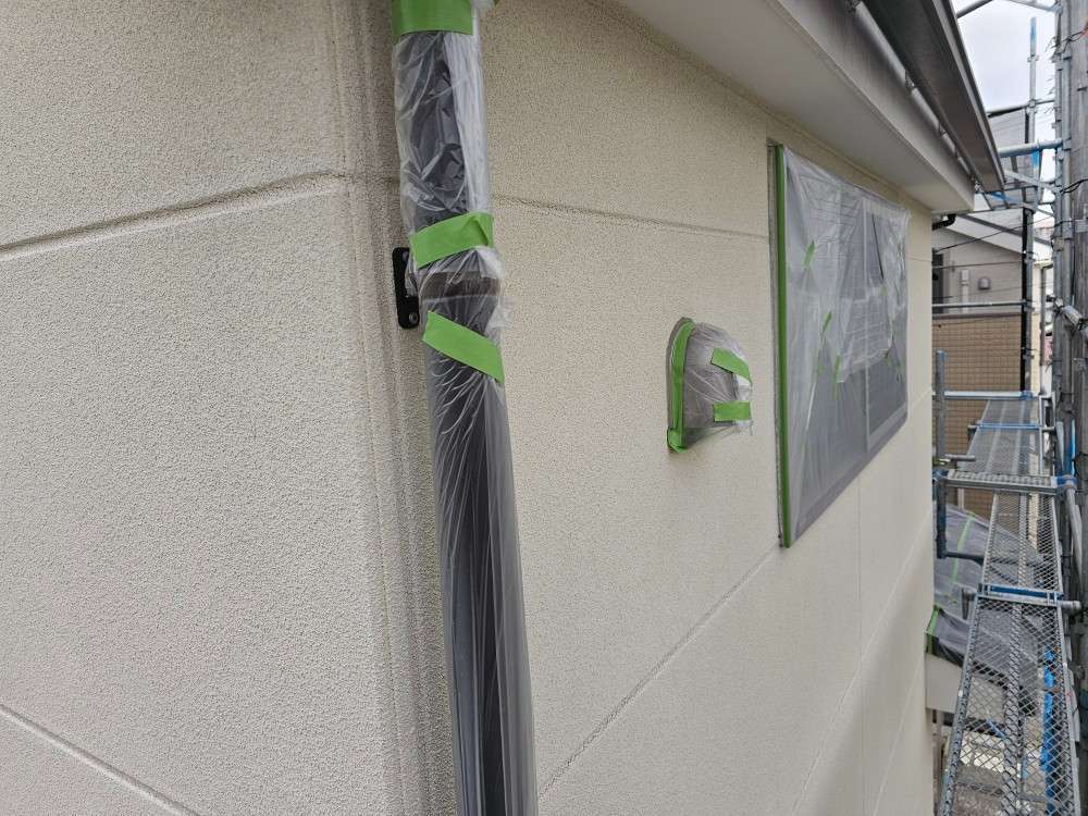 名古屋市名東区 K様邸 外壁塗り替え工事 洗浄作業が終わり、今日は養生作業です! 洗浄作...