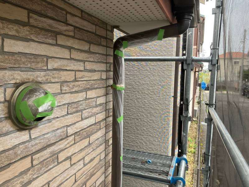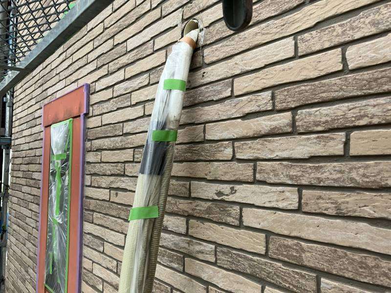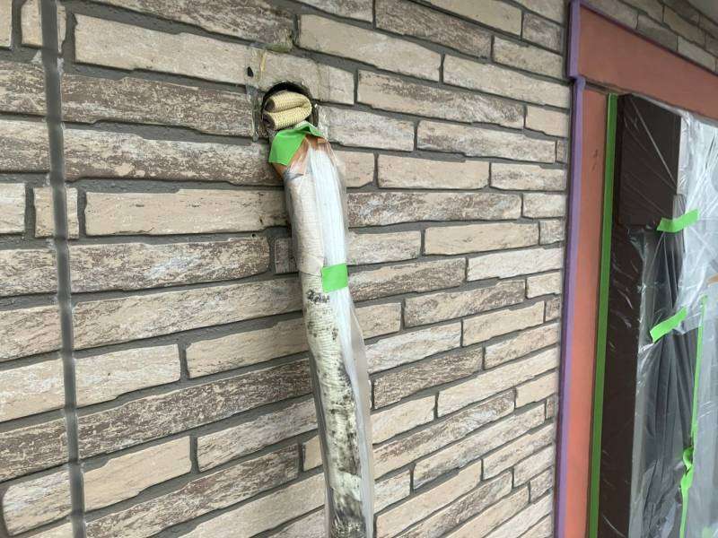 小牧市S様邸の昨日の作業内容は、外壁塗装の為、エアコン配管カバー外してから、塗装時塗料が付着しない様に養生作業を行っています。