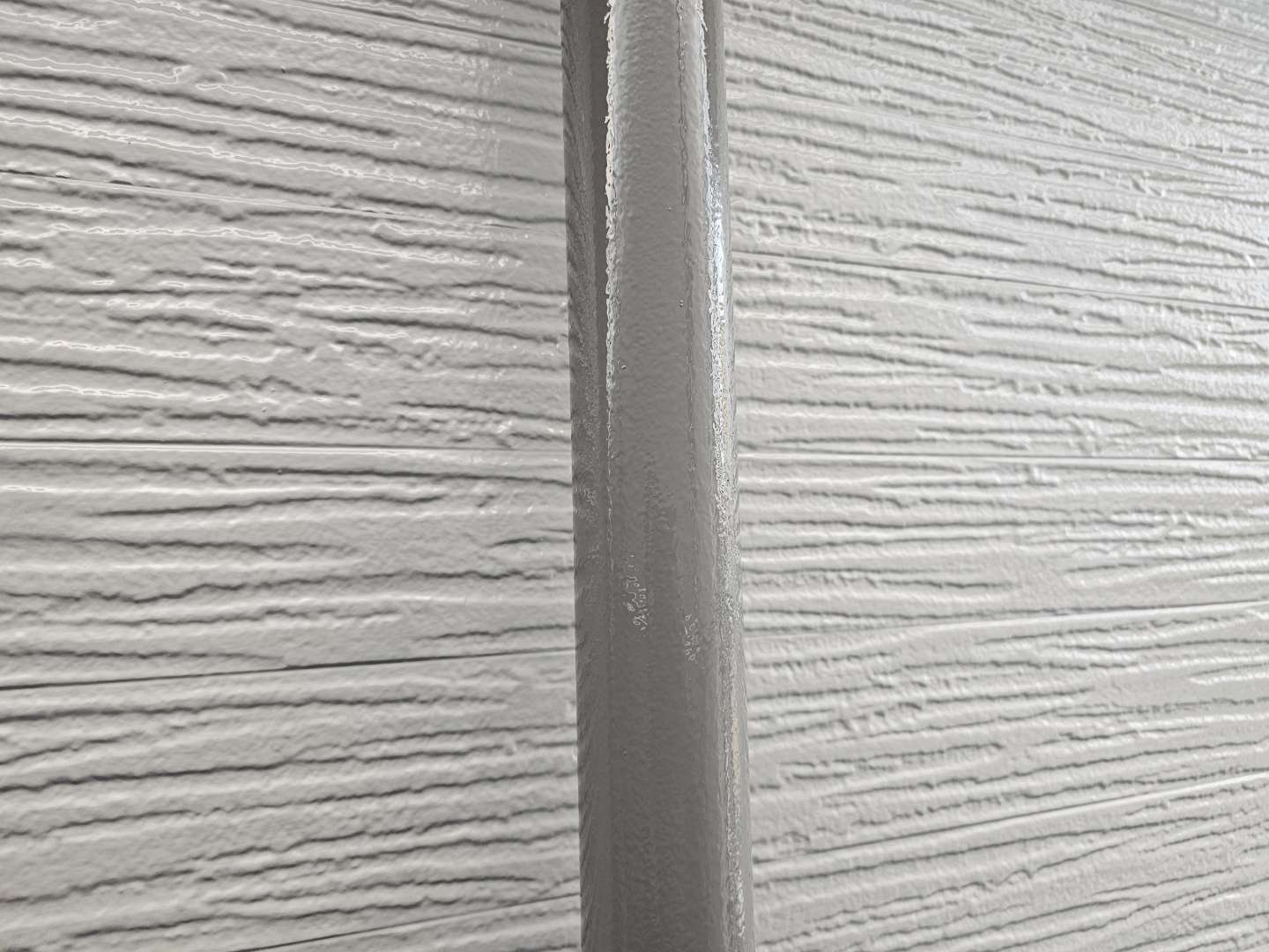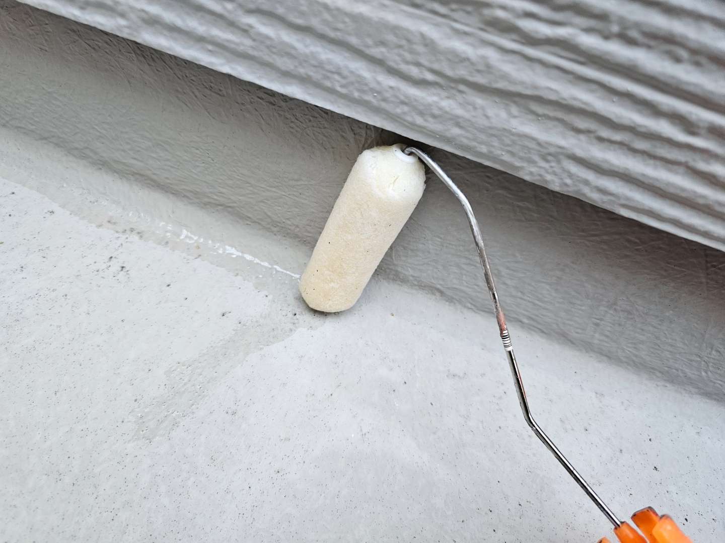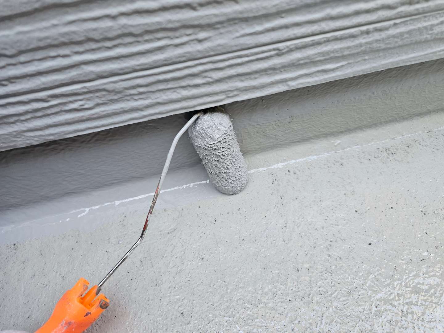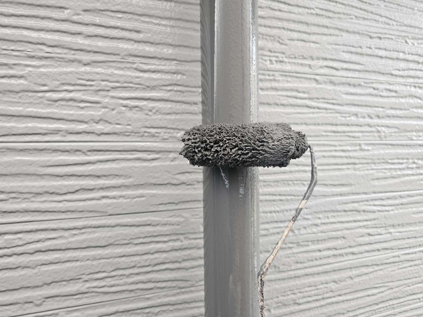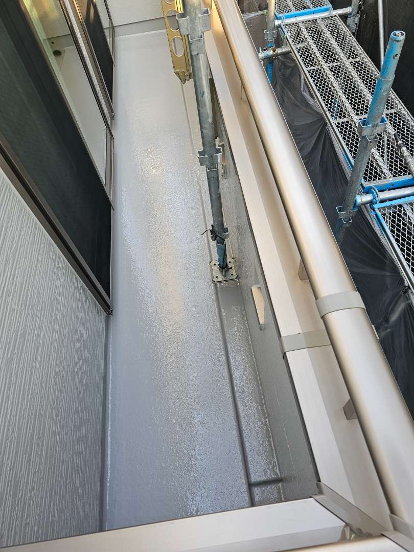 北区F様邸の昨日の作業内容は、付帯部雨樋の上塗り2回目塗装、ベランダFRP防水用のプライマー塗装とウレアックス1層目塗装、コーキング(シーリング)打替え、増し打ち作業の旧シーリング材の撤去とテープ貼り作業を行っていました。