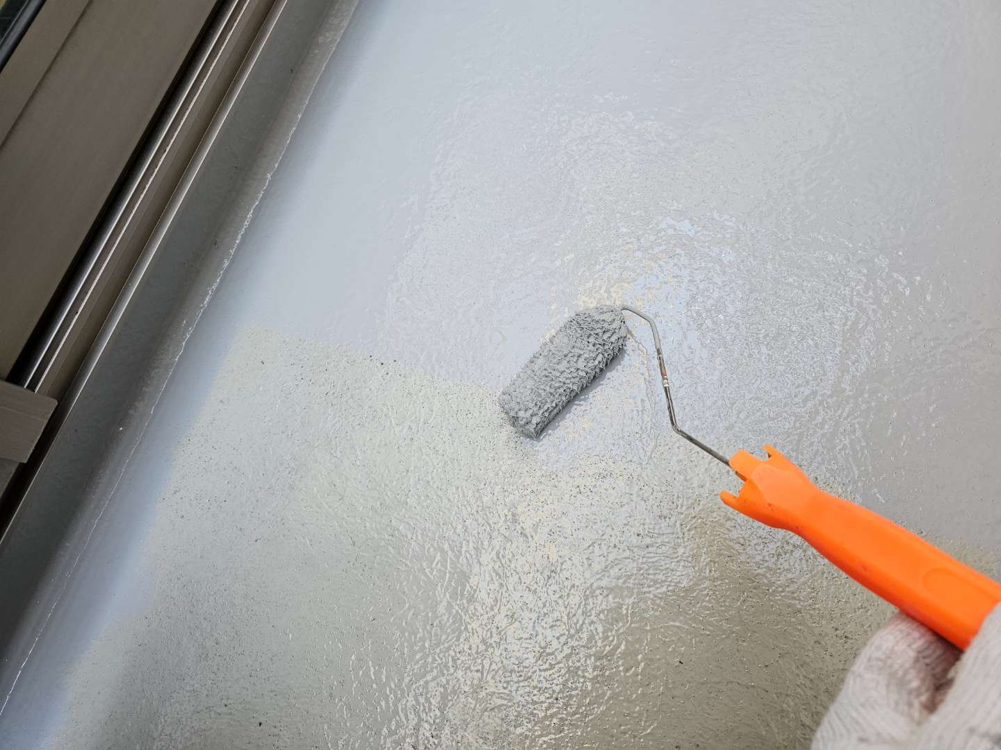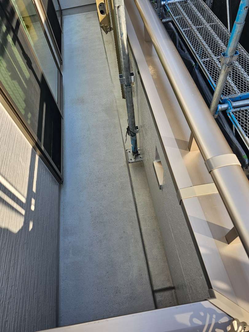 北区F様邸の今日の作業は、ベランダ防水のウレアックス2層目塗装作業とコーキング(シーリング)打替え、増し打ち作業の予定です。