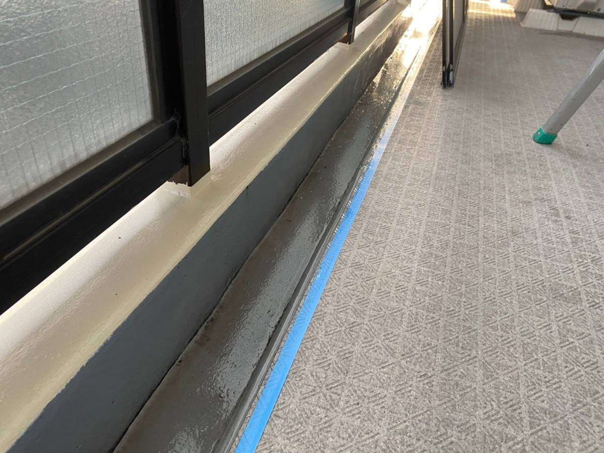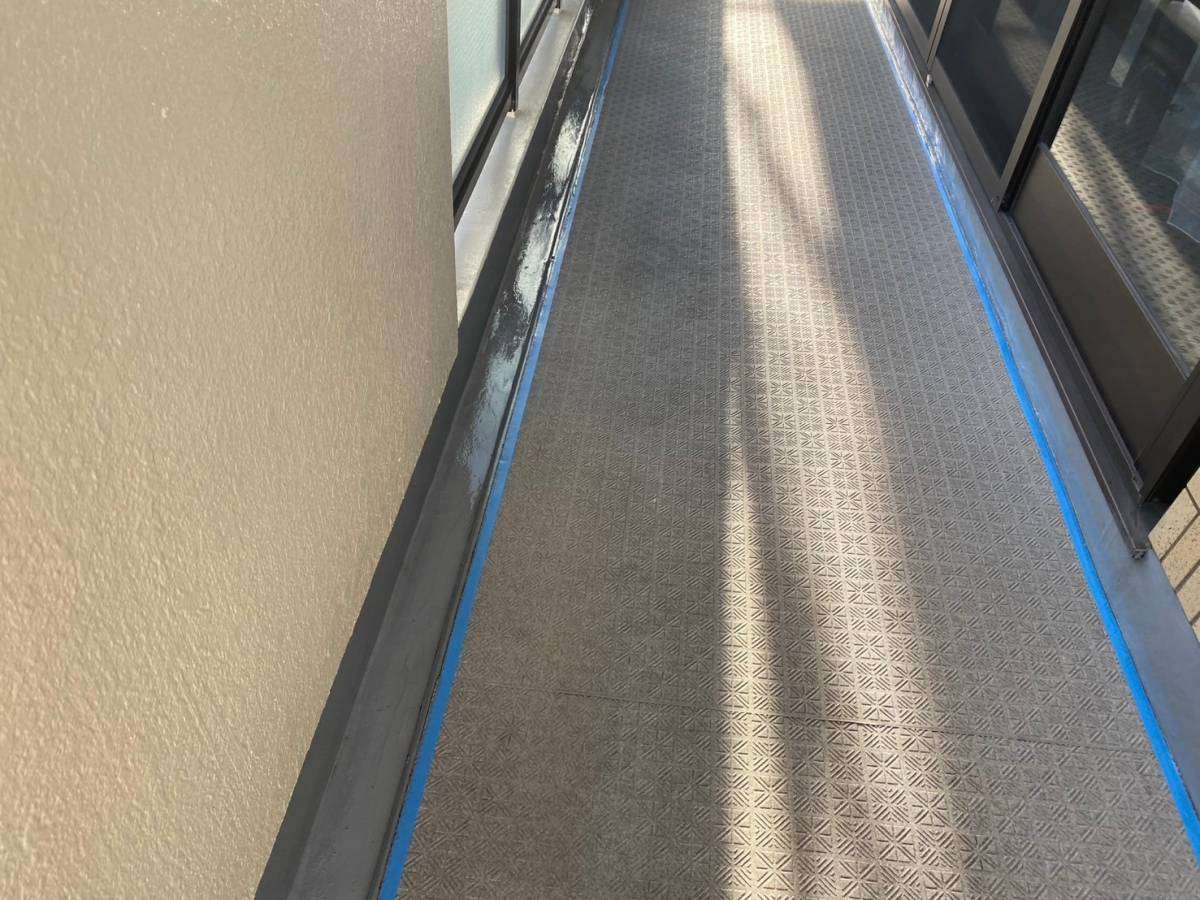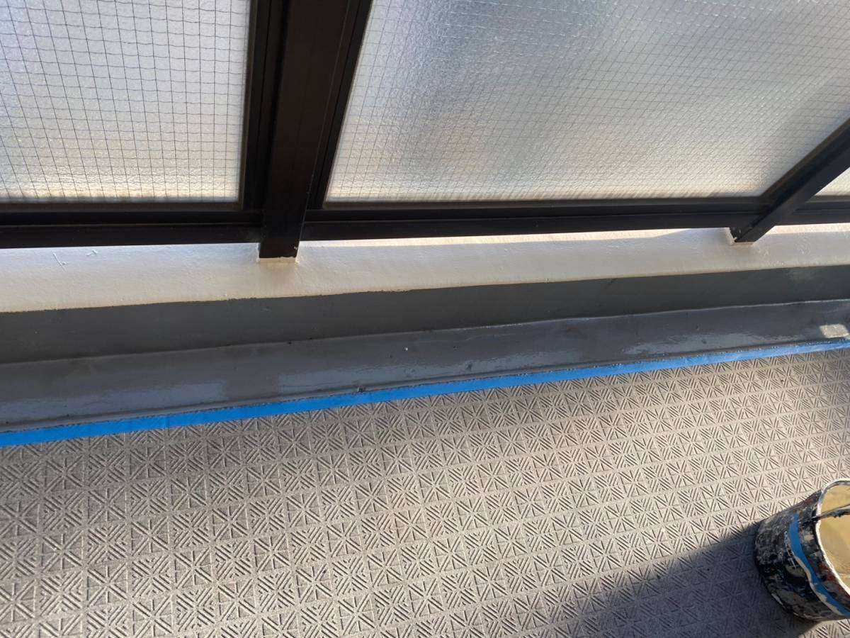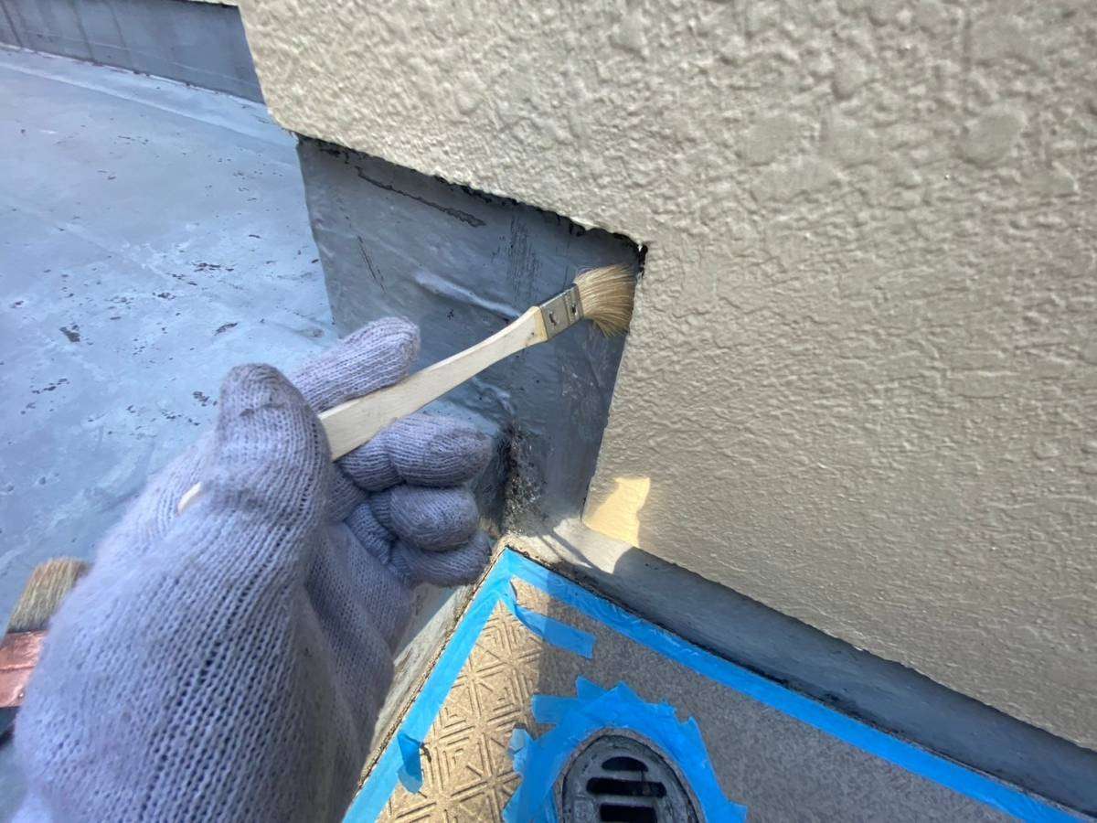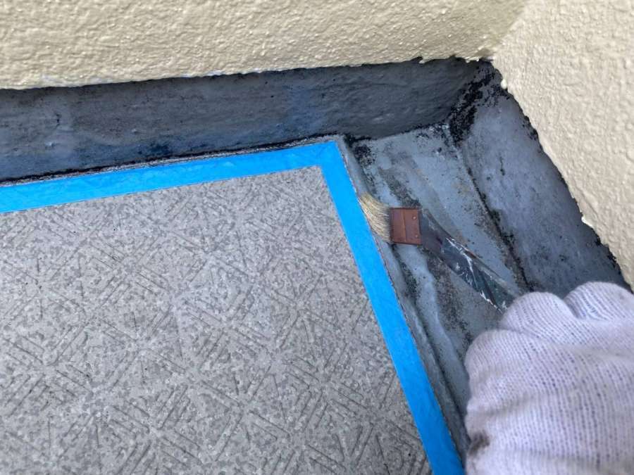 名古屋市名東区、Yマンション様の昨日の作業内容は、前日に続きコーキング(シーリング)作業の旧シーリング材撤去・ベランダの立ち上がり部、側溝部・床のトップコート塗装作業でプライマー塗装を行っていました。