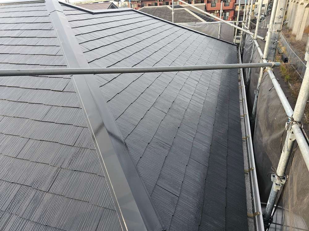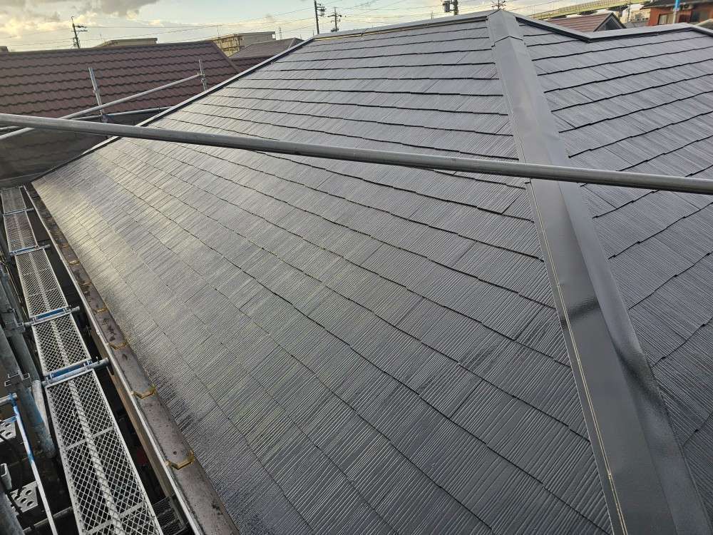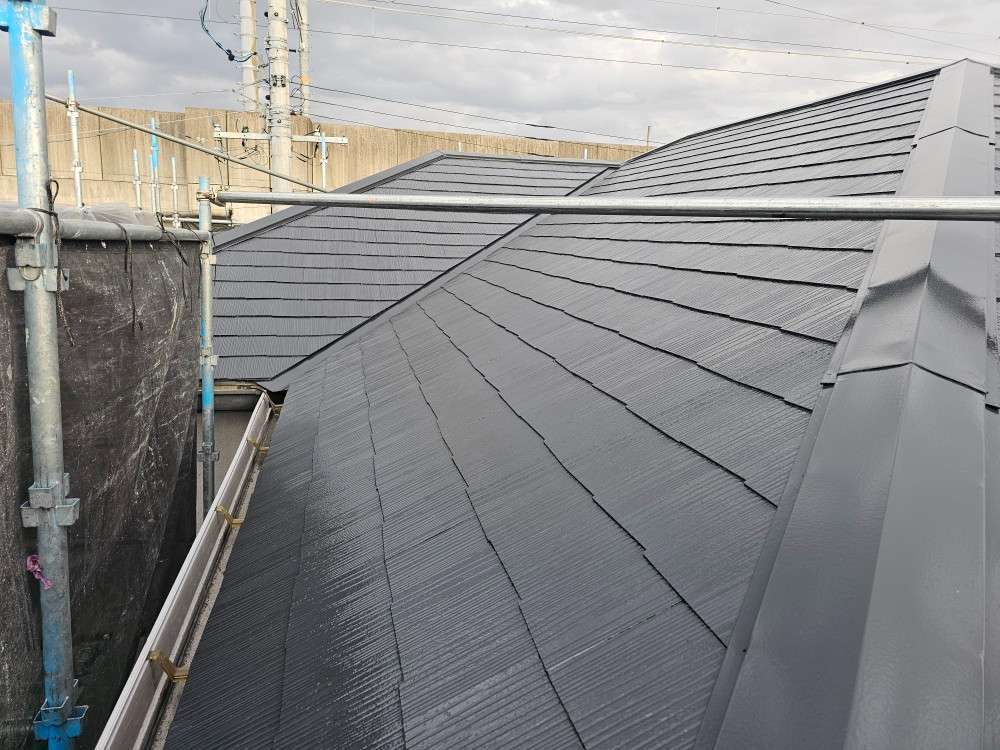 今日の作業は、屋根の上塗り塗装・軒天塗装作業予定です。