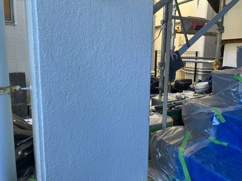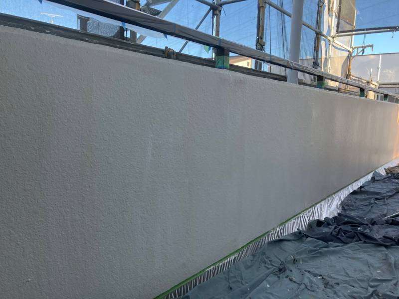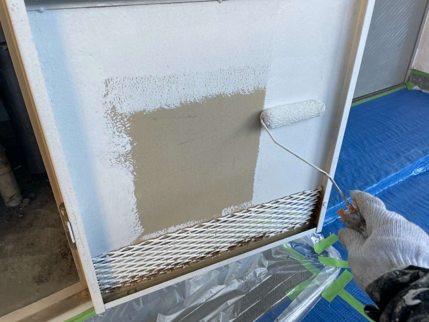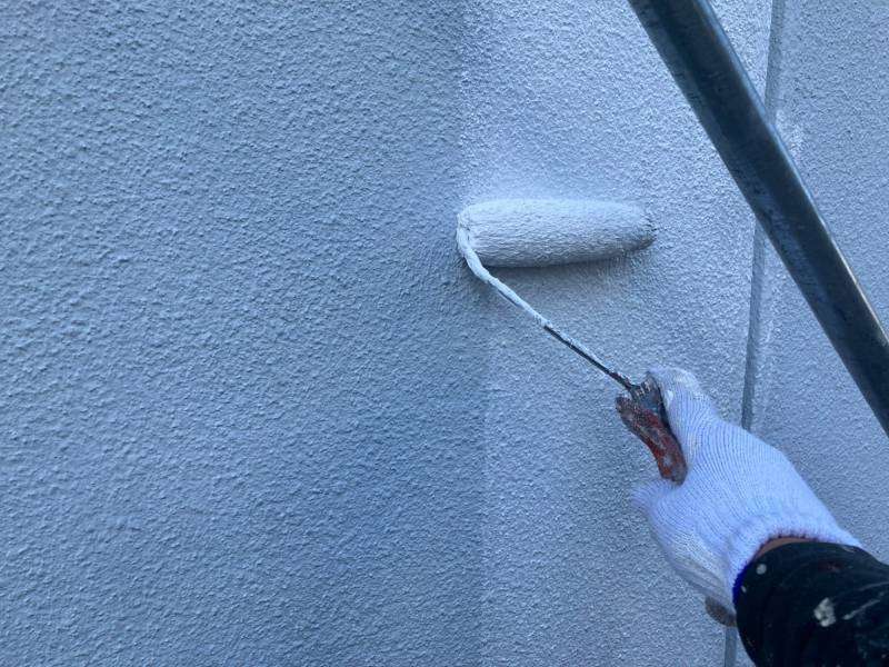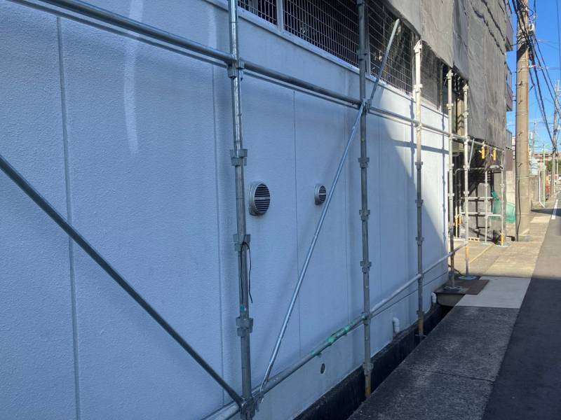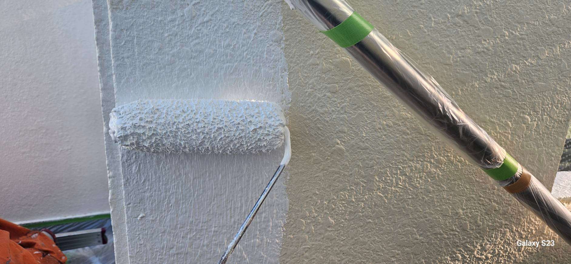 北面の外壁下塗り塗装、北面付帯部のケレン・錆止め塗装、塀の下塗り塗装作業を